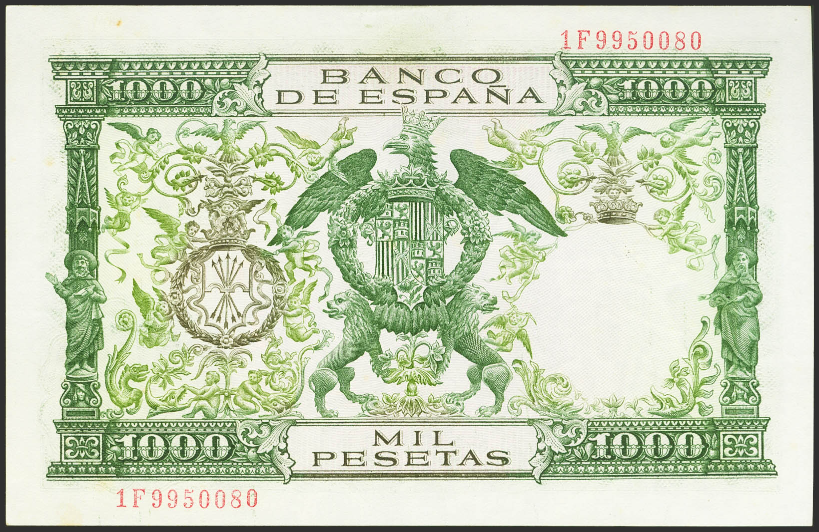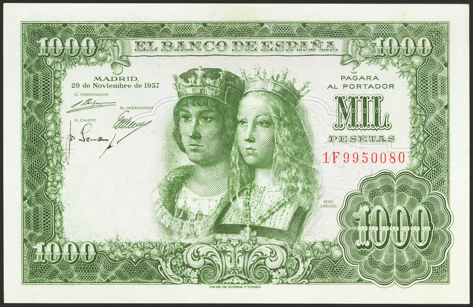 1000 Pesetas. 29 de Noviembre de 1957. Serie 1F. (Edifil 2023: 469b). Conserva todo su apresto original, puntitos de grapa. SC--.