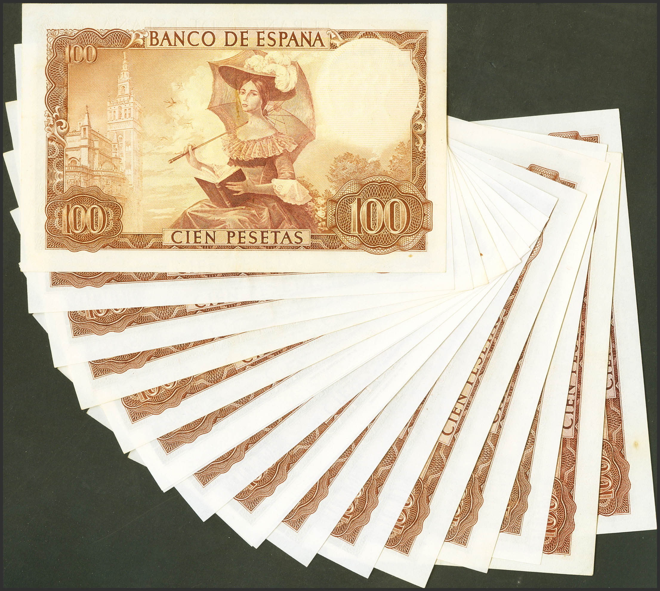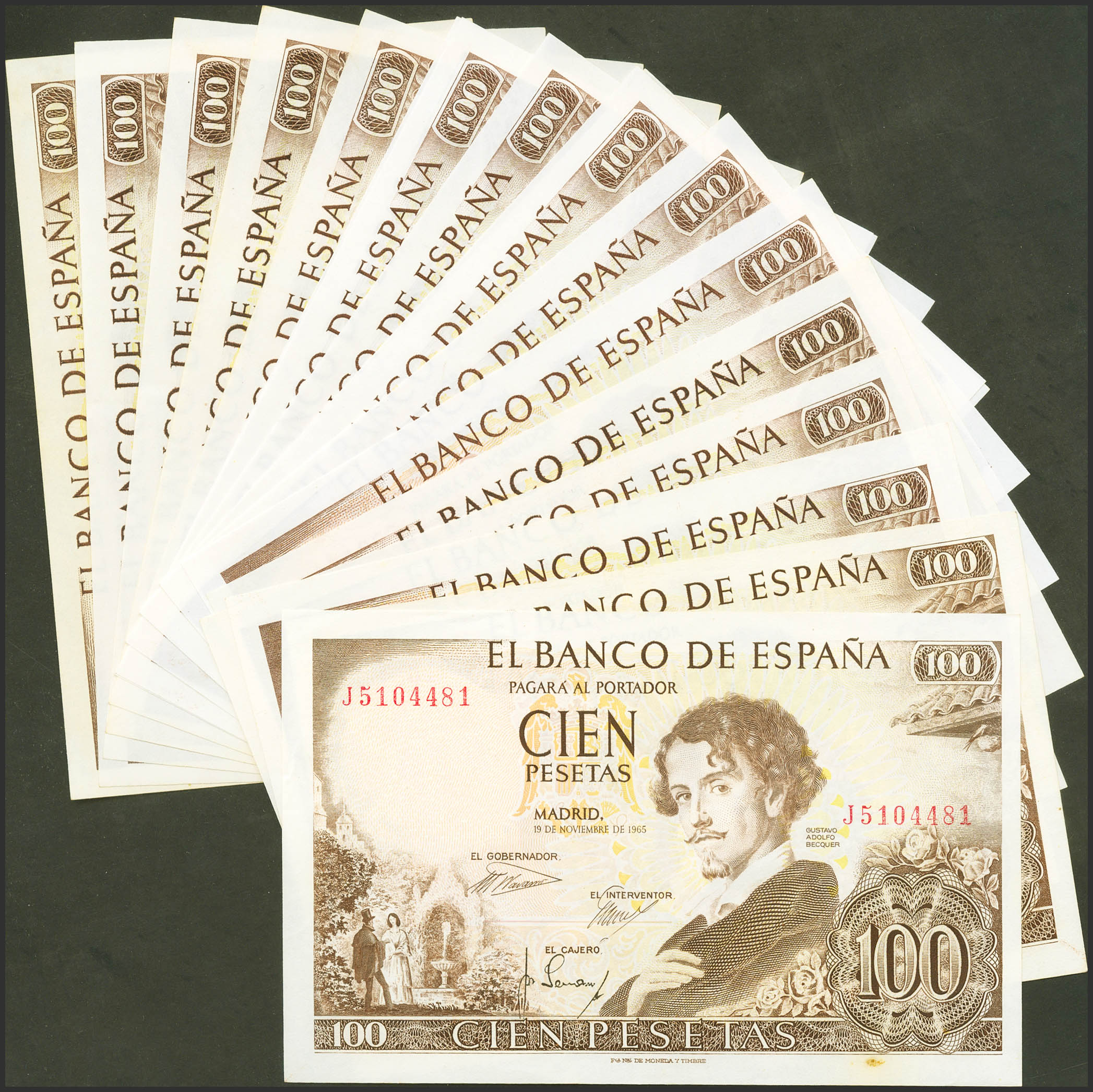 Conjunto de 17 billetes alguno de ellos correlativos entre si de 100 Pesetas, emitidos el 19 de Noviembre de 1965, con las series J, K, 1A, 1C y 1J, respectivamente (Edifil 2023: 470a), conservando su apresto original. EBC+/SC-.