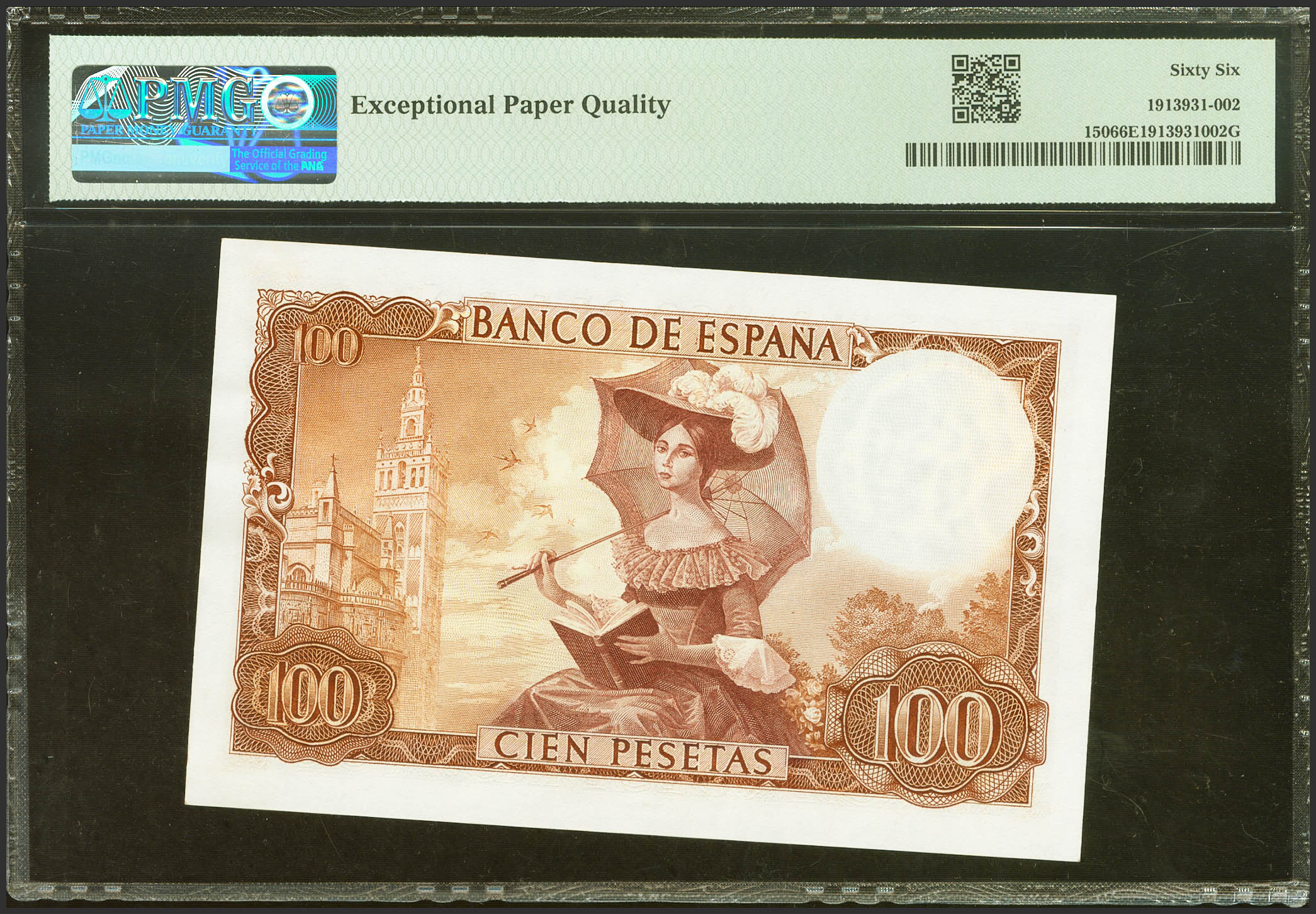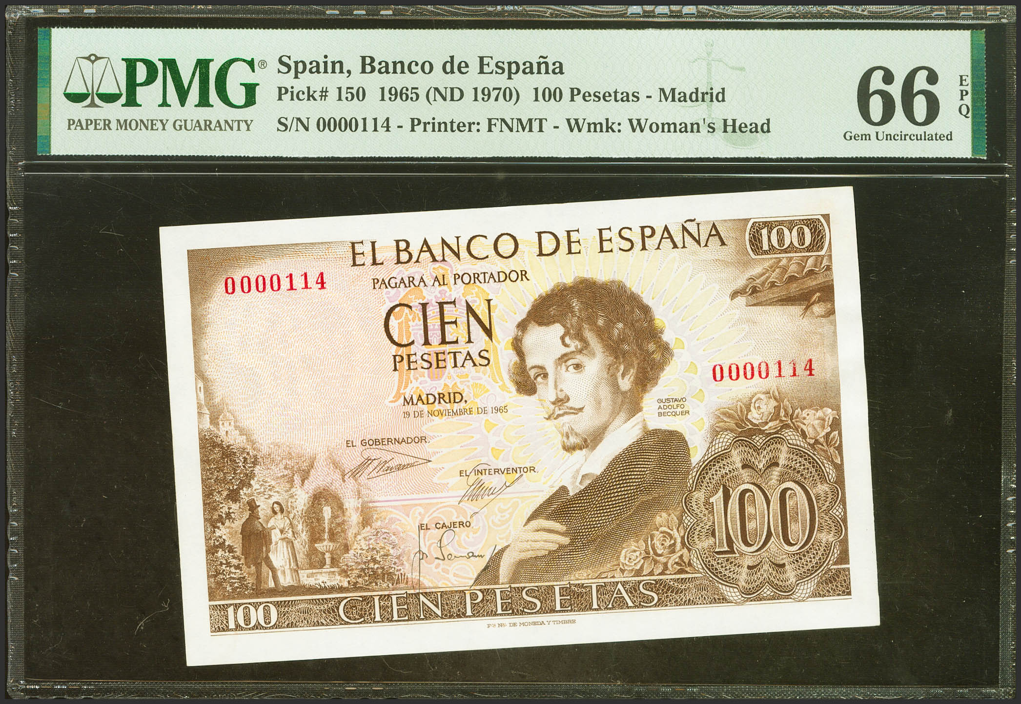 100 Pesetas. 19 de Noviembre de 1965. Sin serie y numeración bajísima (0000114). (Edifil 2021: 470, Pick: 150). Raro, apresto original. SC. Encapsulado PMG66EPQ.