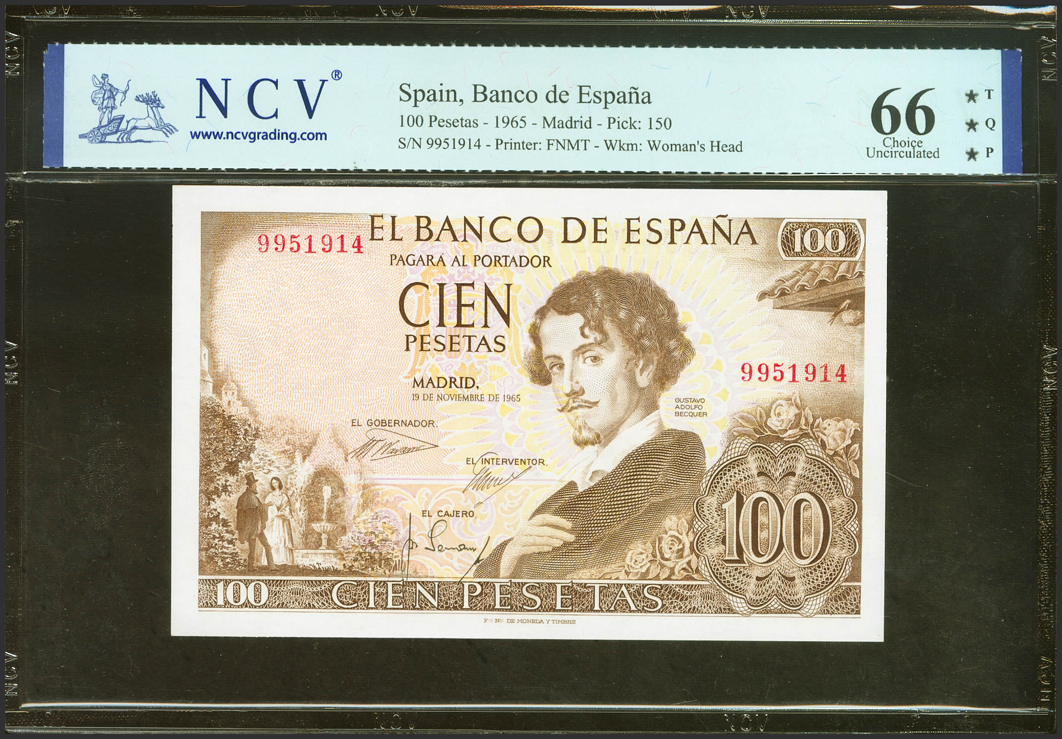 100 Pesetas. 19 de Noviembre de 1965. Sin serie. (Edifil 2023: 470, Pick: 150). Inusual, apresto original. SC. Encapsulado NCV66TQP.