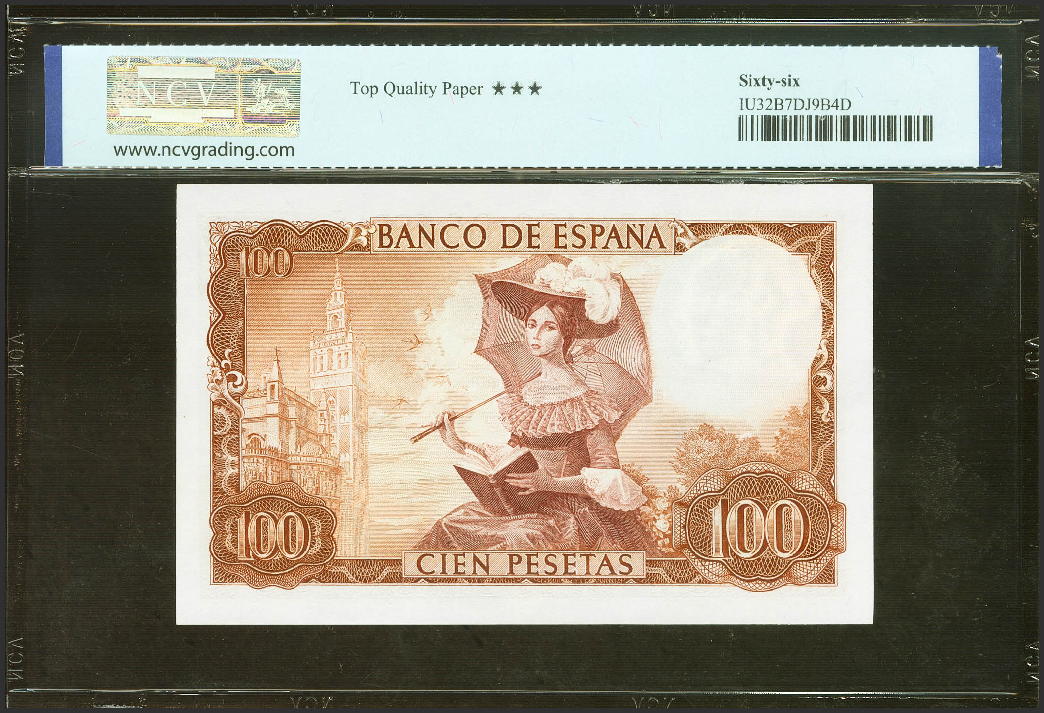 100 Pesetas. 19 de Noviembre de 1965. Sin serie. (Edifil 2023: 470, Pick: 150). Inusual, apresto original. SC. Encapsulado NCV66TQP.