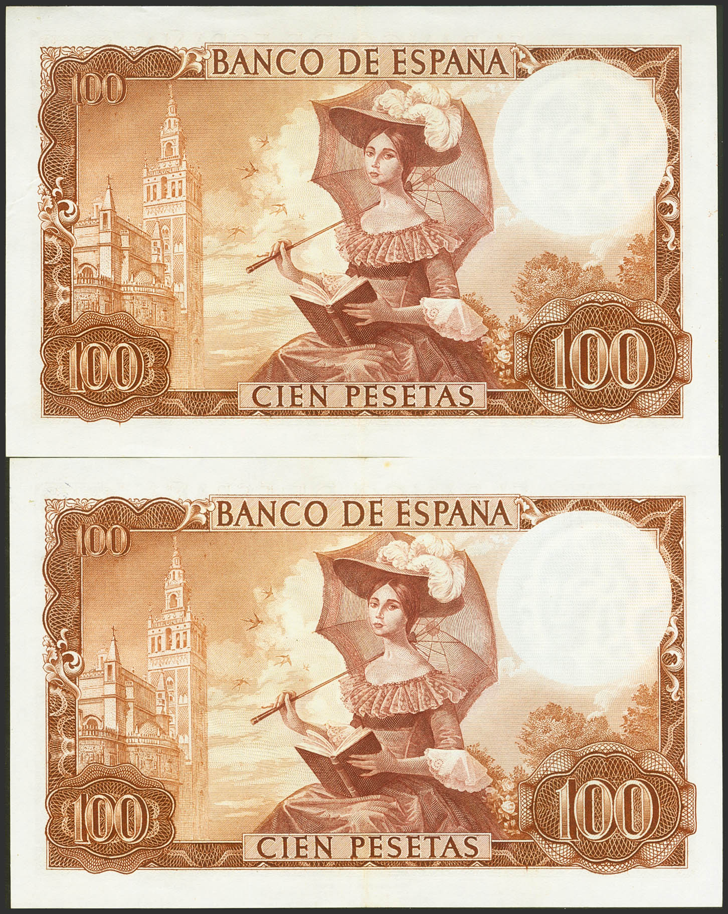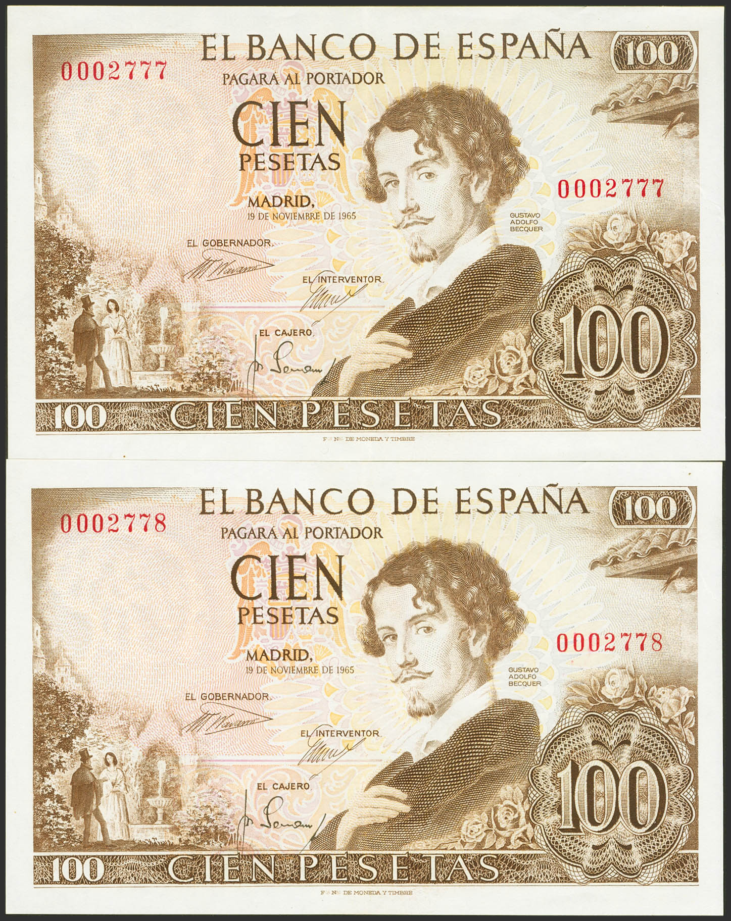 100 Pesetas. 19 de Noviembre de 1965. Pareja correlativa. Sin serie y numeración bajísima (0002778/77). (Edifil 2021: 470). Conserva parte de su apresto original. EBC++.
