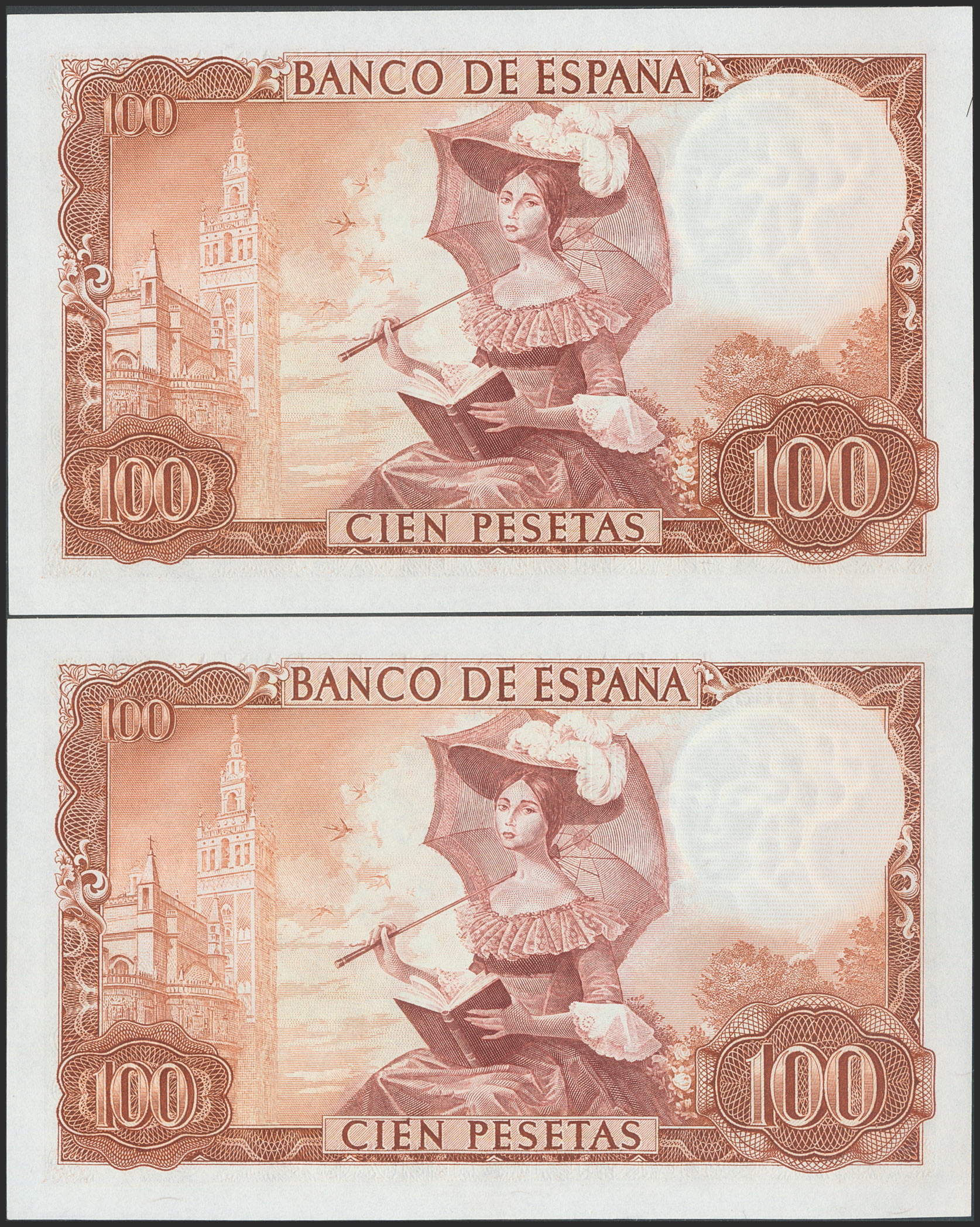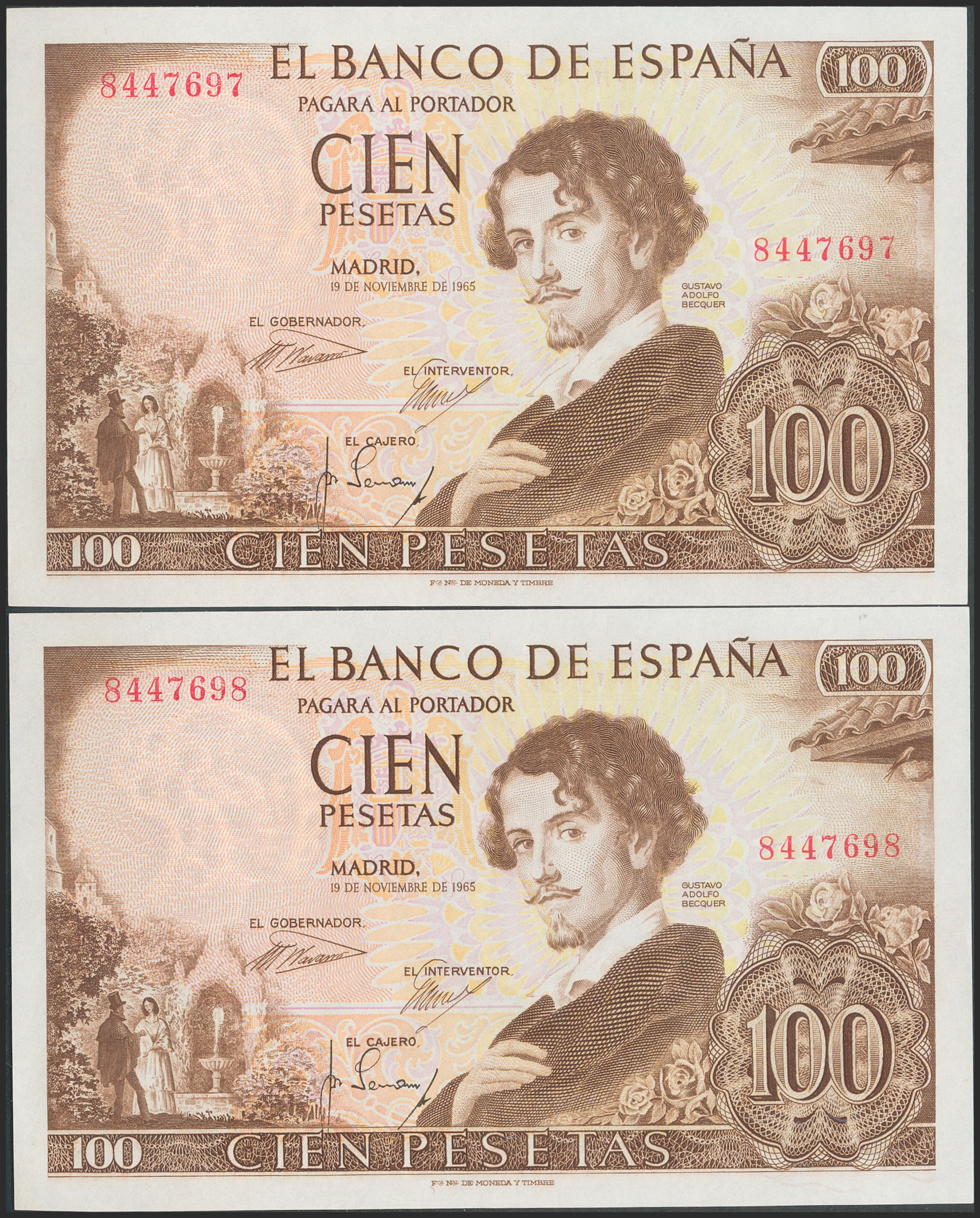 100 Pesetas. 19 de Noviembre de 1965. Pareja correlativa. Sin serie. (Edifil 2017: 470). Apresto original. SC.