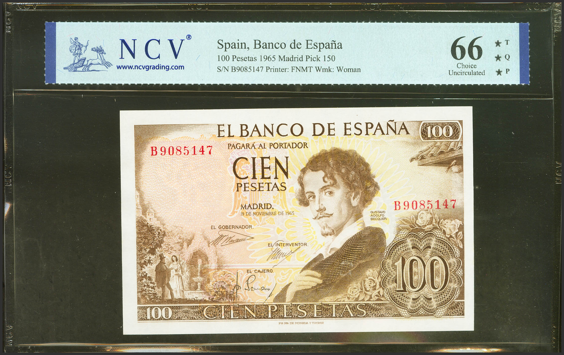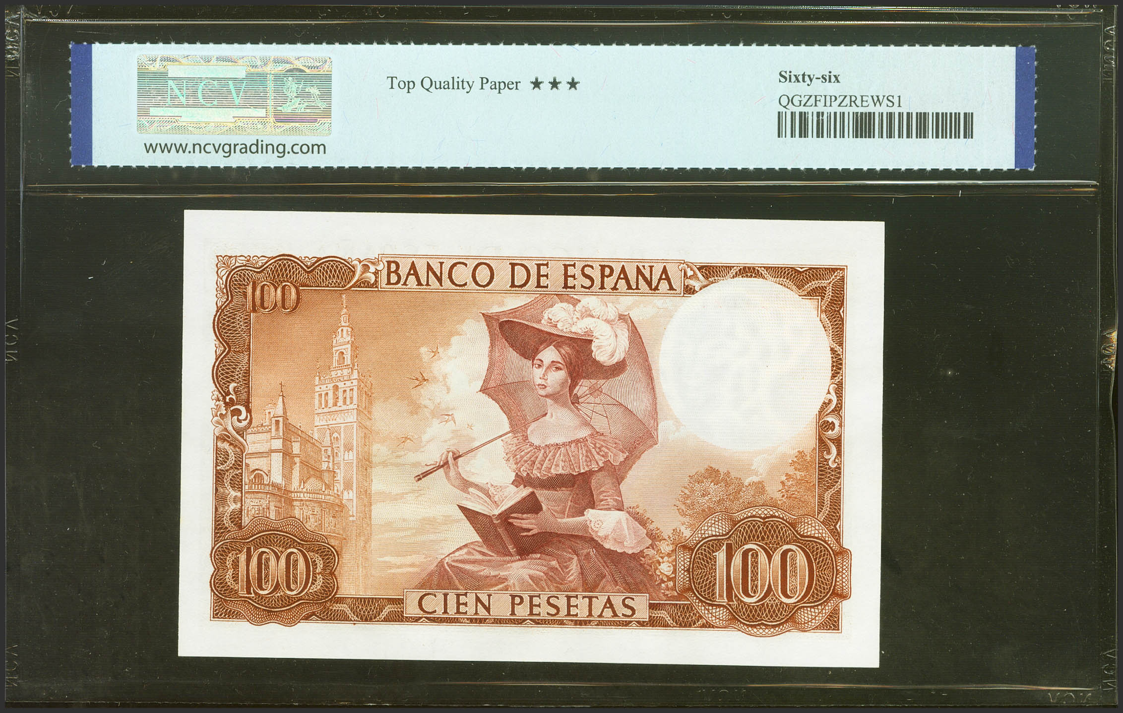 100 Pesetas. 19 de Noviembre de 1965. Serie B. (Edifil 2021: 470a, Pick: 150). Raro en esta excepcional calidad, apresto original. Encapsulado NCV66TQP.