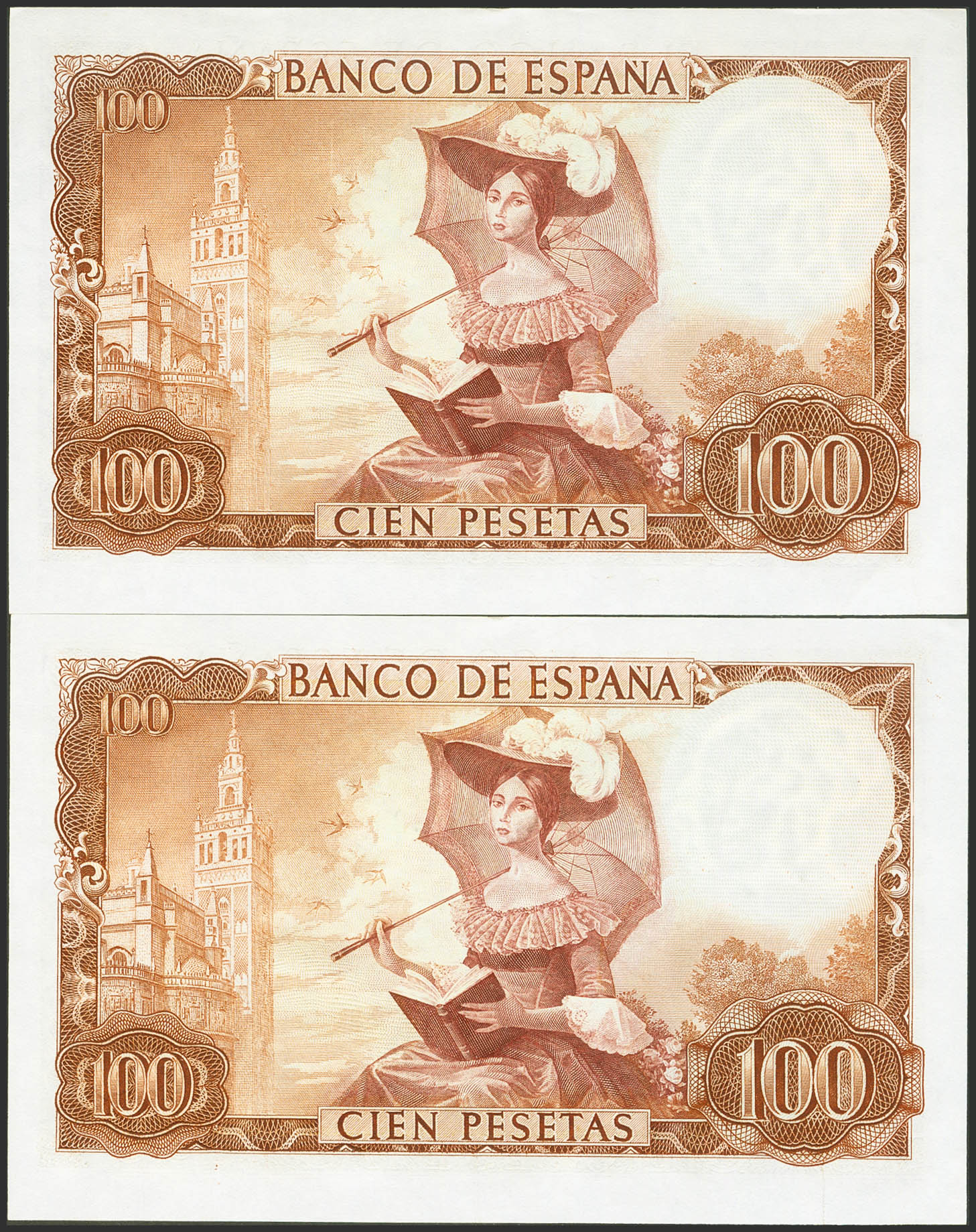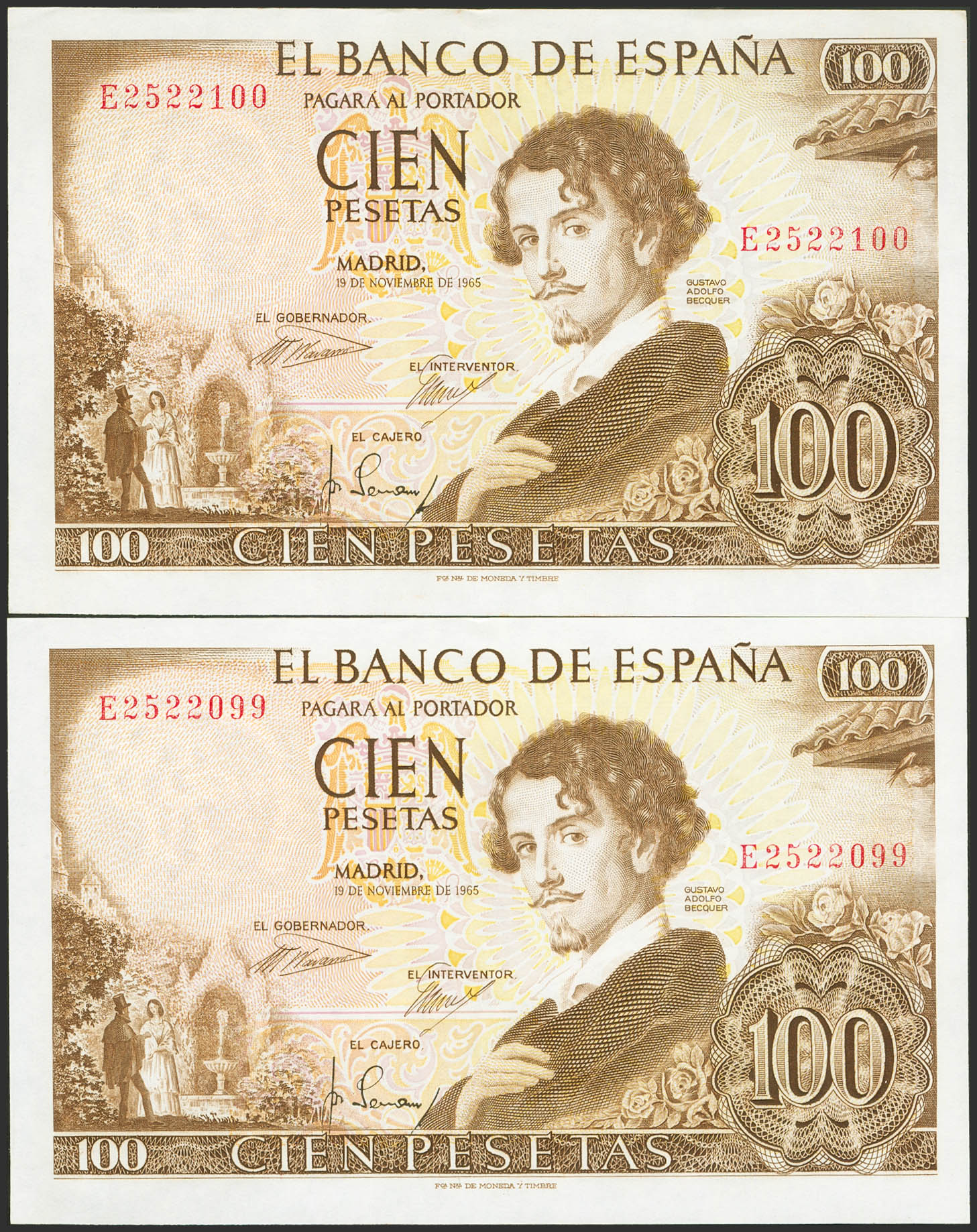 100 Pesetas. 19 de Noviembre de 1965. Pareja correlativa. Serie E. (Edifil 2021: 470a). Conserva todo su apresto original. SC-.