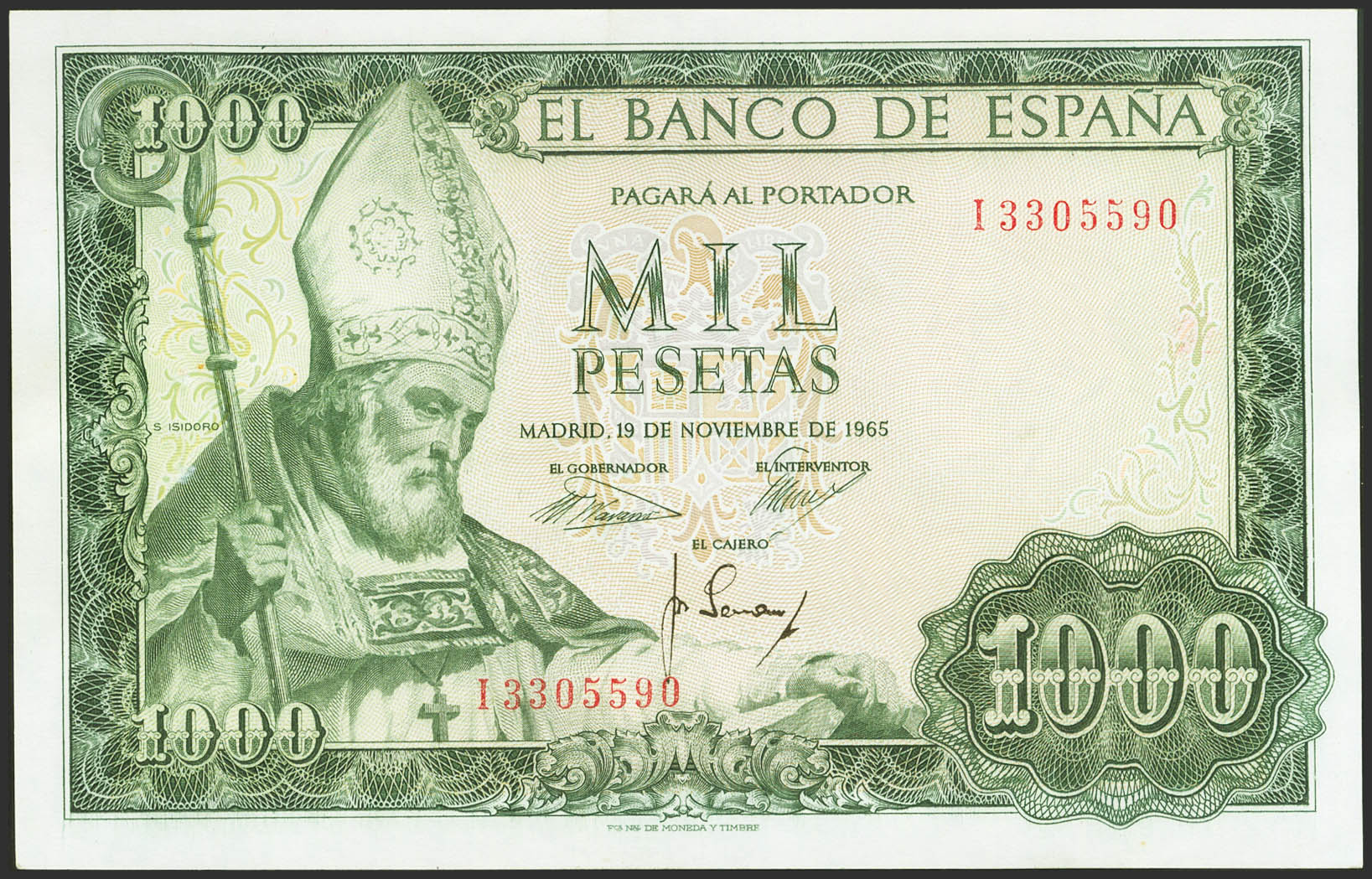 1000 Pesetas. 19 de Noviembre de 1965. Serie I. (Edifil 2021: 471b). Conserva todo su apresto original. SC-.