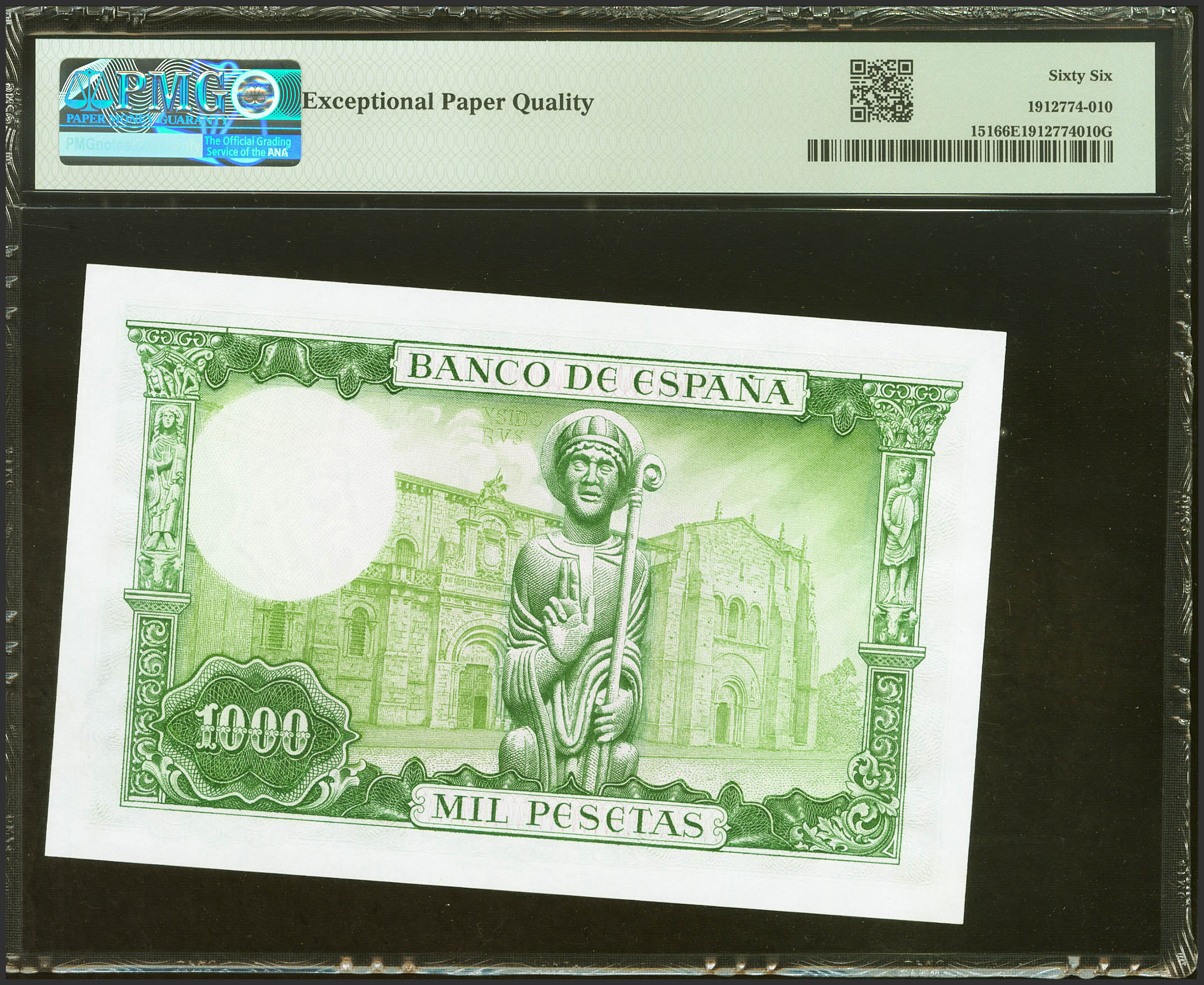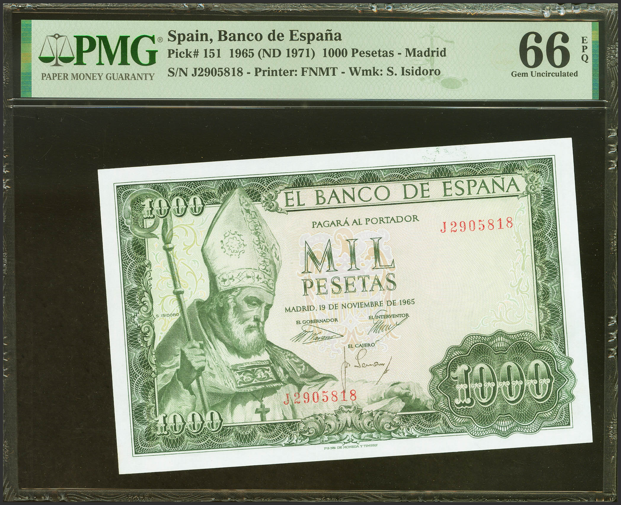1000 Pesetas. 19 de Noviembre de 1965. Serie J. (Edifil 2021: 471b, Pick: 151). Muy raro en esta excepcional calidad, apresto original. SC. Encapsulado PMG66EPQ.