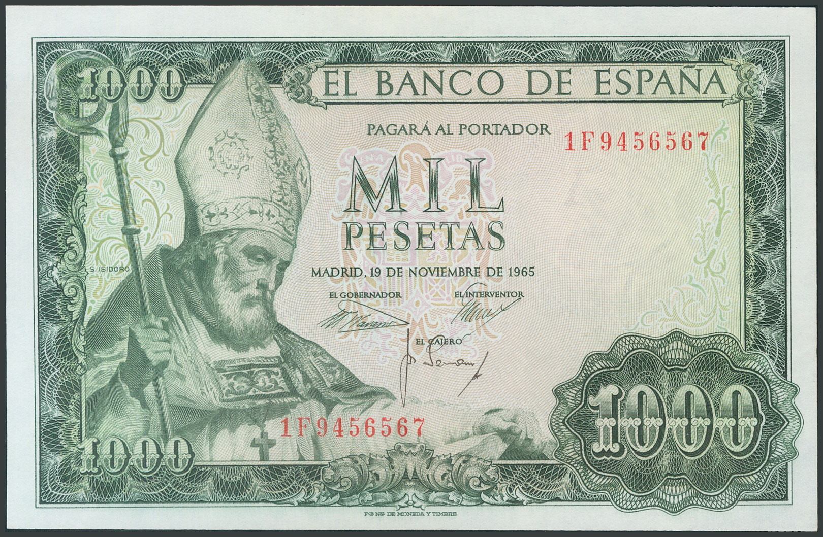 1000 Pesetas. 19 de Noviembre de 1965. Serie 1F. (Edifil 2017: 471b). Apresto original. SC-.