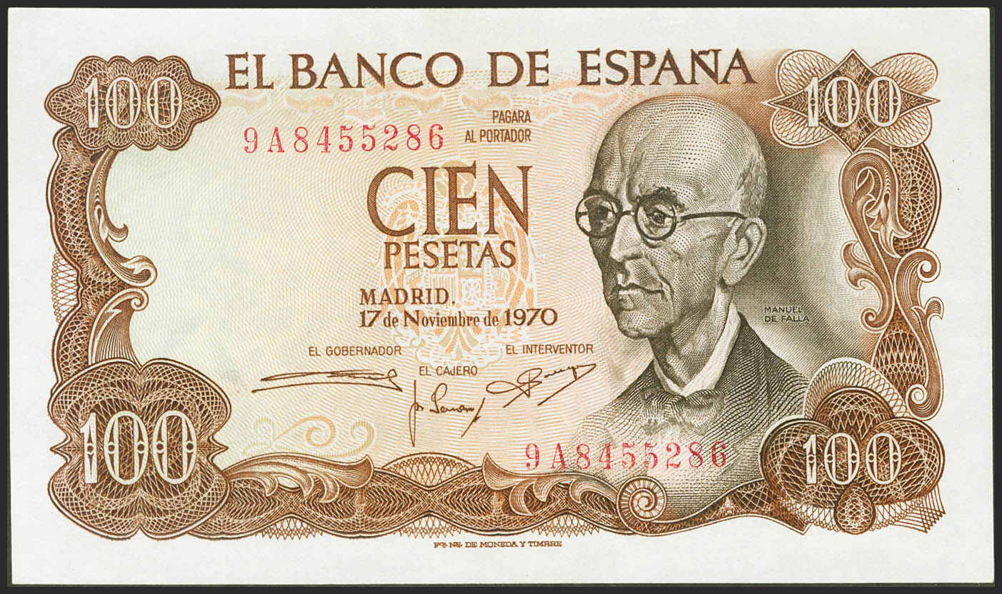 100 Pesetas. 17 de Noviembre de 1970. Serie especial 9A. (Edifil 2021: 472d). Apresto original. SC-.