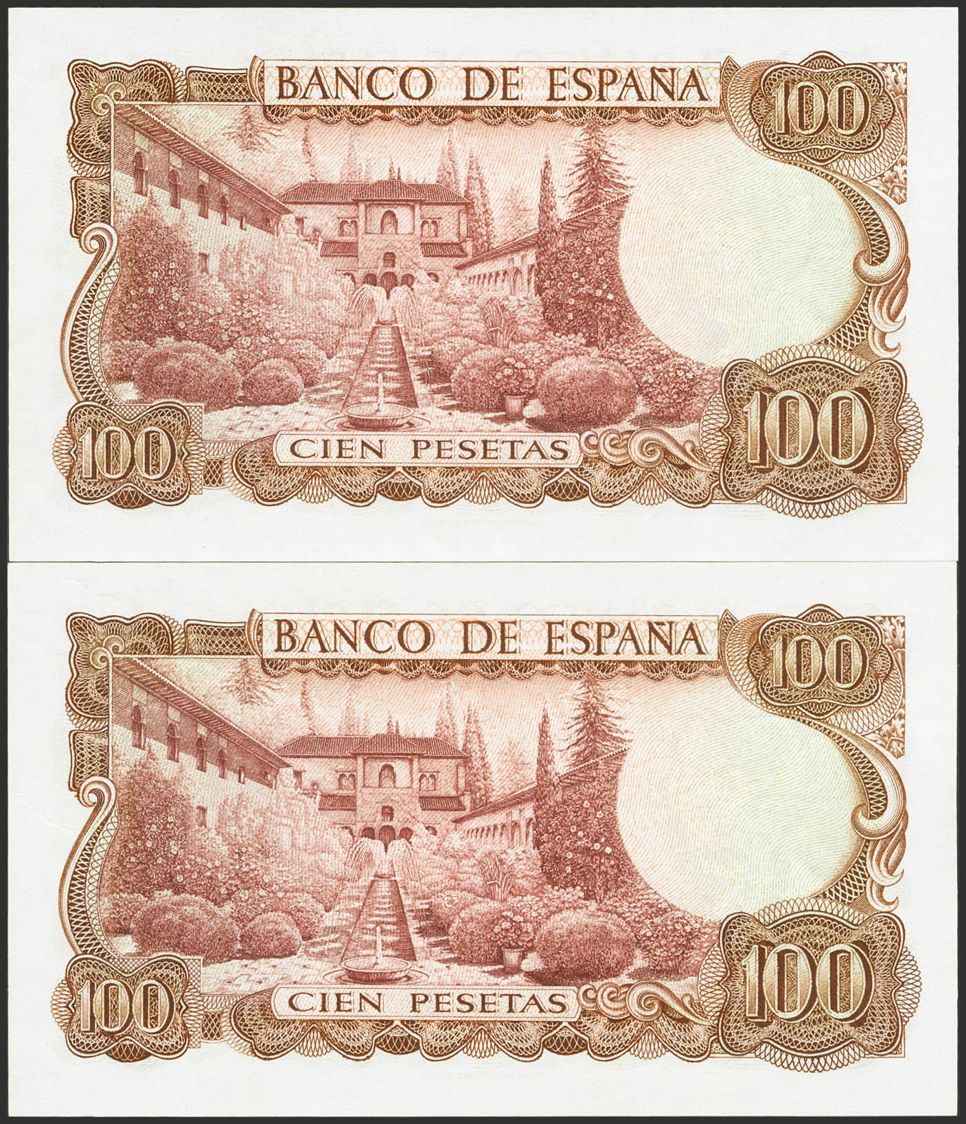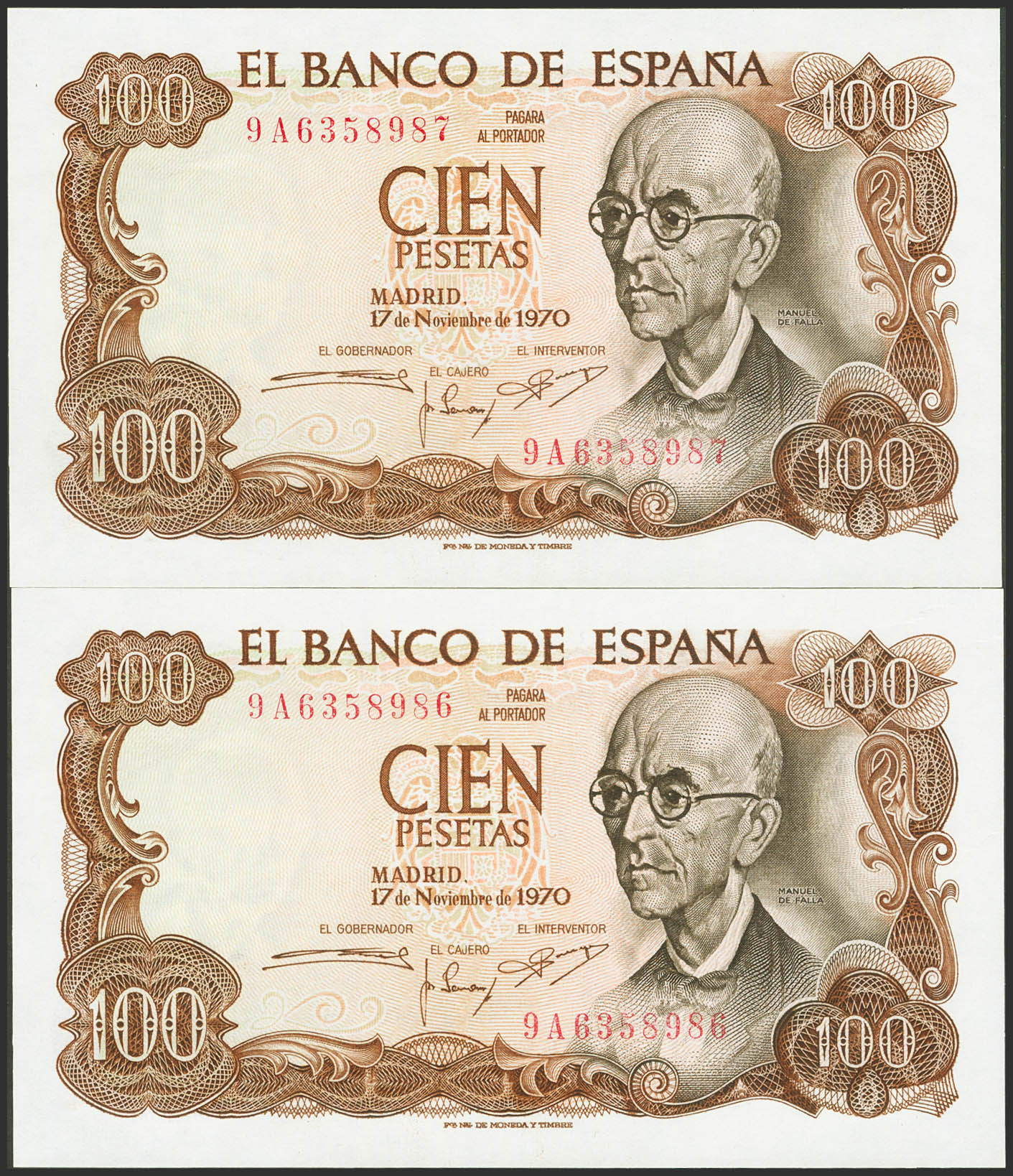 100 Pesetas. 17 de Noviembre de 1970. Pareja correlativa. Serie especial 9A. (Edifil 2021: 472d). Conserva todo su apresto original. SC.