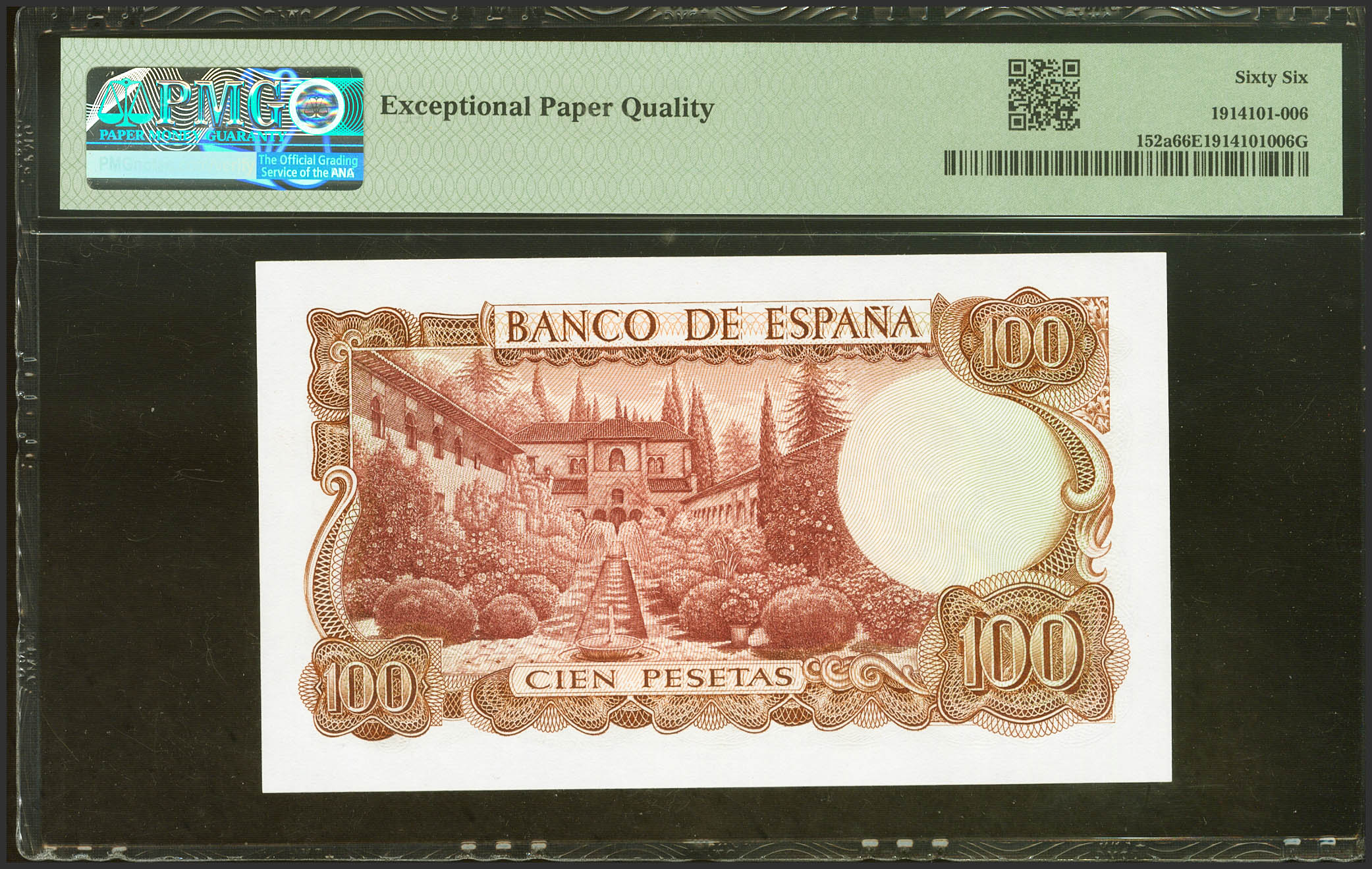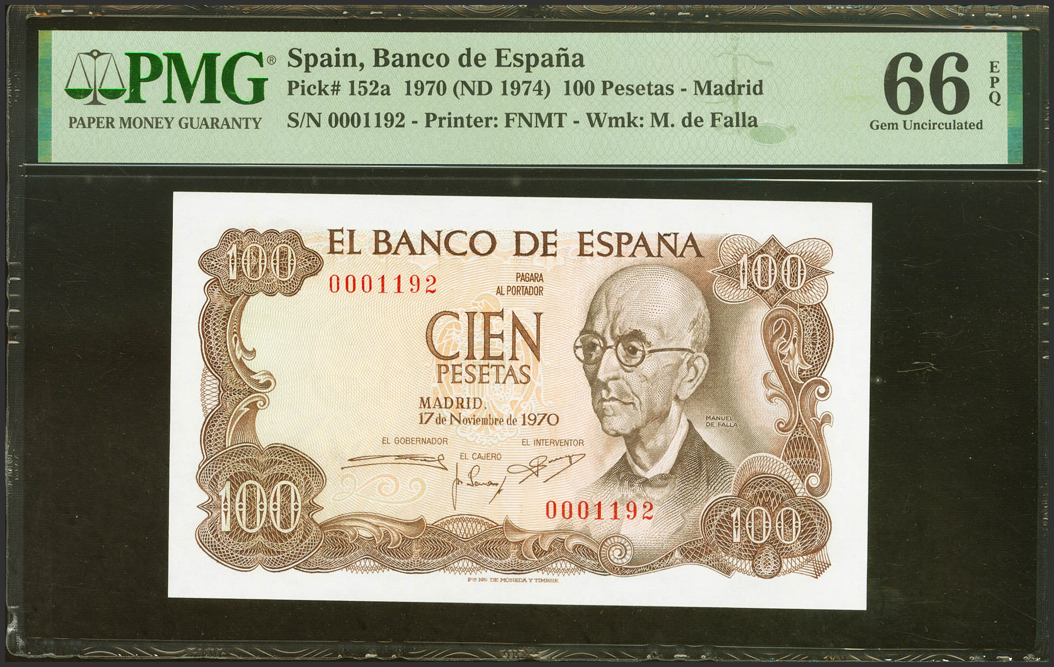 100 Pesetas. 17 de Noviembre de 1970. Sin serie y numeración bajísima. (Edifil 2021: 472, Pick: 152a). Raro, apresto original. SC. Encapsulado PMG66EPQ.