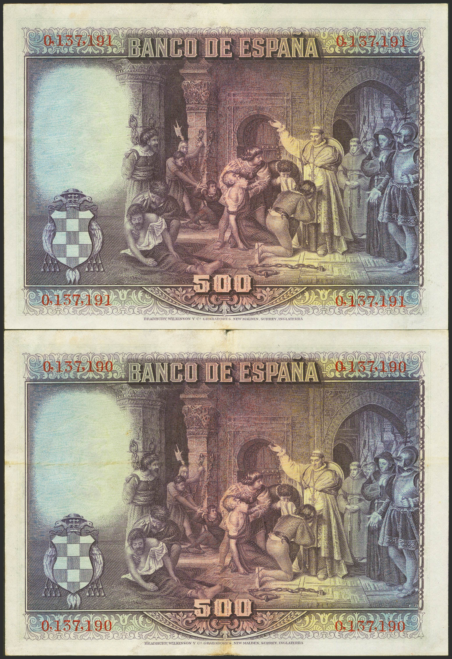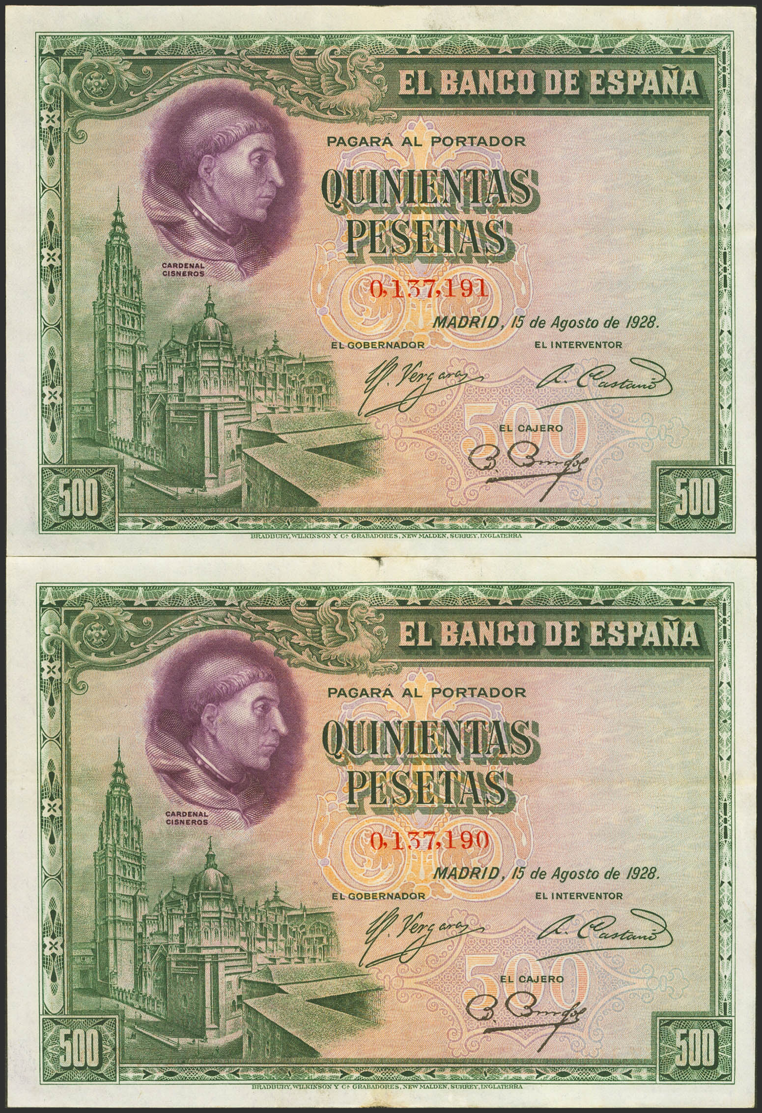 500 Pesetas. 15 de Agosto de 1928. Pareja correlativa. Sin serie. (Edifil 2023: 356). Conserva parte de su apresto original. EBC-/MBC.