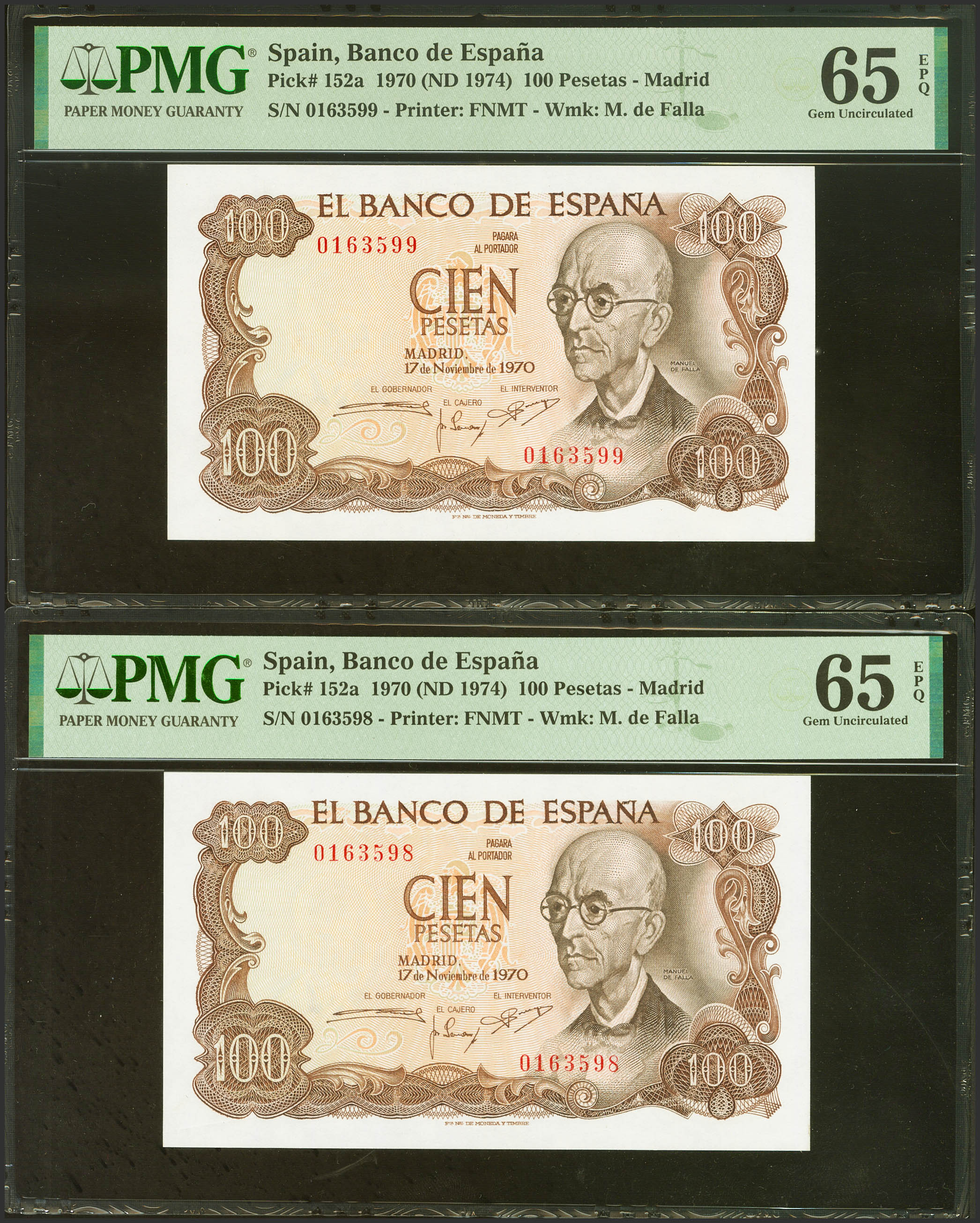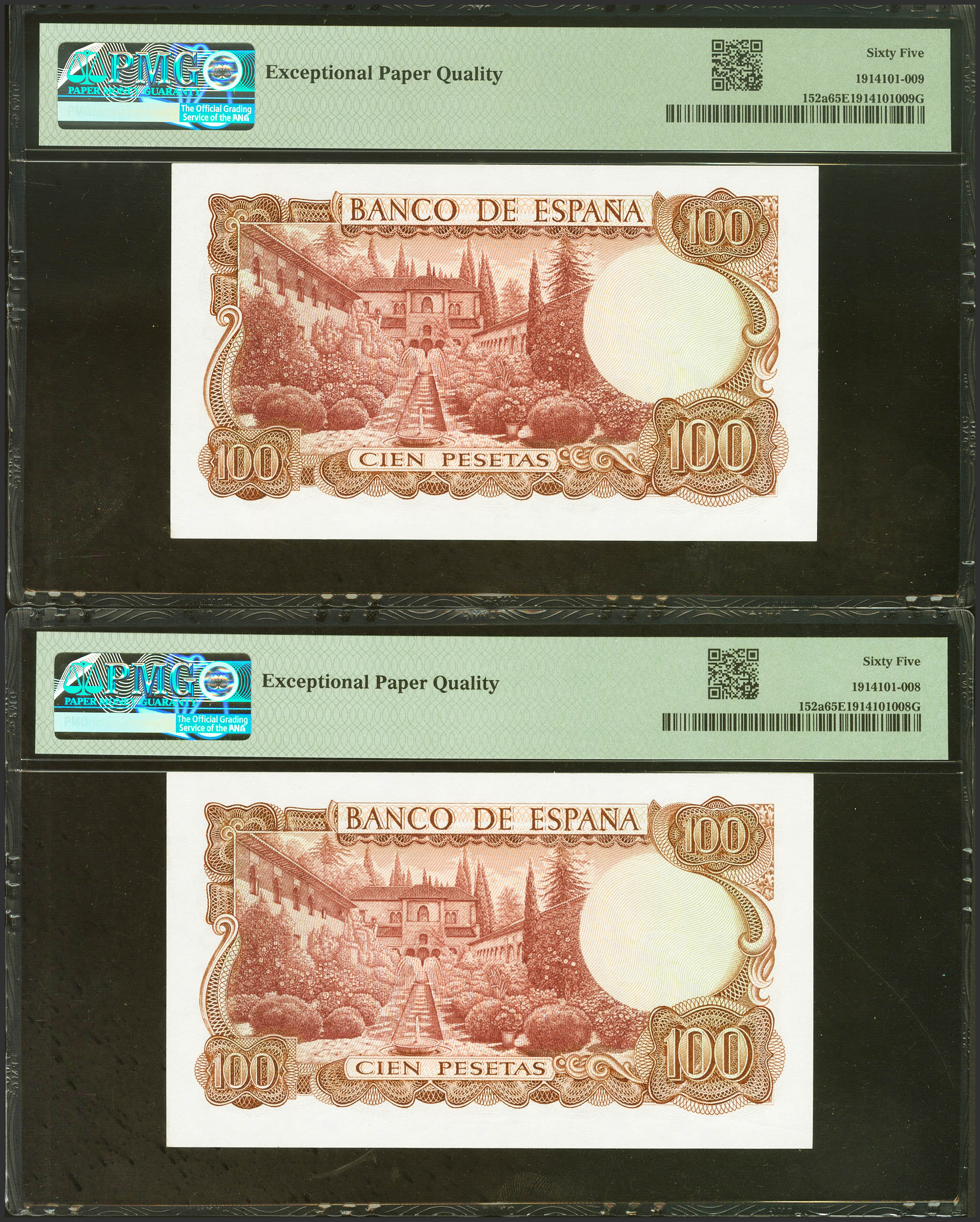 100 Pesetas. 17 de Noviembre de 1970. Pareja correlativa. Sin serie. (Edifil 2021: 472, Pick: 152a). Apresto original. SC. Encapsulados PMG65EPQ, ambos.