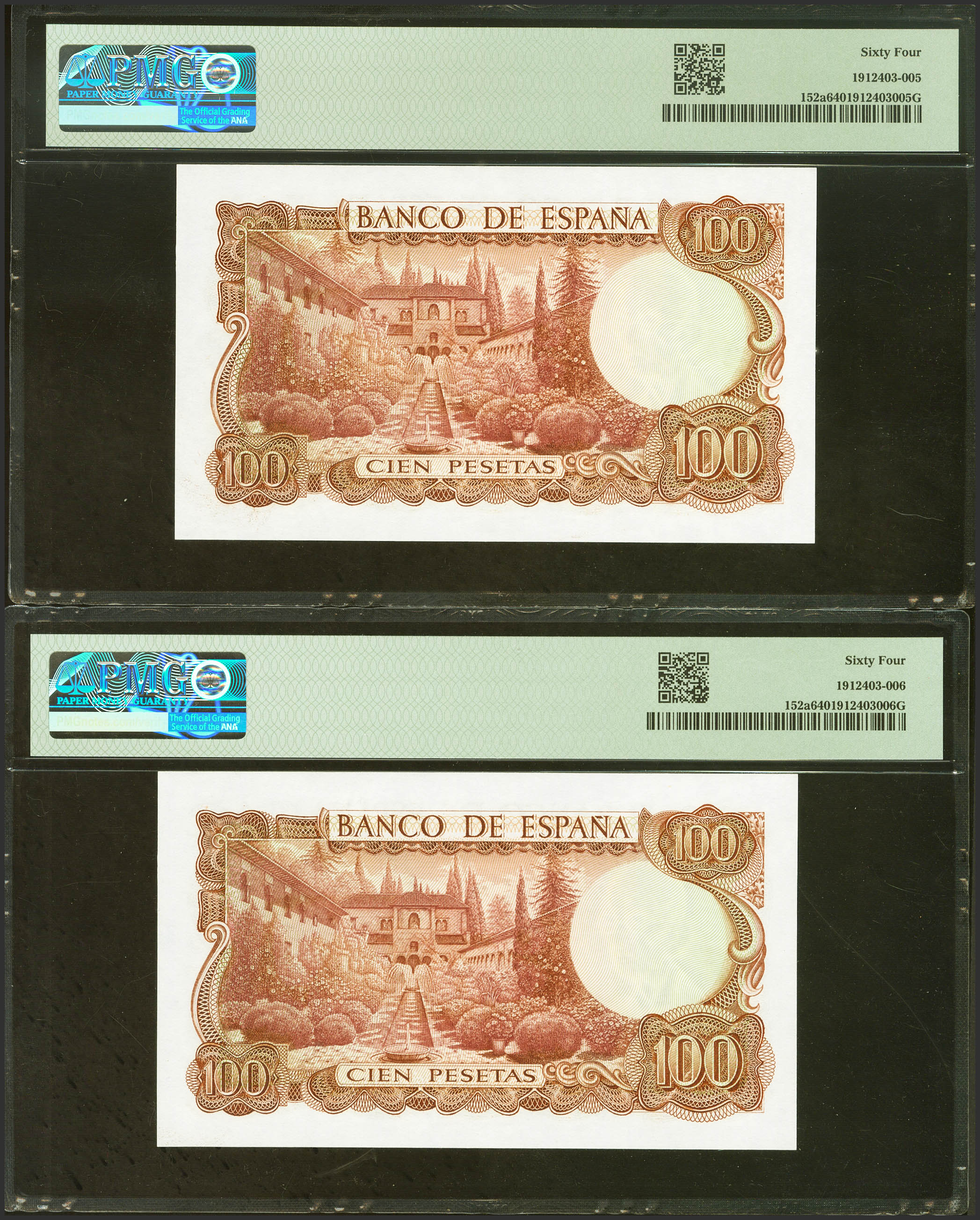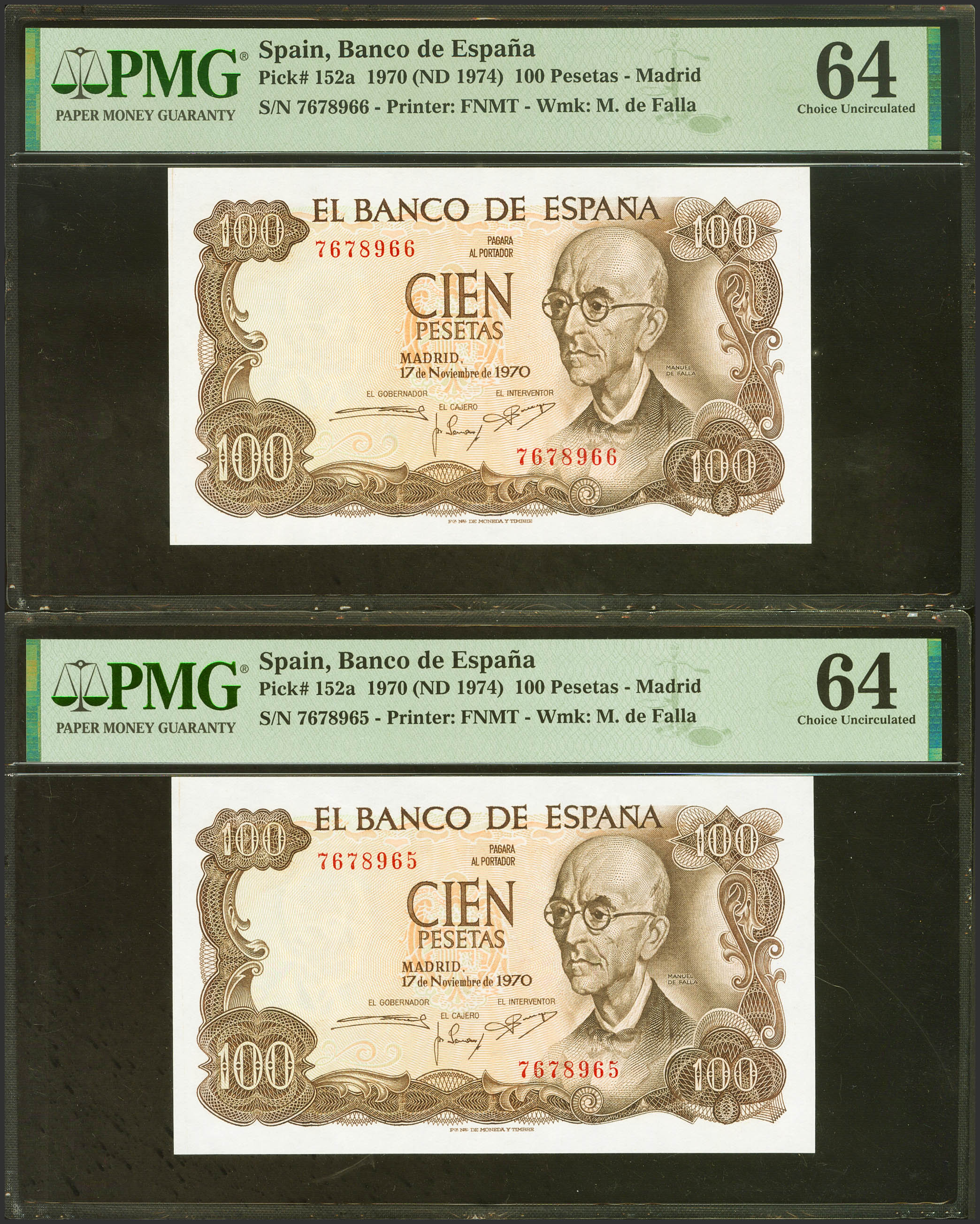 100 Pesetas. 17 de Noviembre de 1970. Pareja correlativa. Sin serie. (Edifil 2023: 472, Pick: 152a). SC. Encapsulados PMG64, ambos.