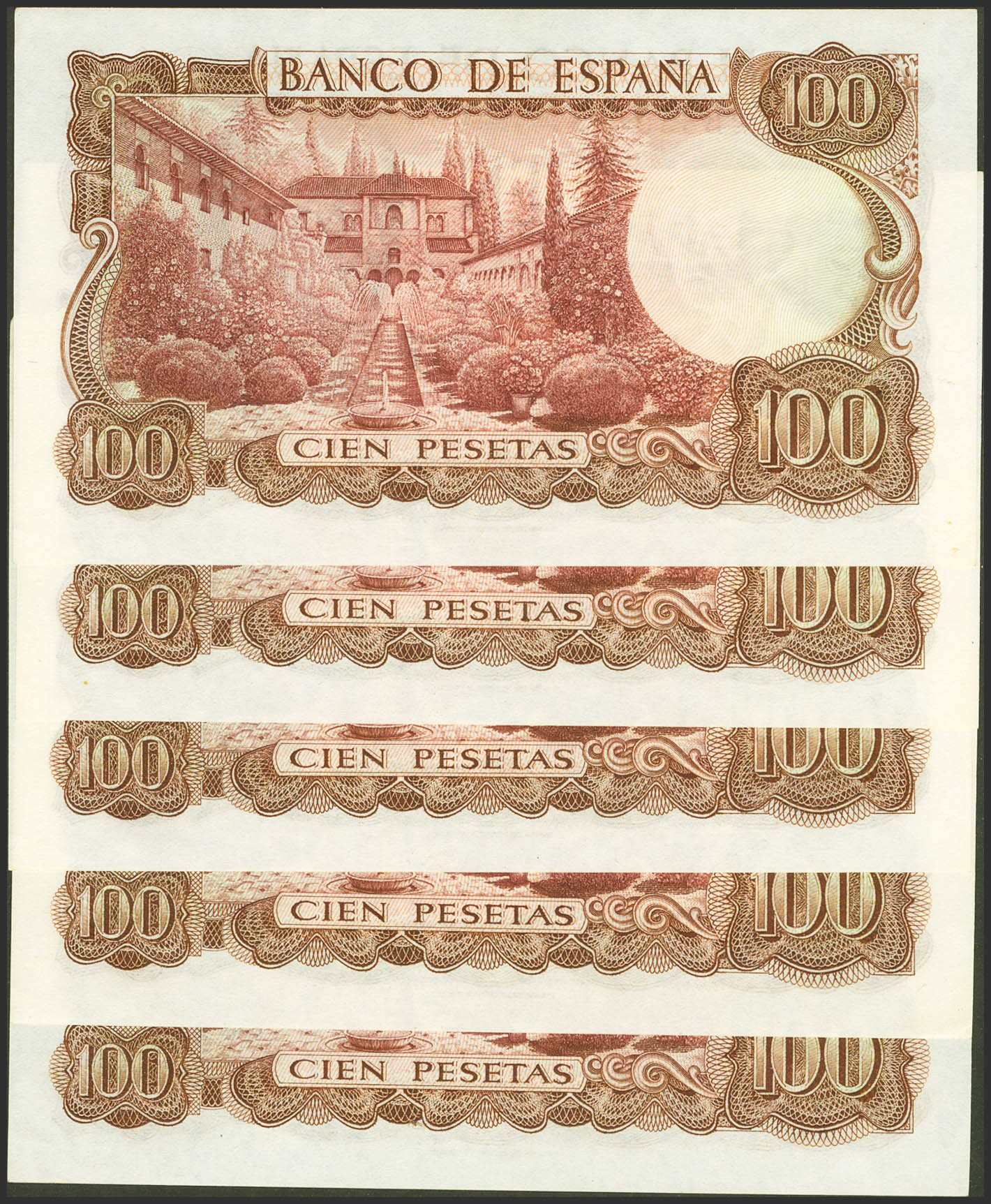 Conjunto de 5 billetes correlativos de 100 Pesetas, emitidos el 17 de Noviembre de 1970, con la serie 2B (Edifil 2023: 472c), con su apresto original. SC--.