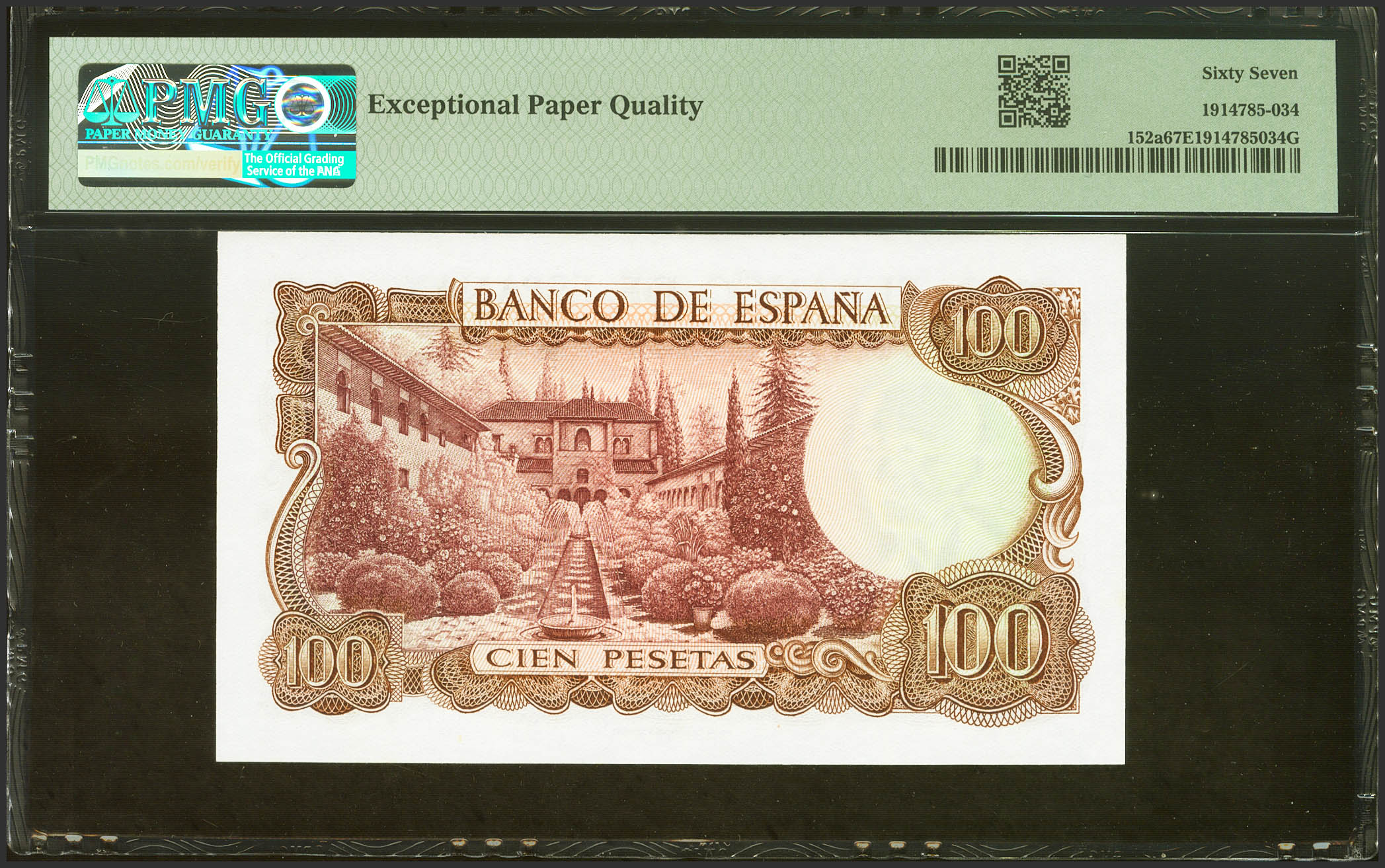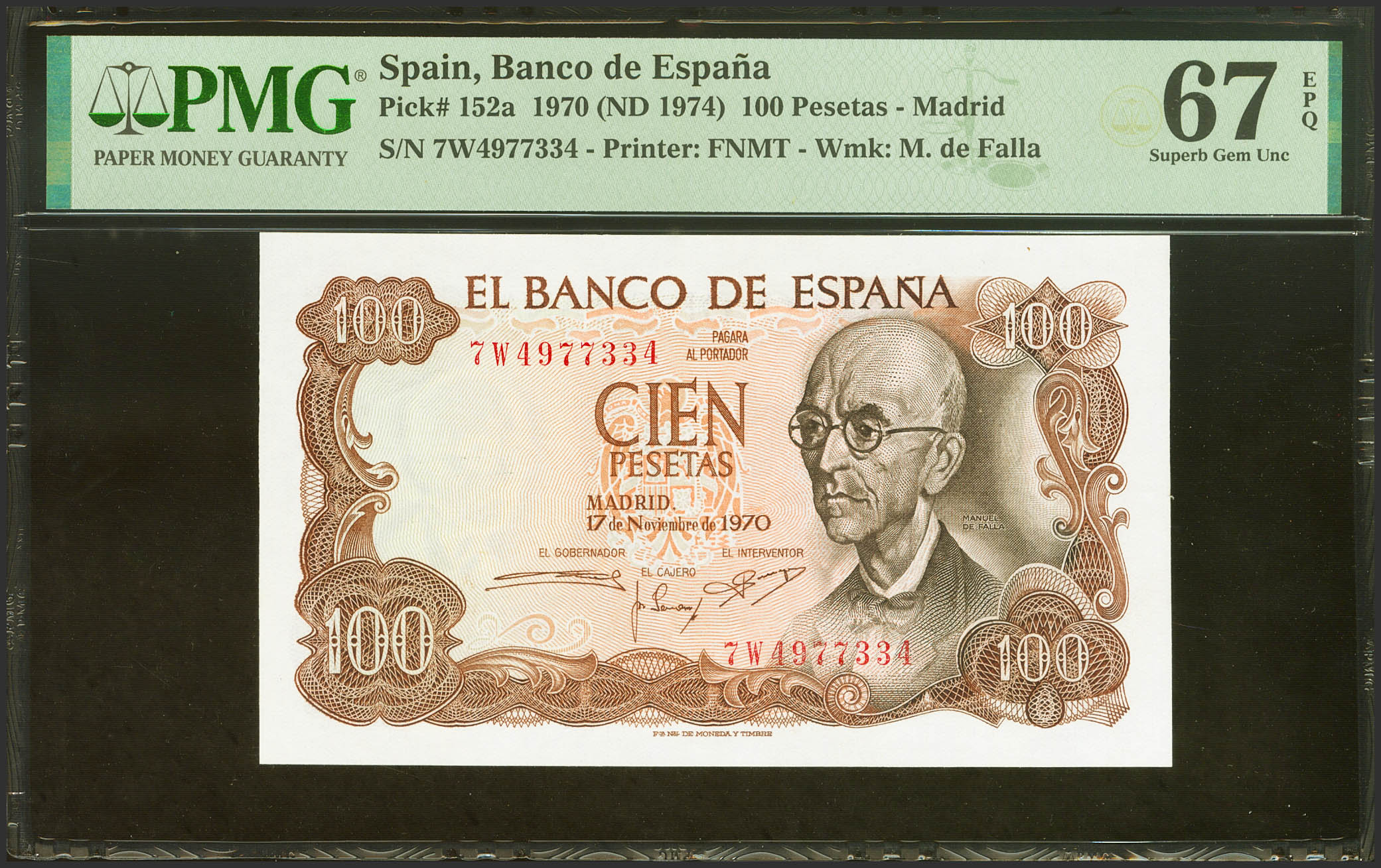 100 Pesetas. 17 de Noviembre de 1970. Serie 7W, última serie emitida. (Edifil 2021: 472c, Pick: 152a). Inusual en esta excepcional calidad, apresto original. SC. Encapsulado PMG67EPQ.