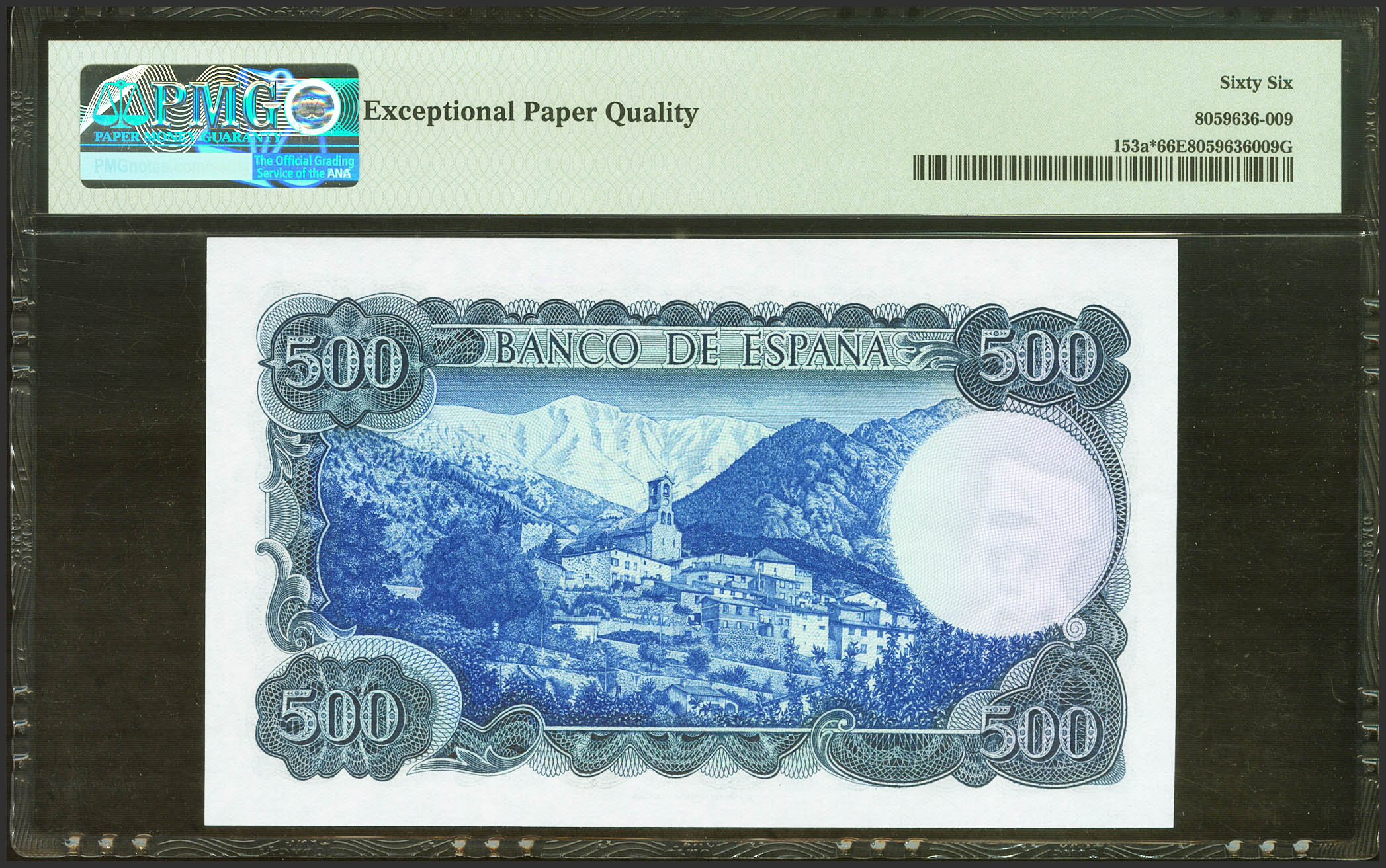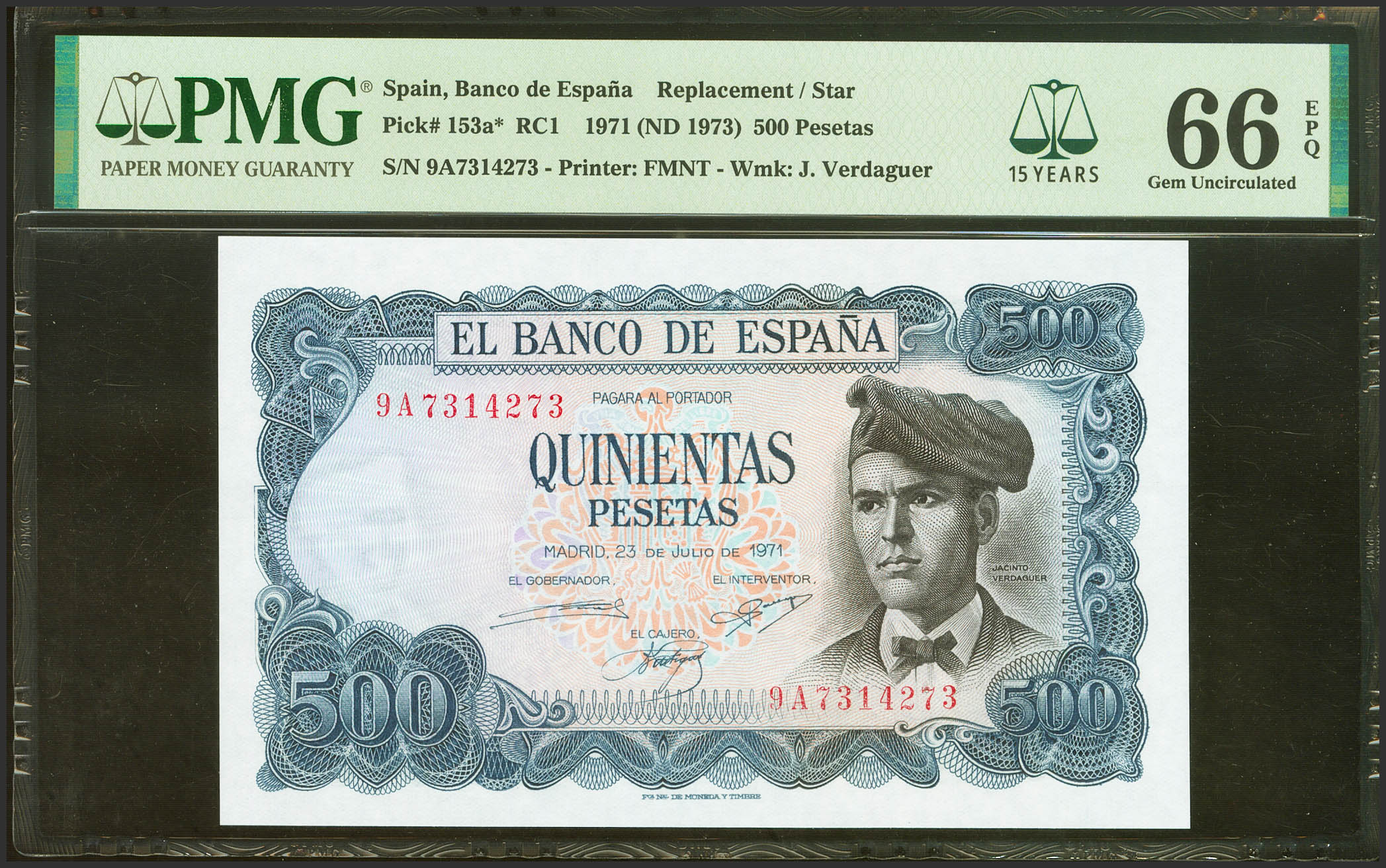 500 Pesetas. 23 de Julio de 1971. Serie especial 9A. (Edifil 2023: 473b, Pick: 153a*). Inusual en esta conservación, apresto original. Encapsulado PMG66EPQ.