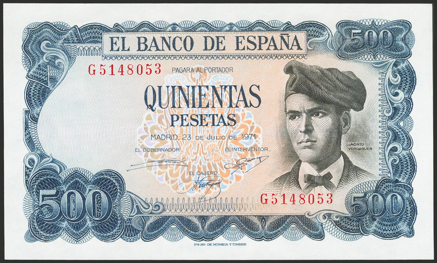 500 Pesetas. 23 de Julio de 1971. Serie G. (Edifil 2021: 473a). Conserva todo su apresto original. SC.
