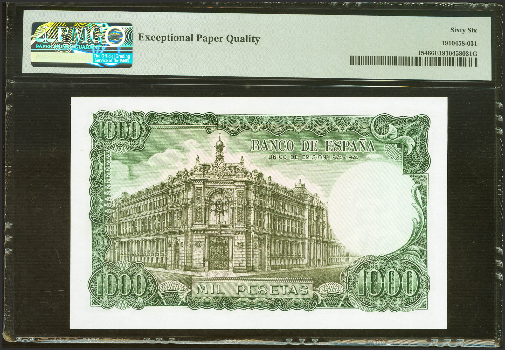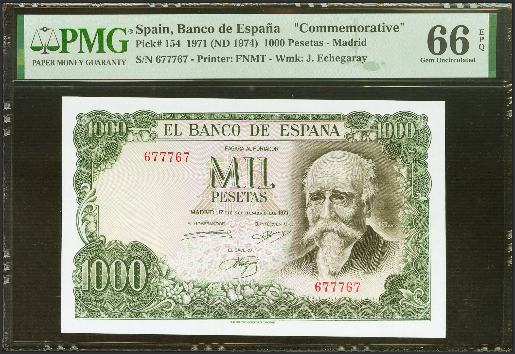 1000 Pesetas. 17 de Septiembre de 1971. Sin serie. (Edifil 2023: 474, Pick: 154). Inusual en esta calidad, apresto original. Encapsulado PMG66EPQ.