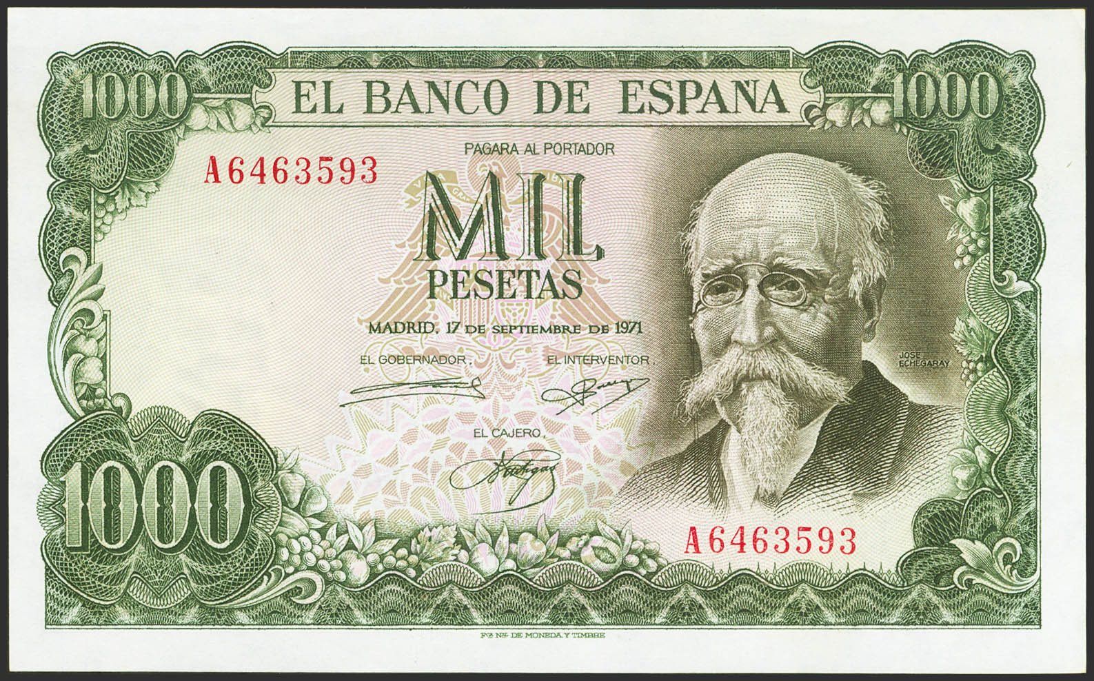 1000 Pesetas. 17 de Septiembre de 1971. Serie A. (Edifil 2023: 474a). Apresto original. SC--.