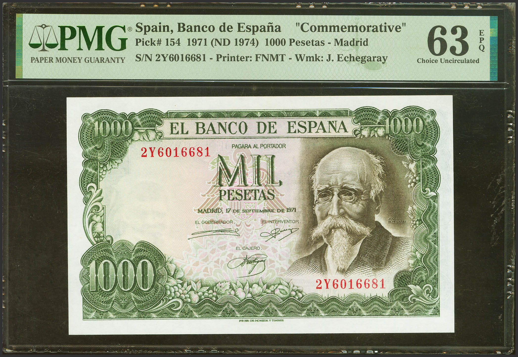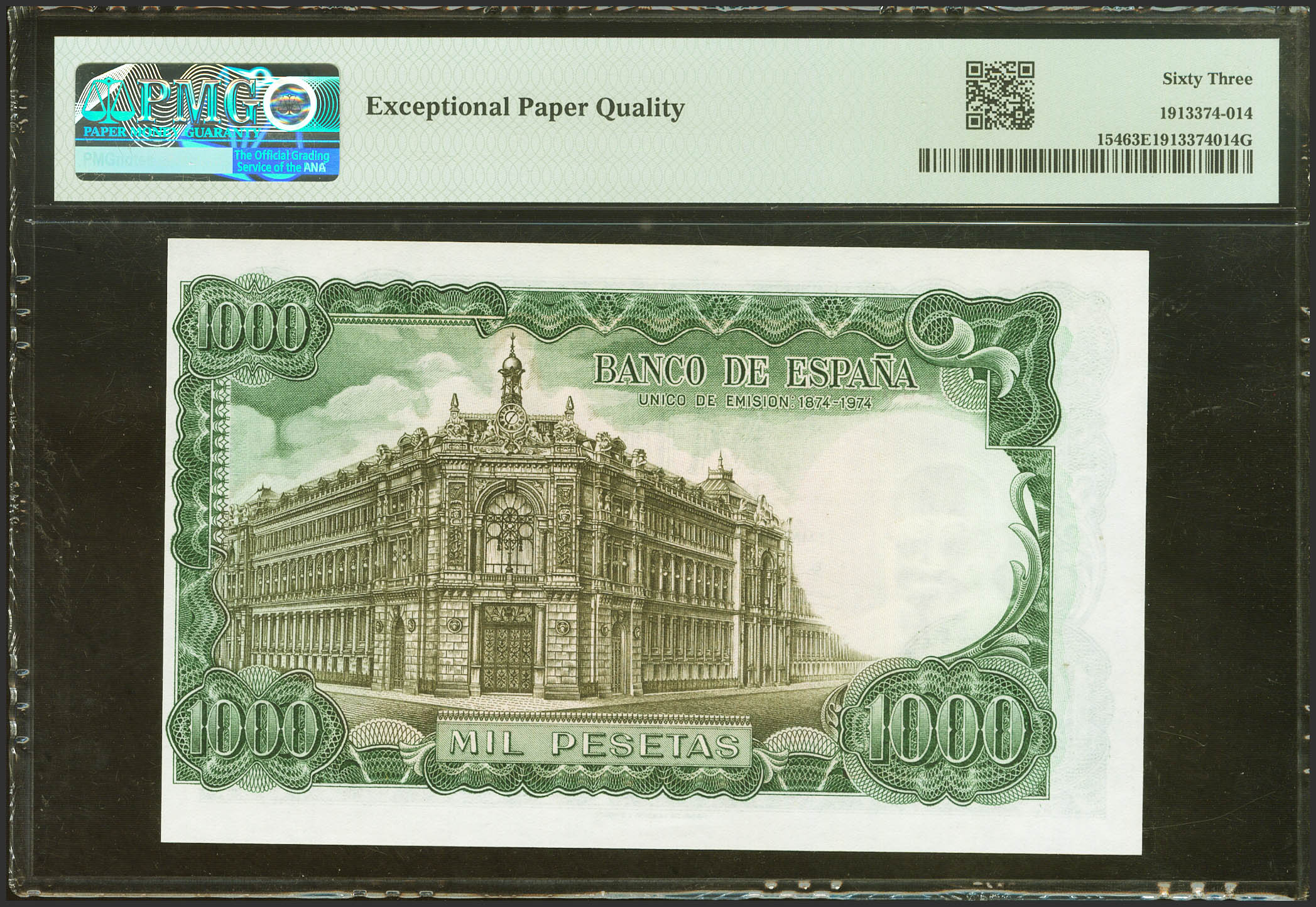 1000 Pesetas. 17 de Septiembre de 1971. Error de impresión en el reverso y serie 2Y. (Edifil 2021: 474c, Pick: 154). Apresto original. SC. Encapsulado PMG63EPQ.