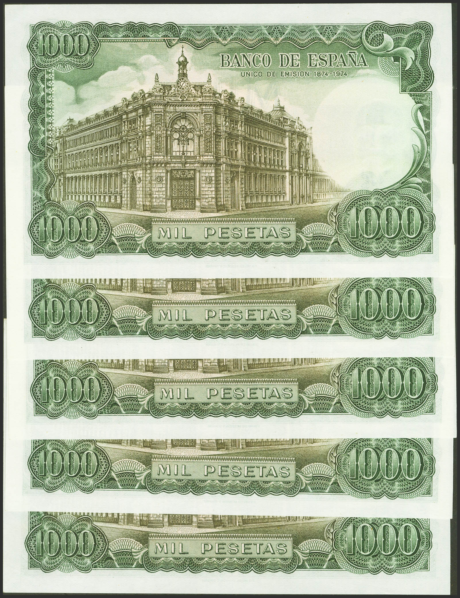 Conjunto de 5 billetes correlativos de 1000 Pesetas emitidos el 17 de Septiembre de 1971, todos ellos con la serie 3G (Edifil 2021: 474c), conservando su apresto original. SC/SC-.