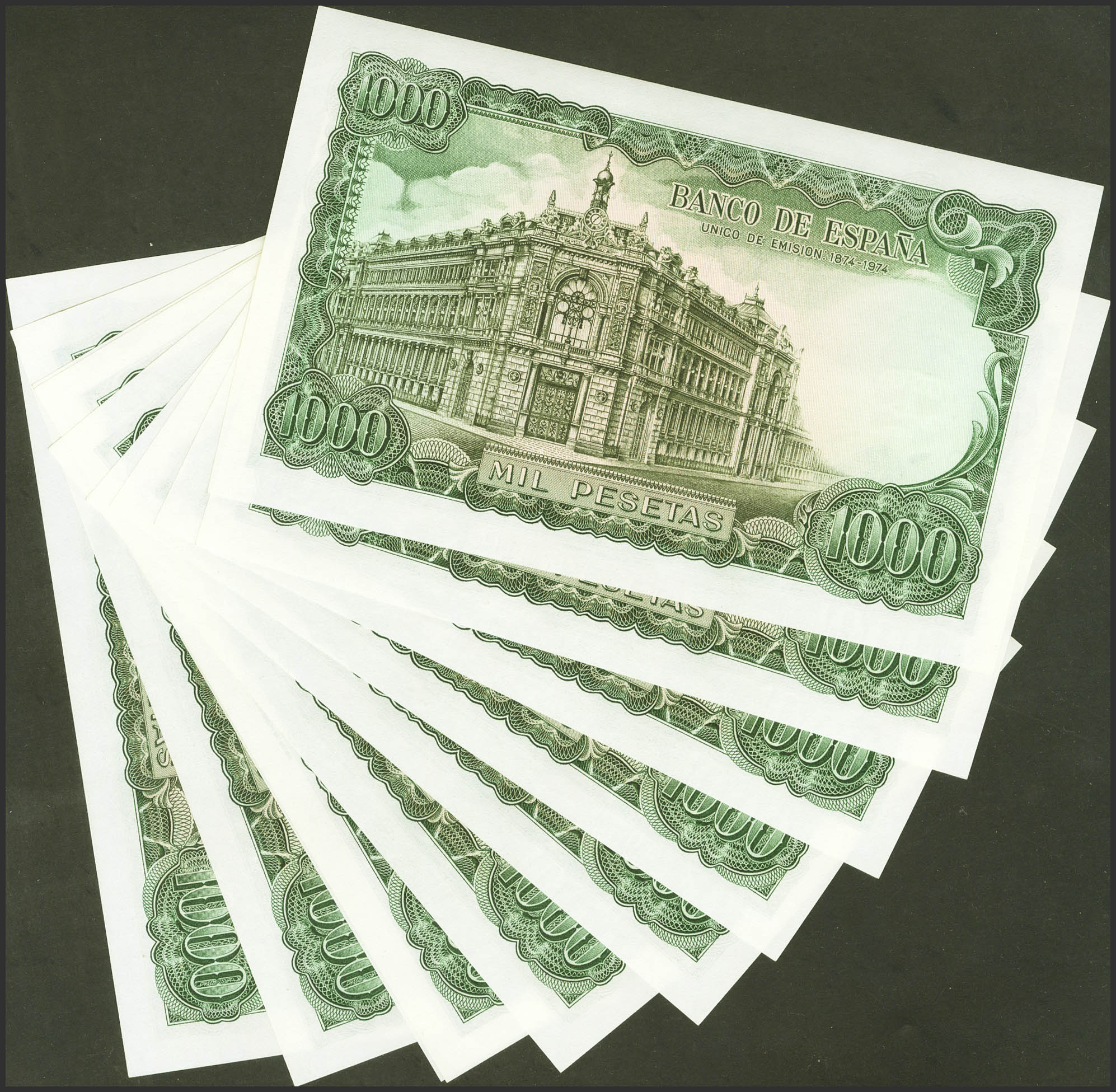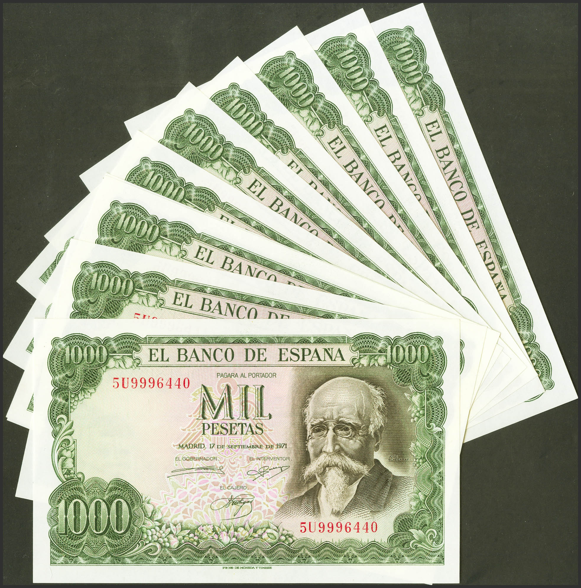Conjunto de 10 billetes correlativos de 1000 Pesetas emitidos el 17 de Septiembre de 1971, todos ellos con la serie 5U (Edifil 2021: 474c), conservando su apresto original. SC/SC-.