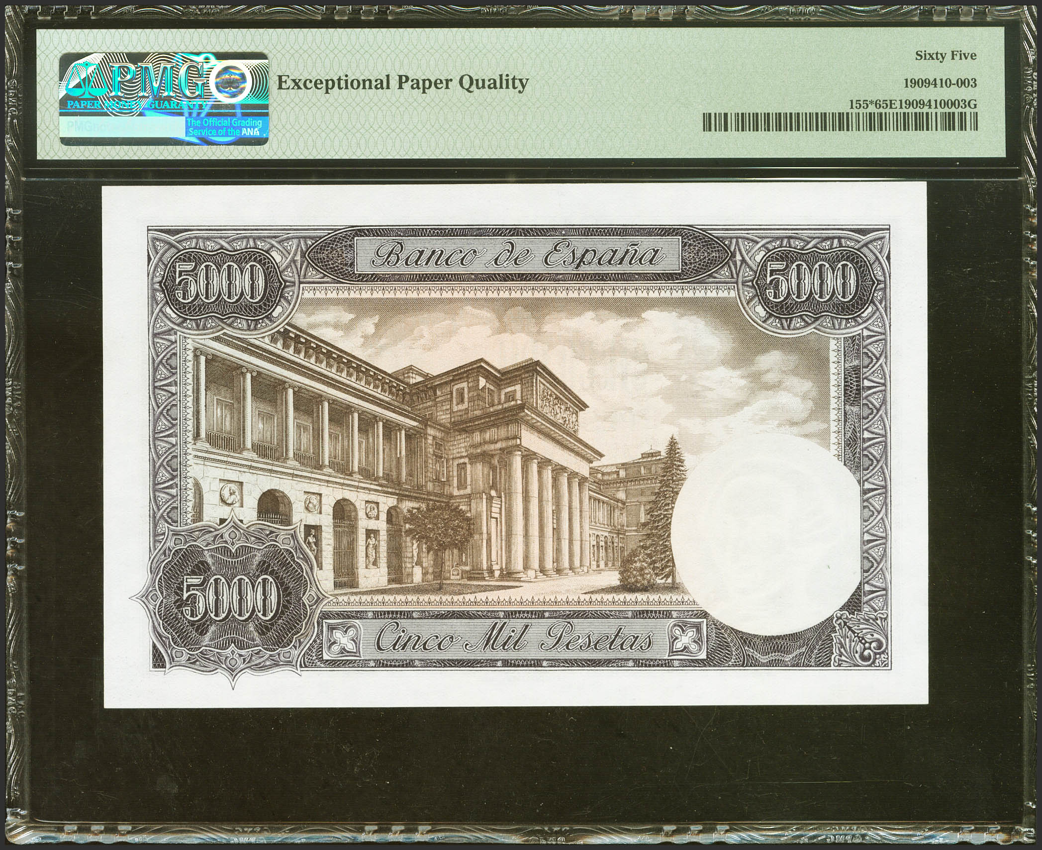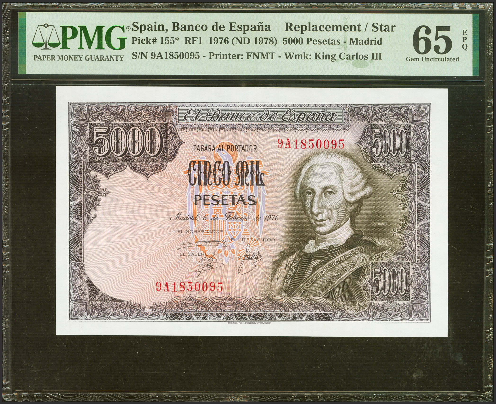 5000 Pesetas. 6 de Febrero de 1976. Serie especial 9A. (Edifil 2021: 475b, Pick: 155*). Inusual, especialmente en esta excepcional calidad. SC. Encapsulado PMG65EPQ.