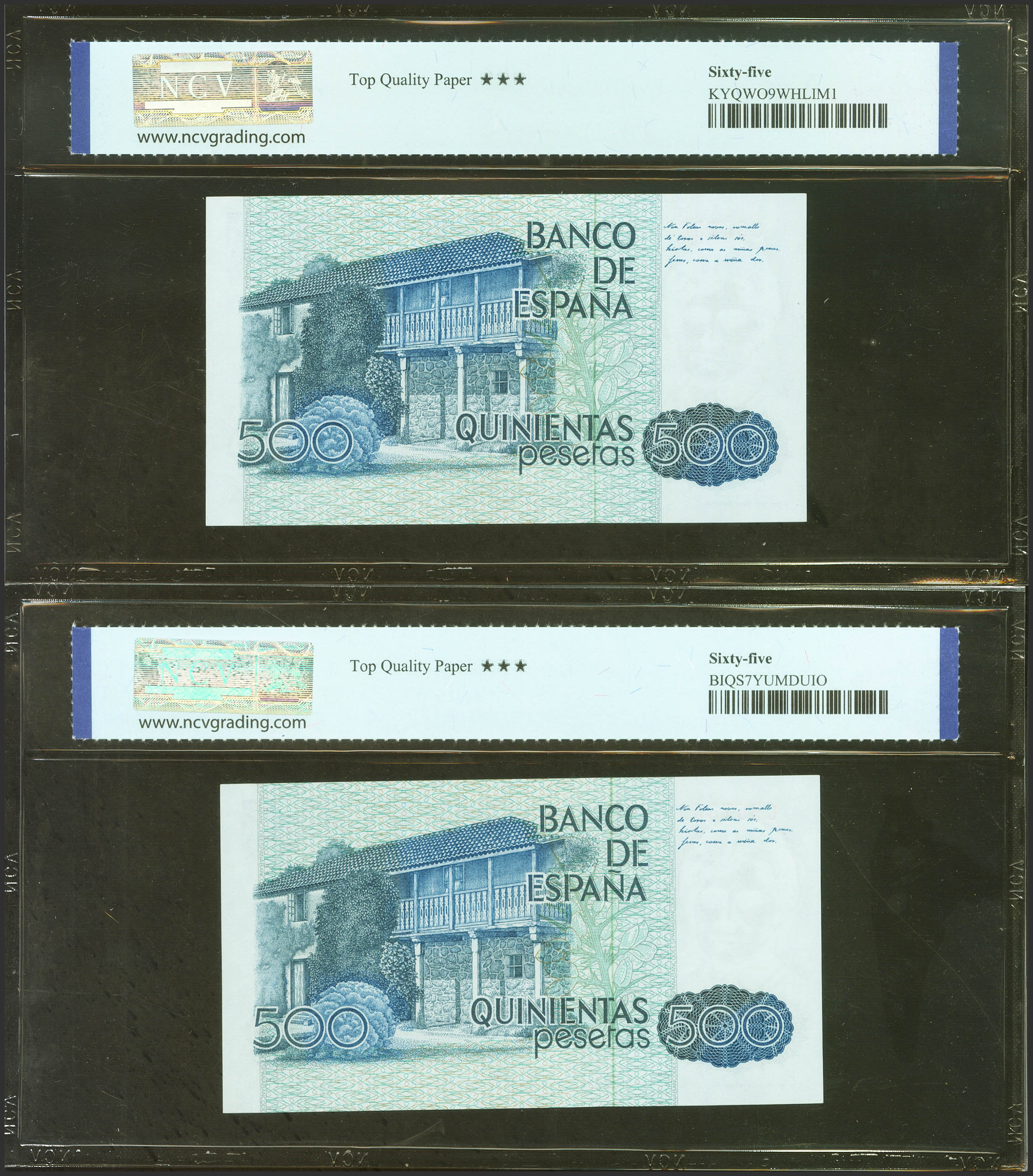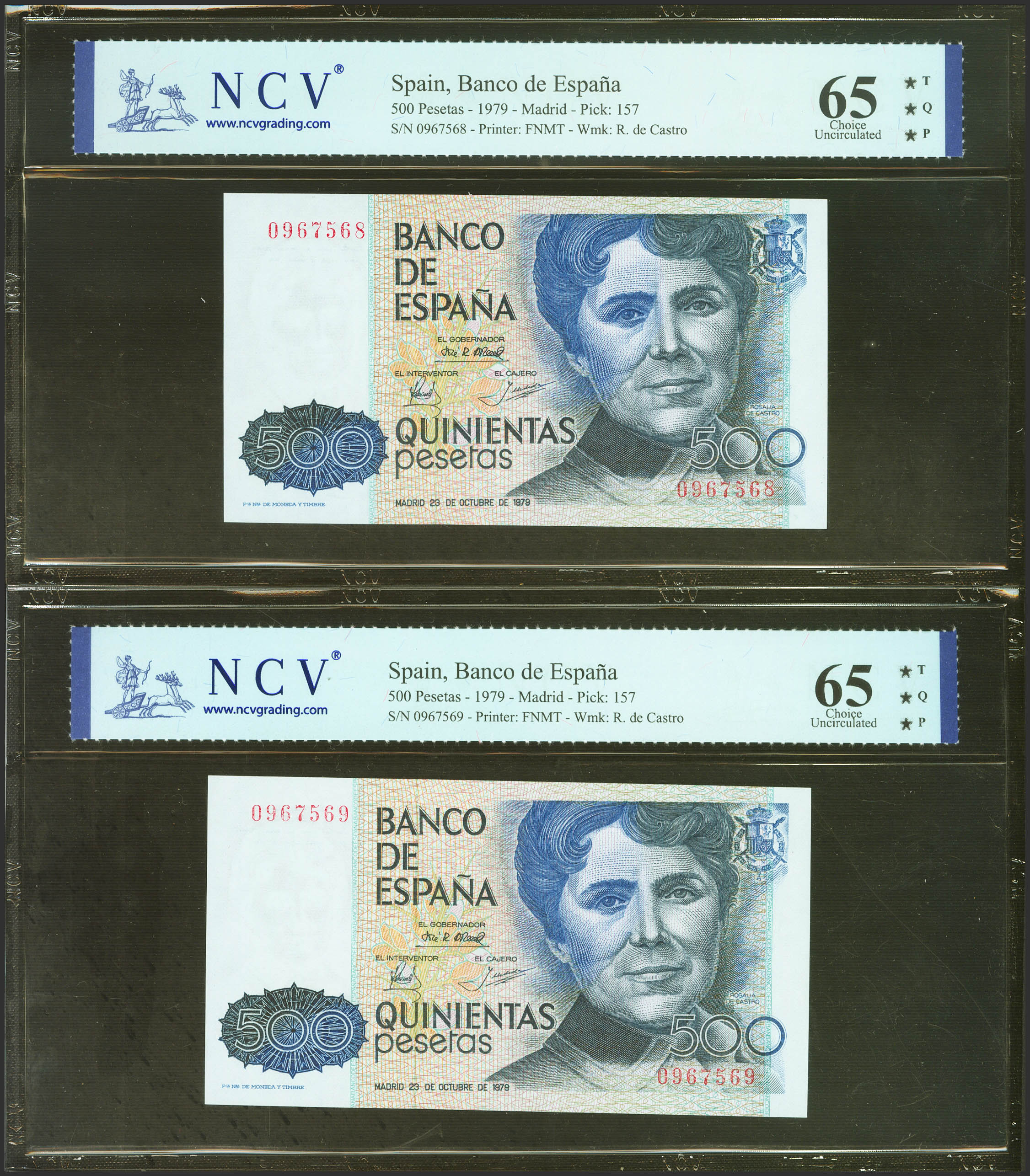 500 Pesetas. 23 de Octubre de 1979. Pareja correlativa. Sin serie. (Edifil 2023: 476, Pick: 157). SC. Encapsulados NCV65TQP, ambos.