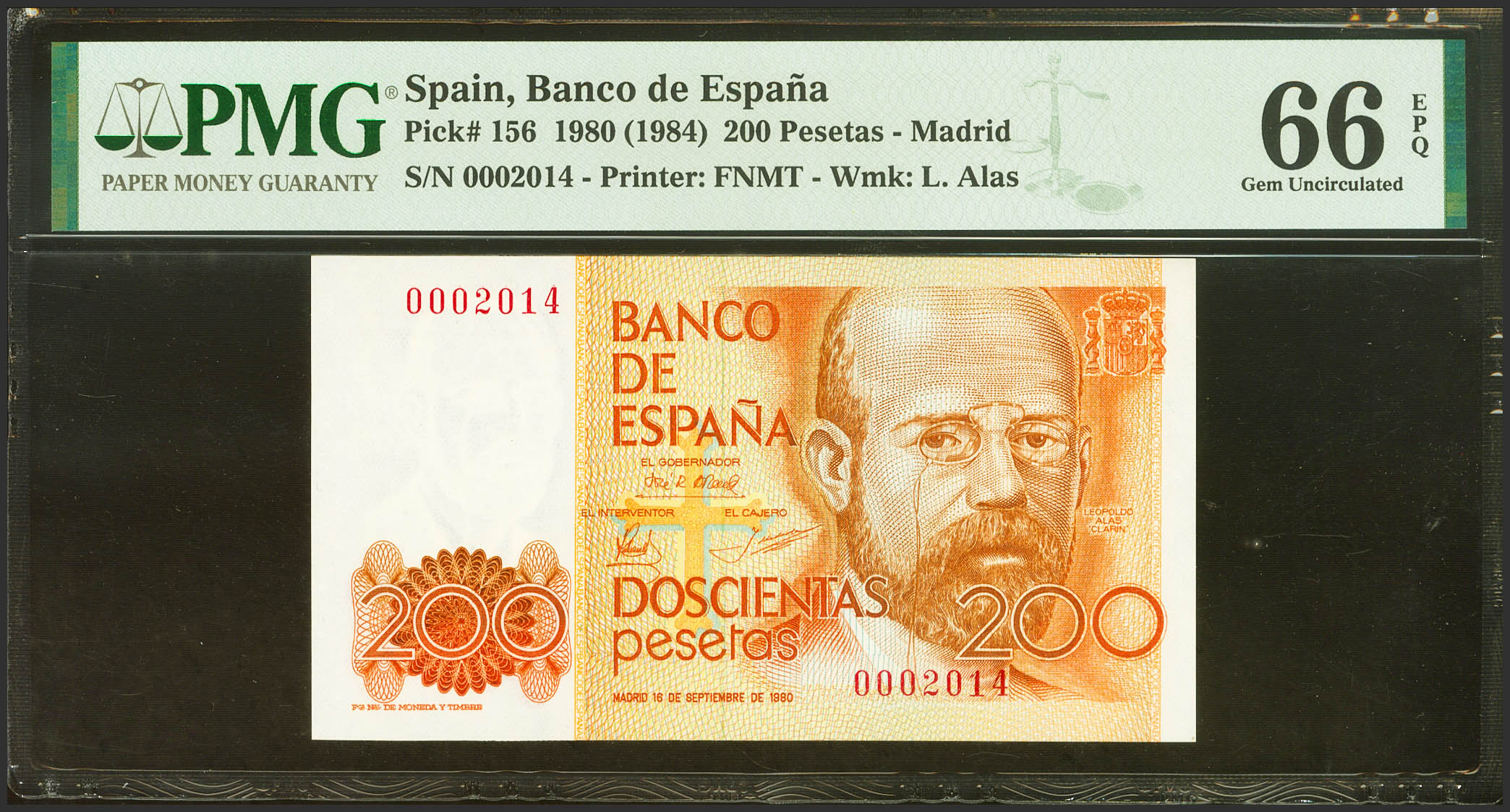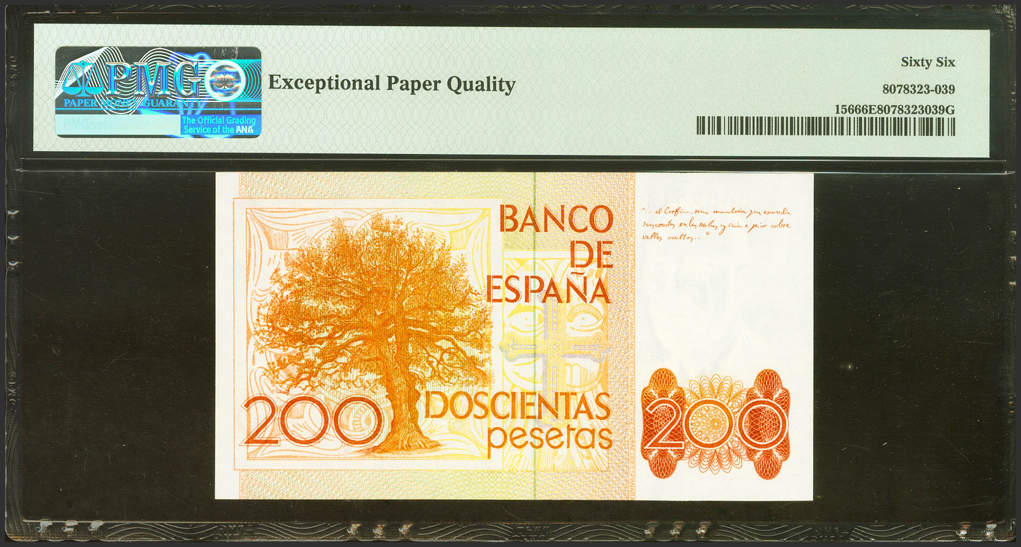 200 Pesetas. 16 de Septiembre de 1980. Sin serie y numeración bajísima. (Edifil 2021: 480, Pick: 156). Raro en esta excepcional calidad. SC. Encapsulado PMG66EPQ.