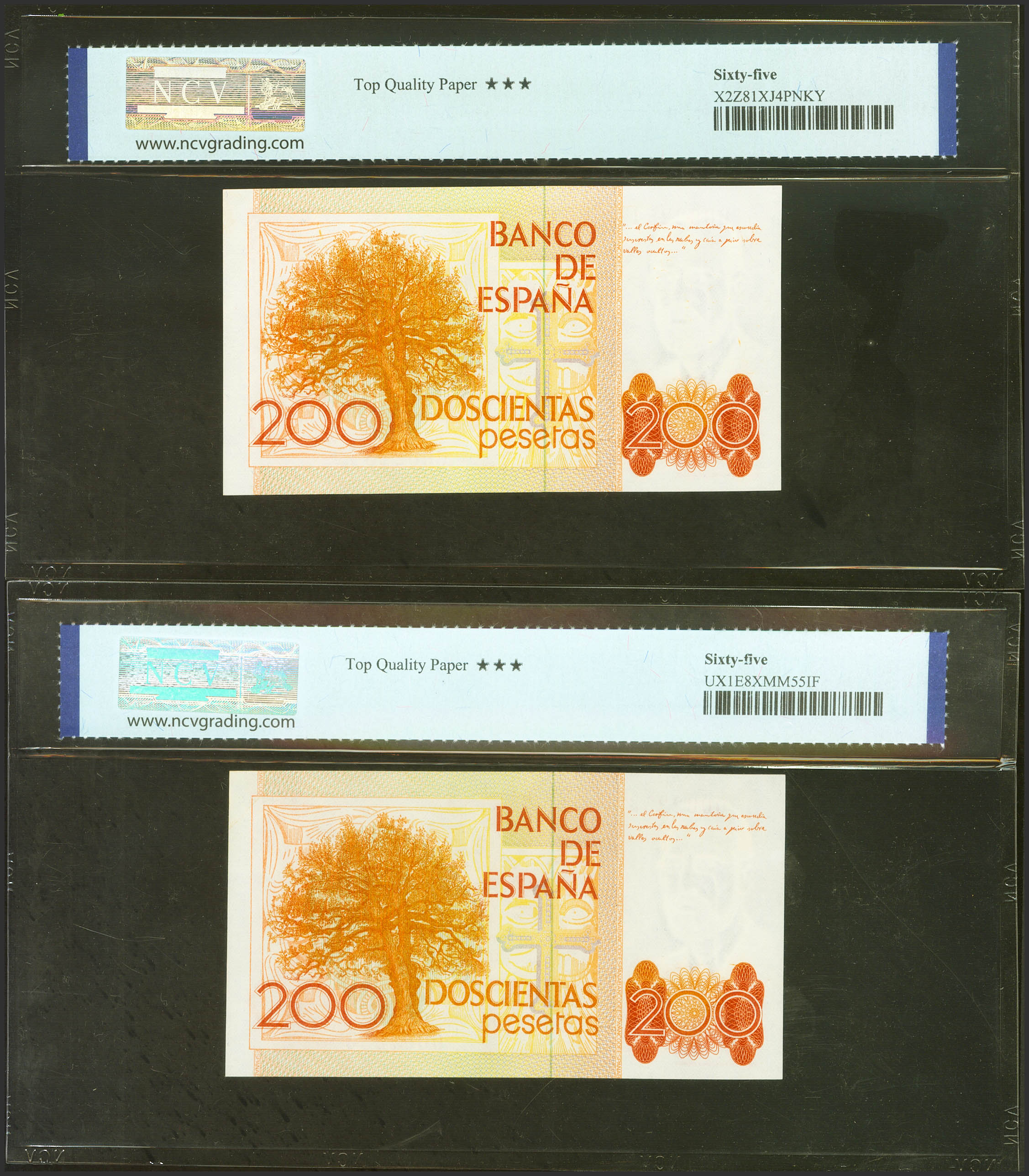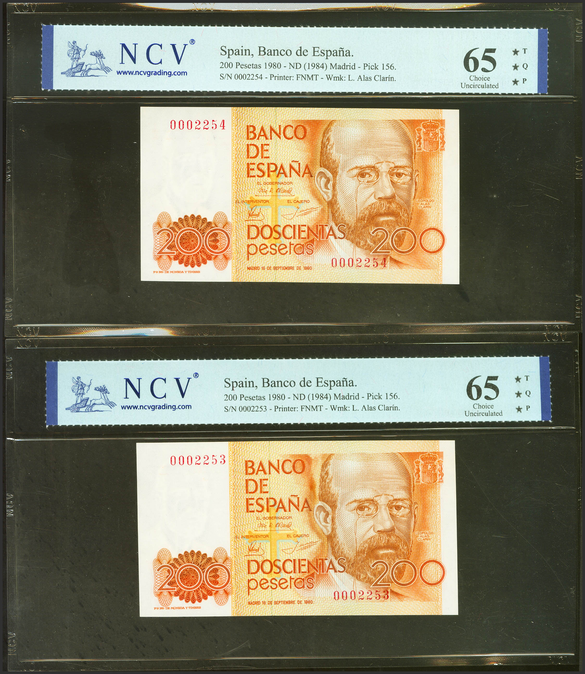 200 Pesetas. 16 de Septiembre de 1980. Pareja correlativa. Sin serie y numeracion muy baja. (Edifil 2023: 480, Pick: 156). SC. Encapsulados NCV65TQP, ambos.