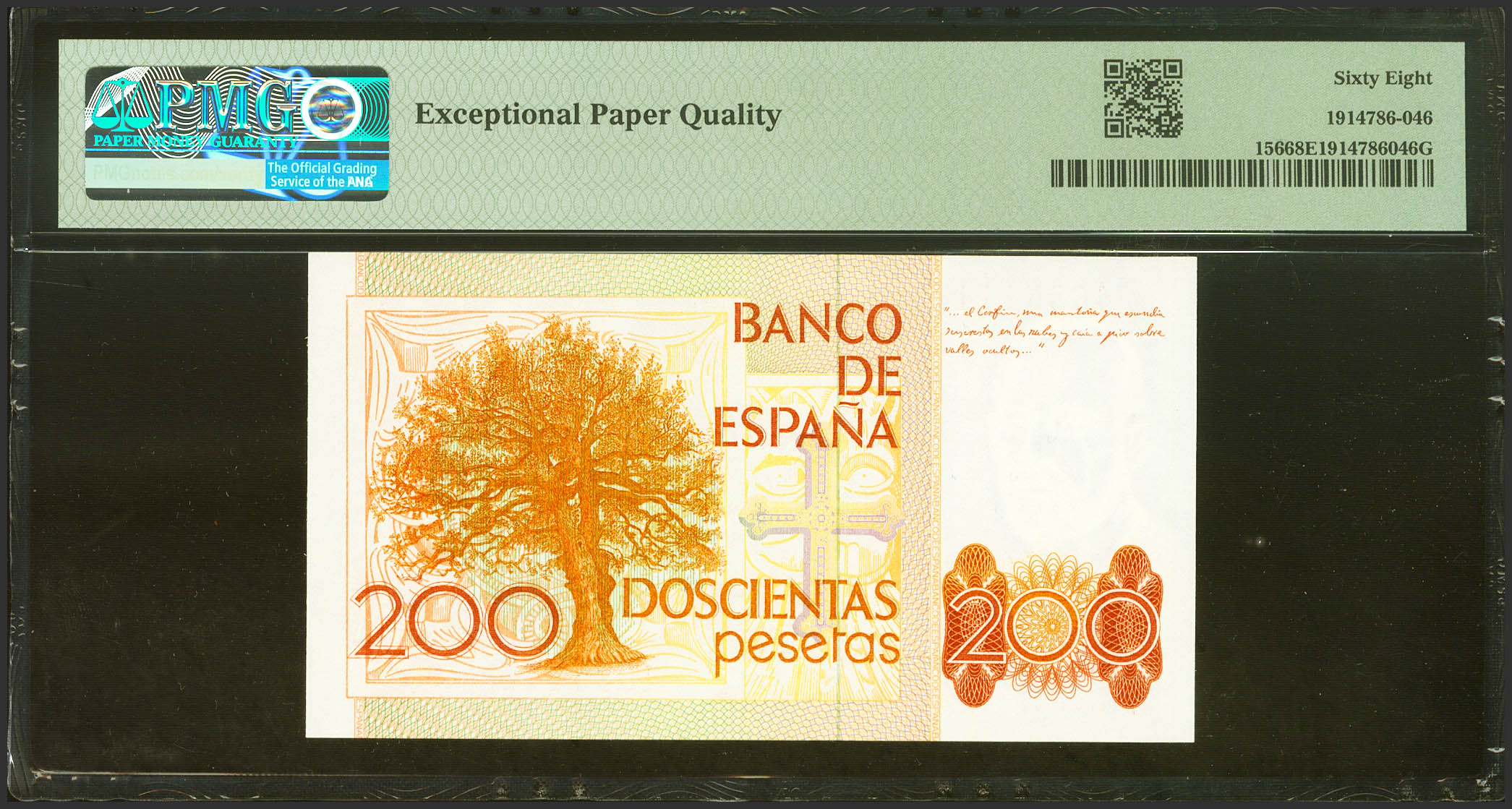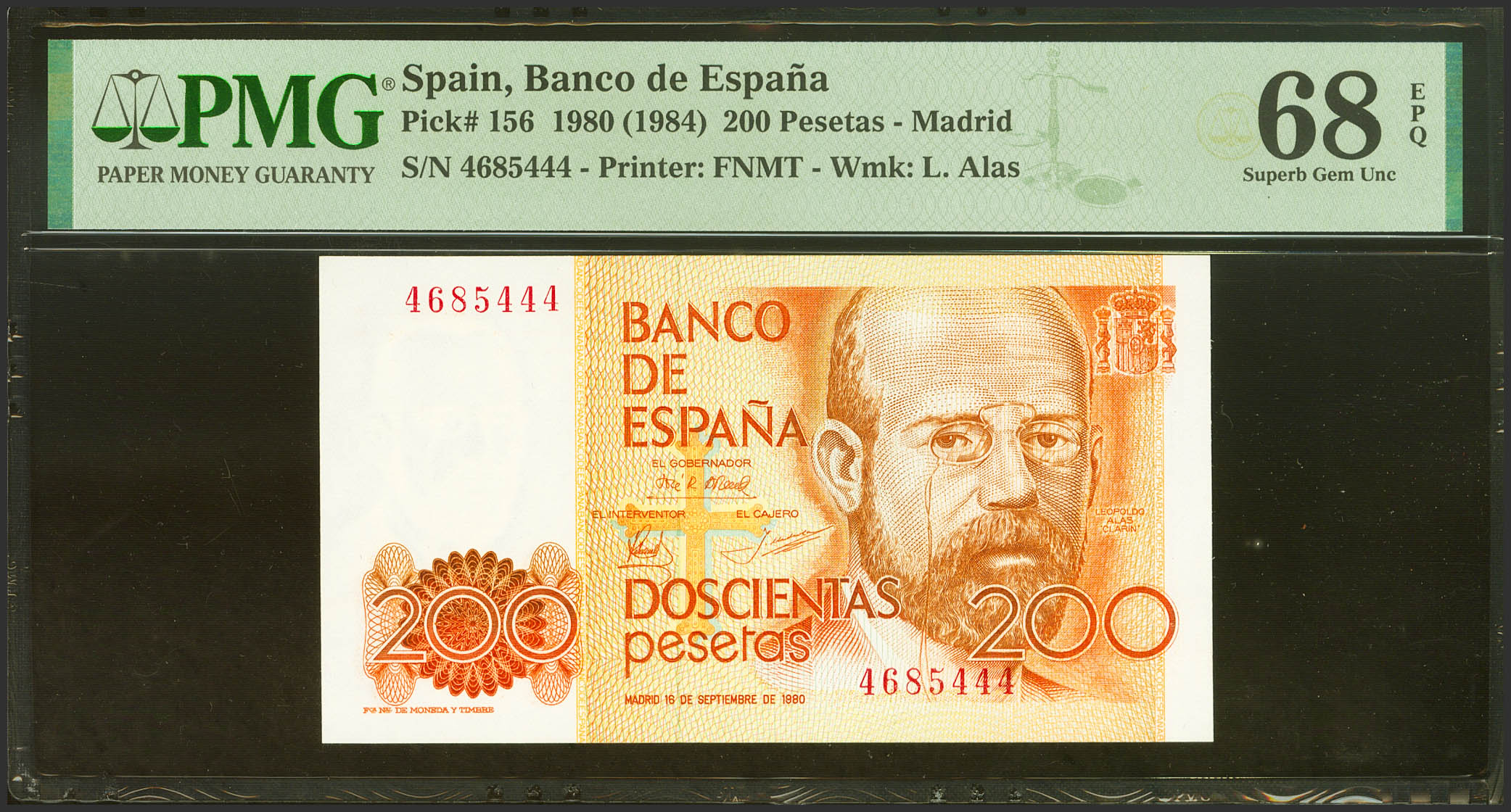 200 Pesetas. 16 de Septiembre de 1980. Sin serie. (Edifil 2021: 480, Pick: 156). SC. Encapsulado PMG68EPQ.