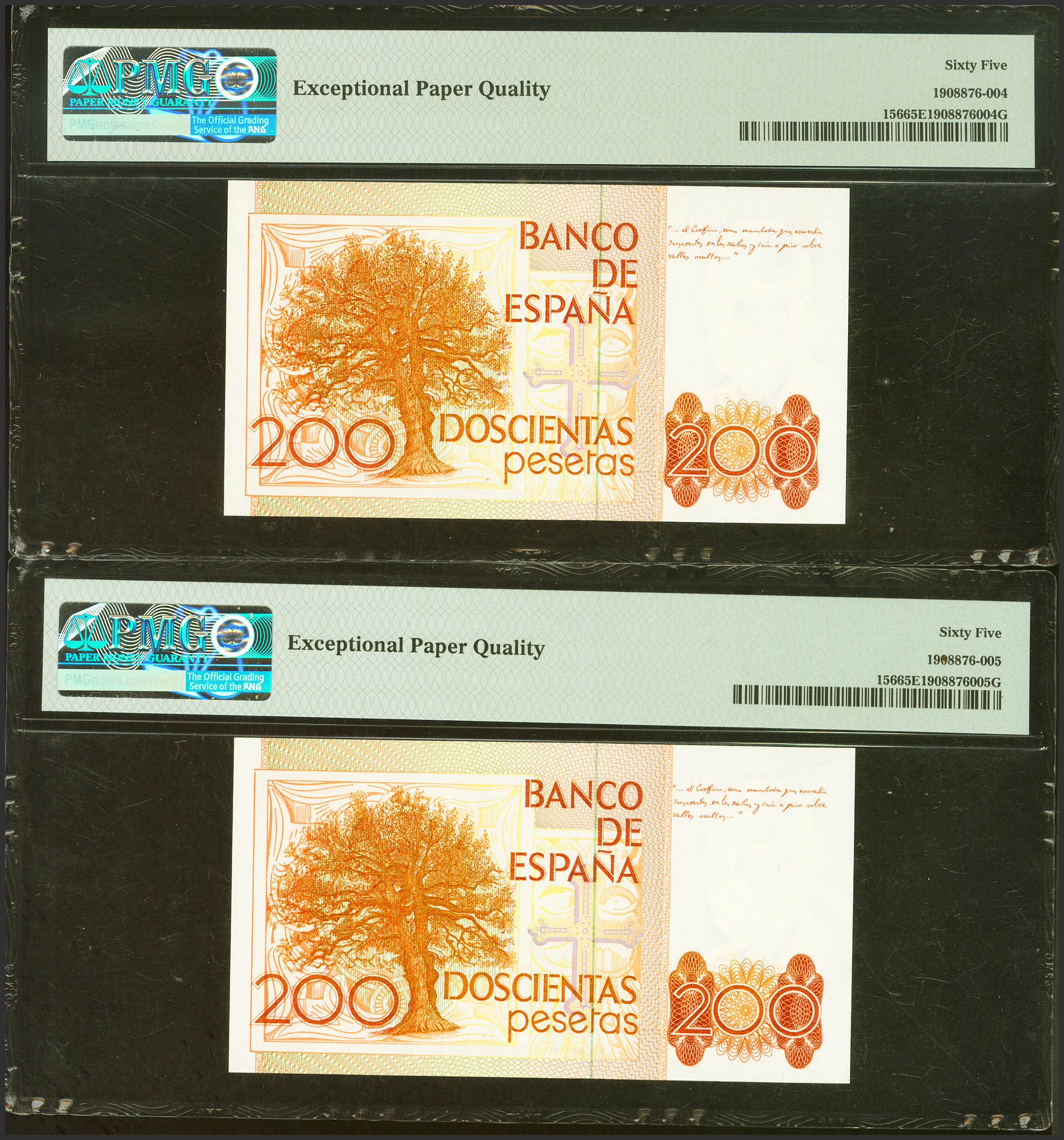 200 Pesetas. 16 de Septiembre de 1980. Pareja correlativa. Serie M, última serie emitida. (Edifil 2023: 480a, Pick: 156). SC. Encapsulados PMG65EPQ, ambos.