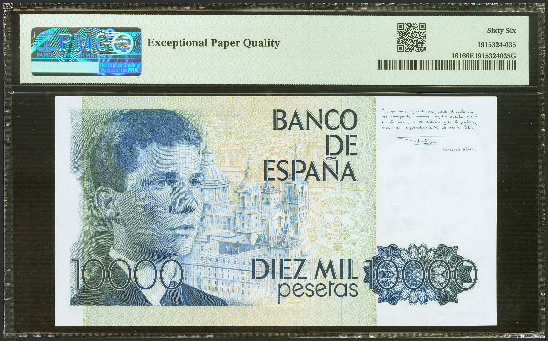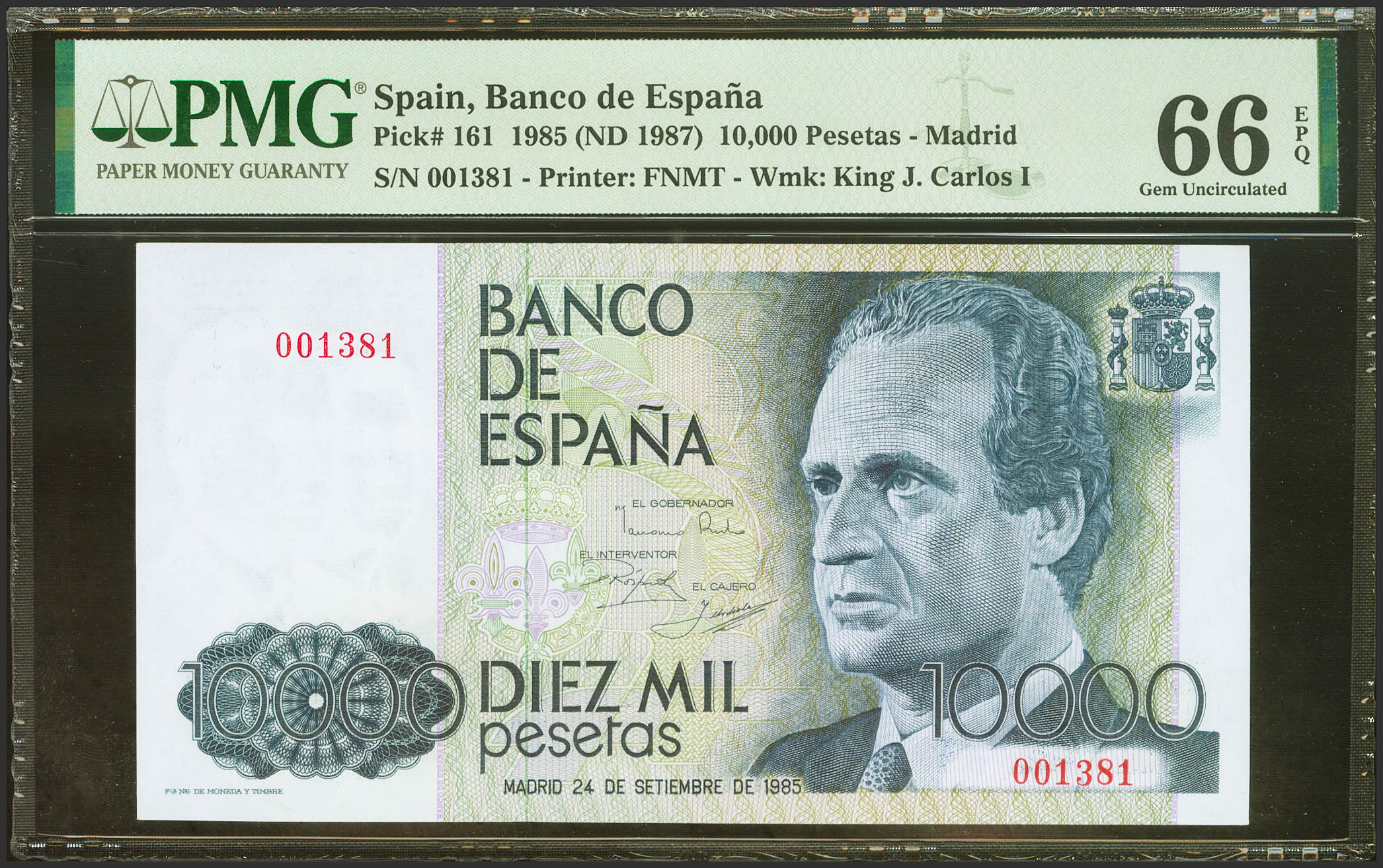 10000 Pesetas. 24 de Septiembre de 1985. Sin serie y bajísima numeración. (Edifil 2023: 481, Pick: 161). Inusual en esta excepcional calidad. SC. Encapsulado PMG66EPQ.