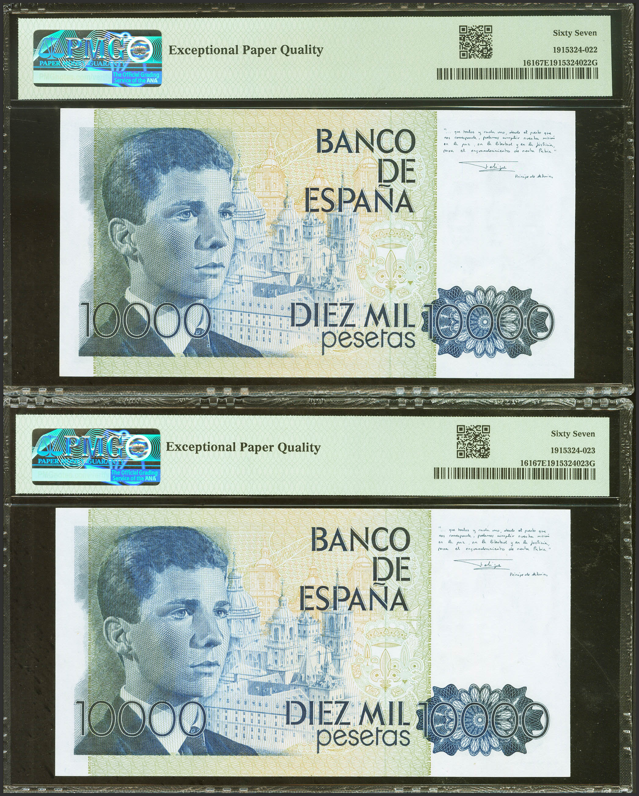 10000 Pesetas. 24 de Septiembre de 1985. Pareja correlativa. Sin serie y bajísima numeración. (Edifil 2023: 481, Pick: 161). Muy rara en esta excepcional calidad. SC. Encapsulados PMG67EPQ, ambos.