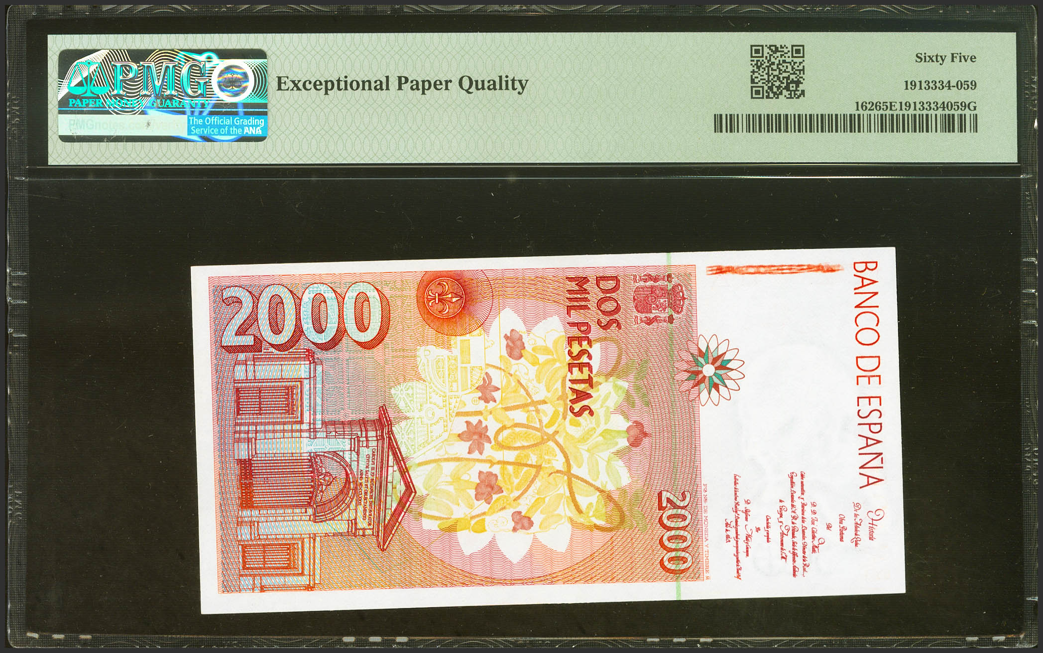 2000 Pesetas. 24 de Abril de 1992. Sin serie y numeración baja. (Edifil 2023: 482, Pick: 162). SC. Encapsulado PMG65EPQ.