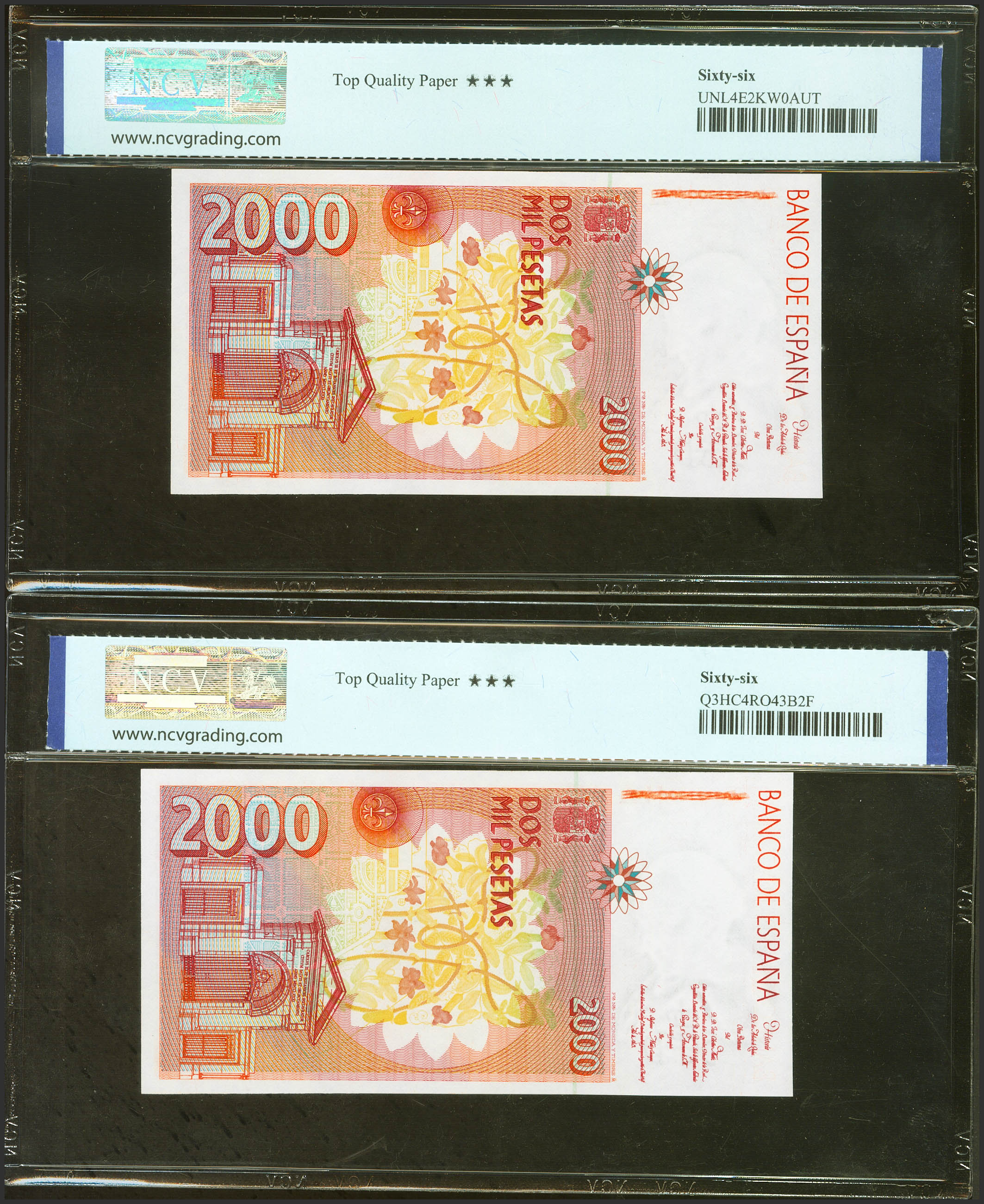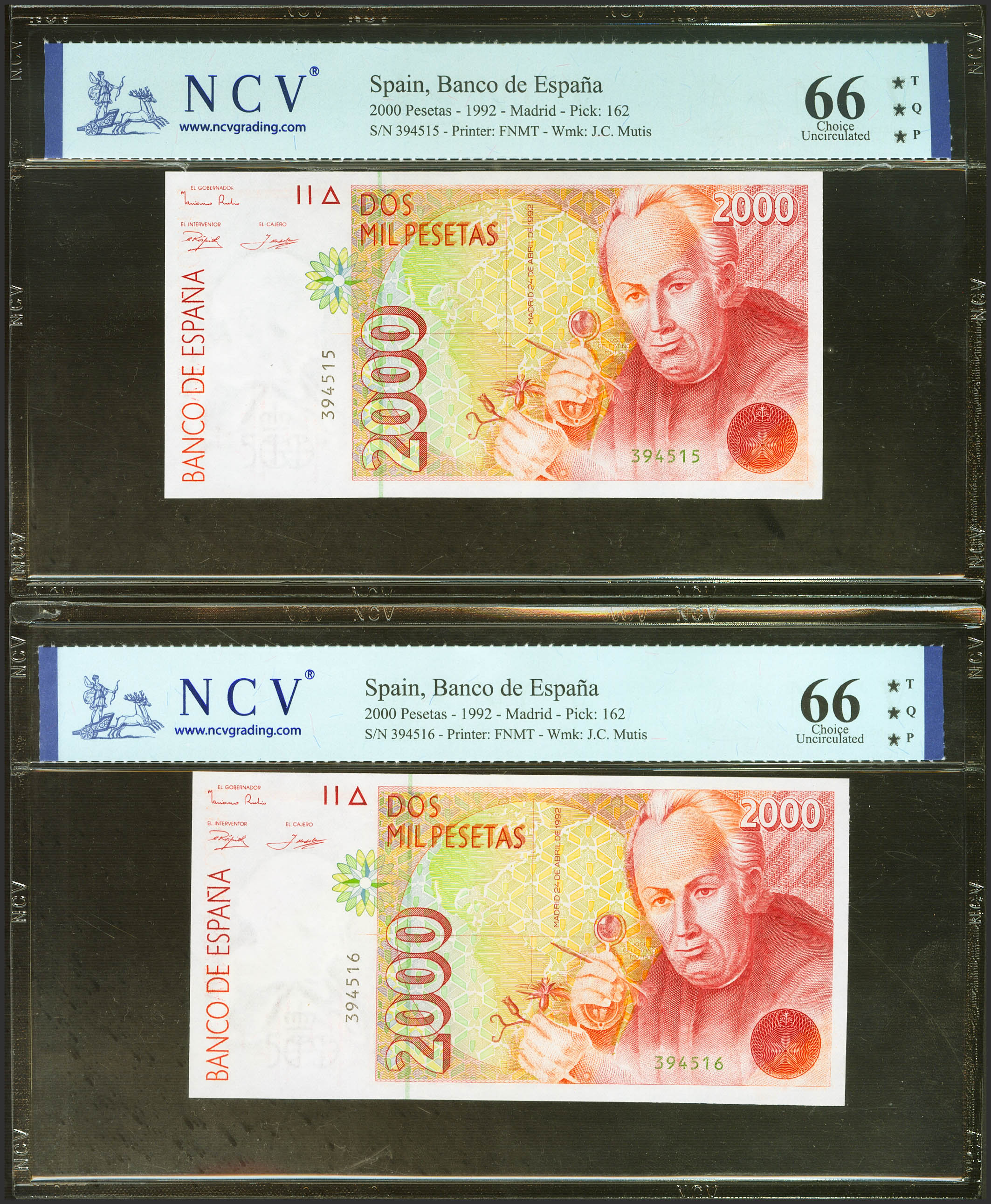 2000 Pesetas. 24 de Abril de 1992. Pareja correlativa. Sin serie. (Edifil 2023: 482, Pick: 162). Inusuales en esta excepcional calidad. SC. Encapsulados NCV66TQP, ambos.