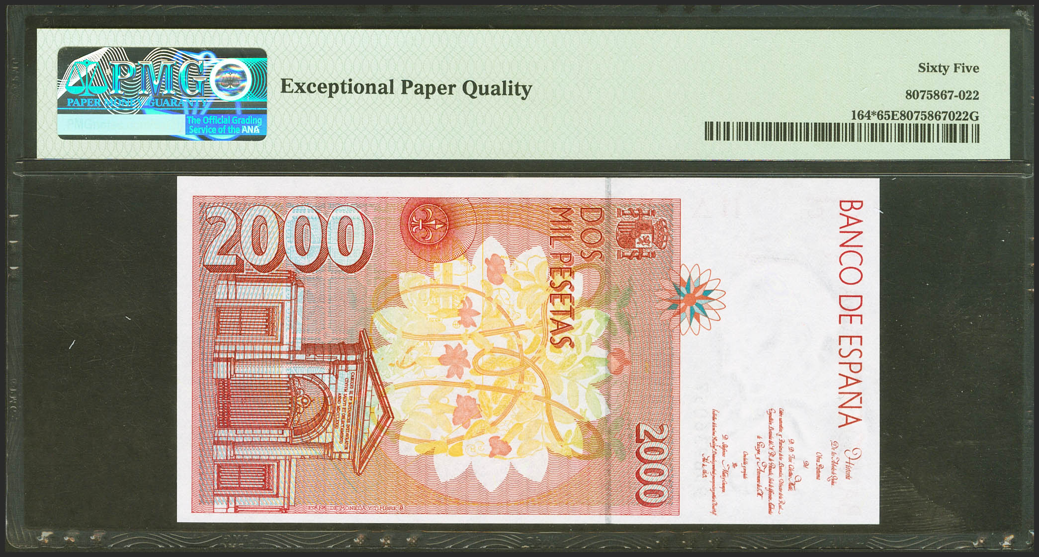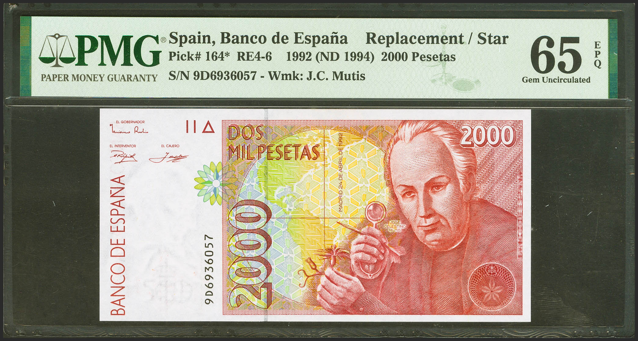 2000 Pesetas. 24 de Abril de 1992. Serie especial 9D. (Edifil 2021: 482Ab, Pick: 164*). Inusual en esta calidad. SC. Encapsulado PMG65EPQ.