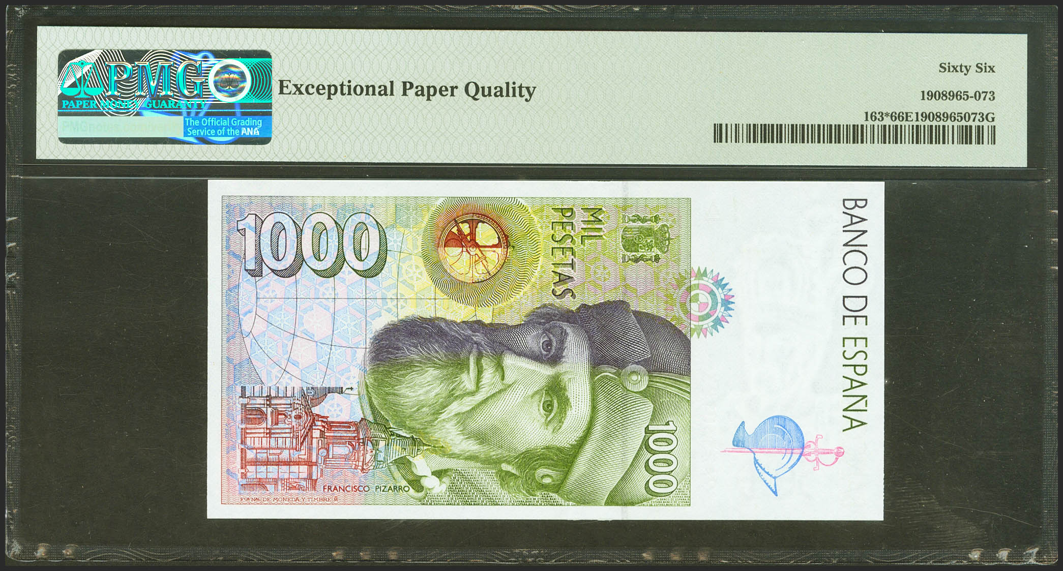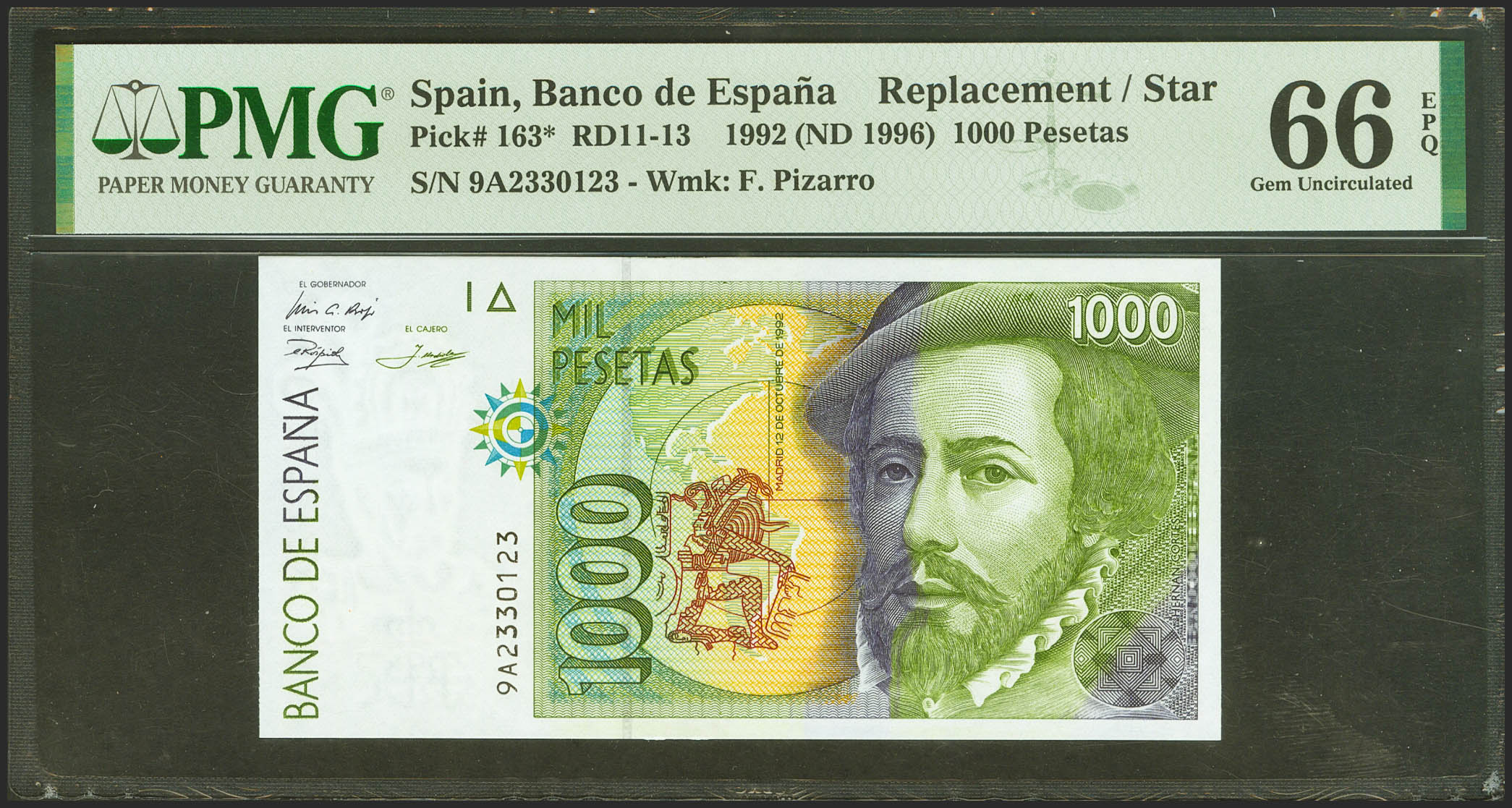 1000 Pesetas. 12 de Octubre de 1992. Serie especial 9A. (Edifil 2021: 483c, Pick: 163*). Raro en esta excepcional calidad. SC. Encapsulado PMG66EPQ.
