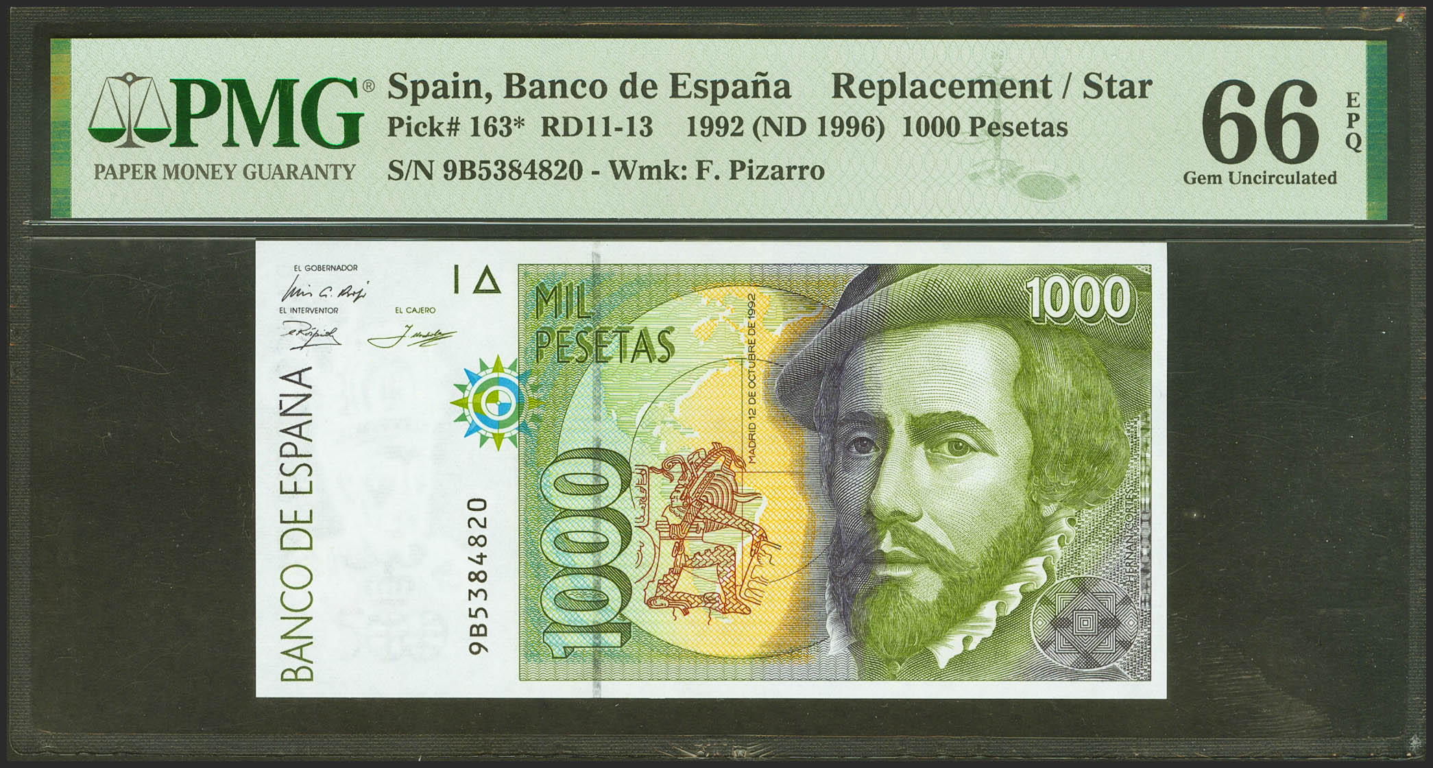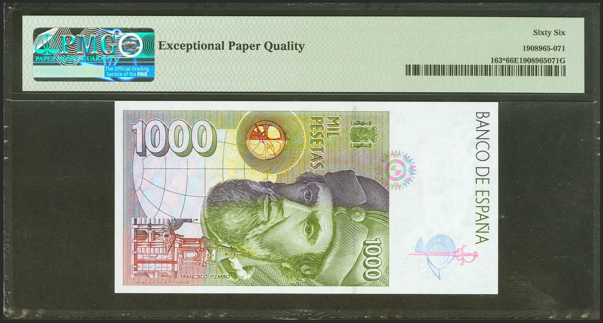 1000 Pesetas. 12 de Octubre de 1992. Serie especial 9B. (Edifil 2021: 483d, Pick: 163*). Raro en esta excepcional calidad. SC. Encapsulado PMG66EPQ.