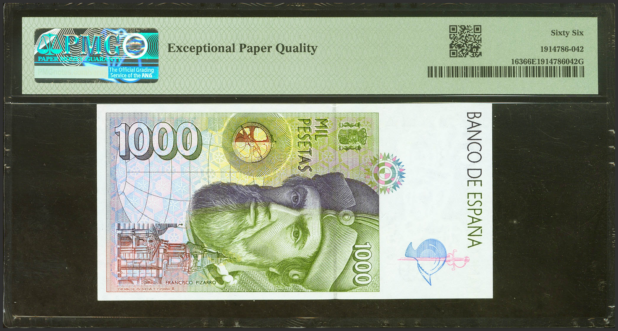 1000 Pesetas. 12 de Octubre de 1992. Sin serie. (Edifil 2023: 483, Pick: 163). SC. Encapsulado PMG66EPQ.