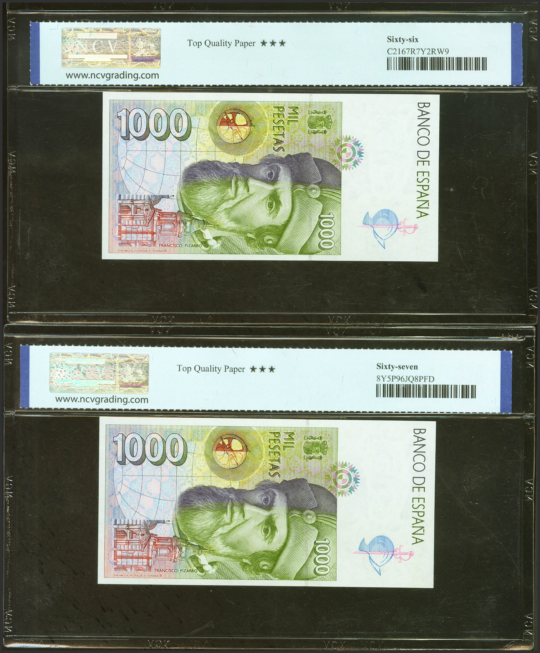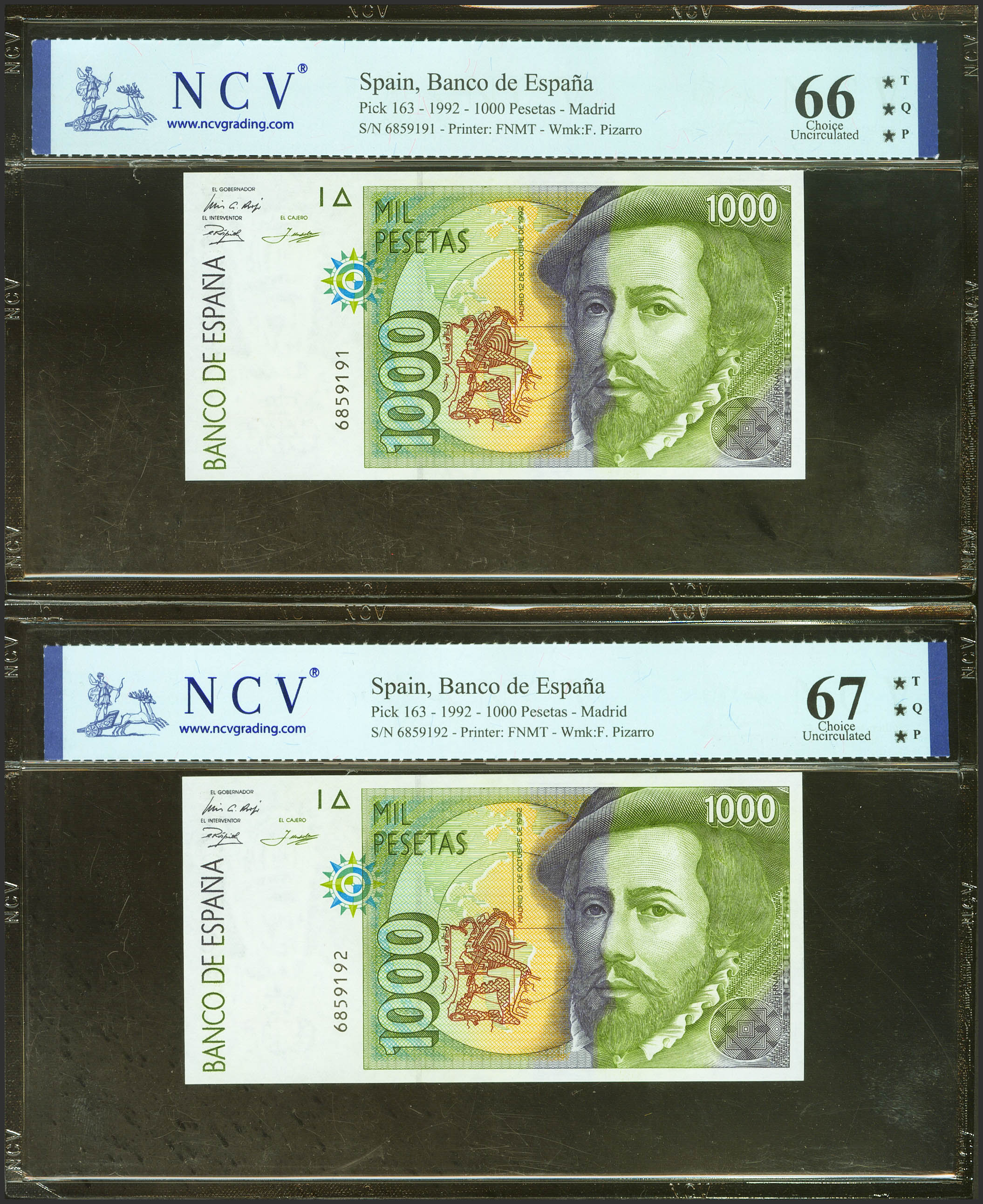 1000 Pesetas. 12 de Octubre de 1992. Pareja correlativa. Sin serie. (Edifil 2023: 483, Pick: 163). SC. Encapsulados NCV67TQP/66TQP, ambos.