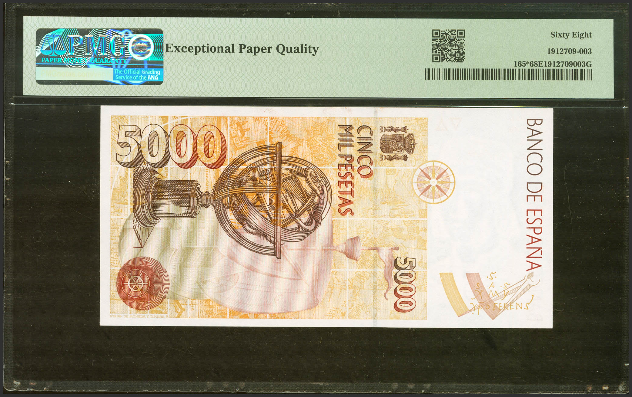 5000 Pesetas. 12 de Octubre de 1992. Serie especial 9A. (Edifil 2021: 484b, Pick: 165*). Raro en esta excepcional calidad, apresto original. SC. Encapsulado PMG68EPQ.