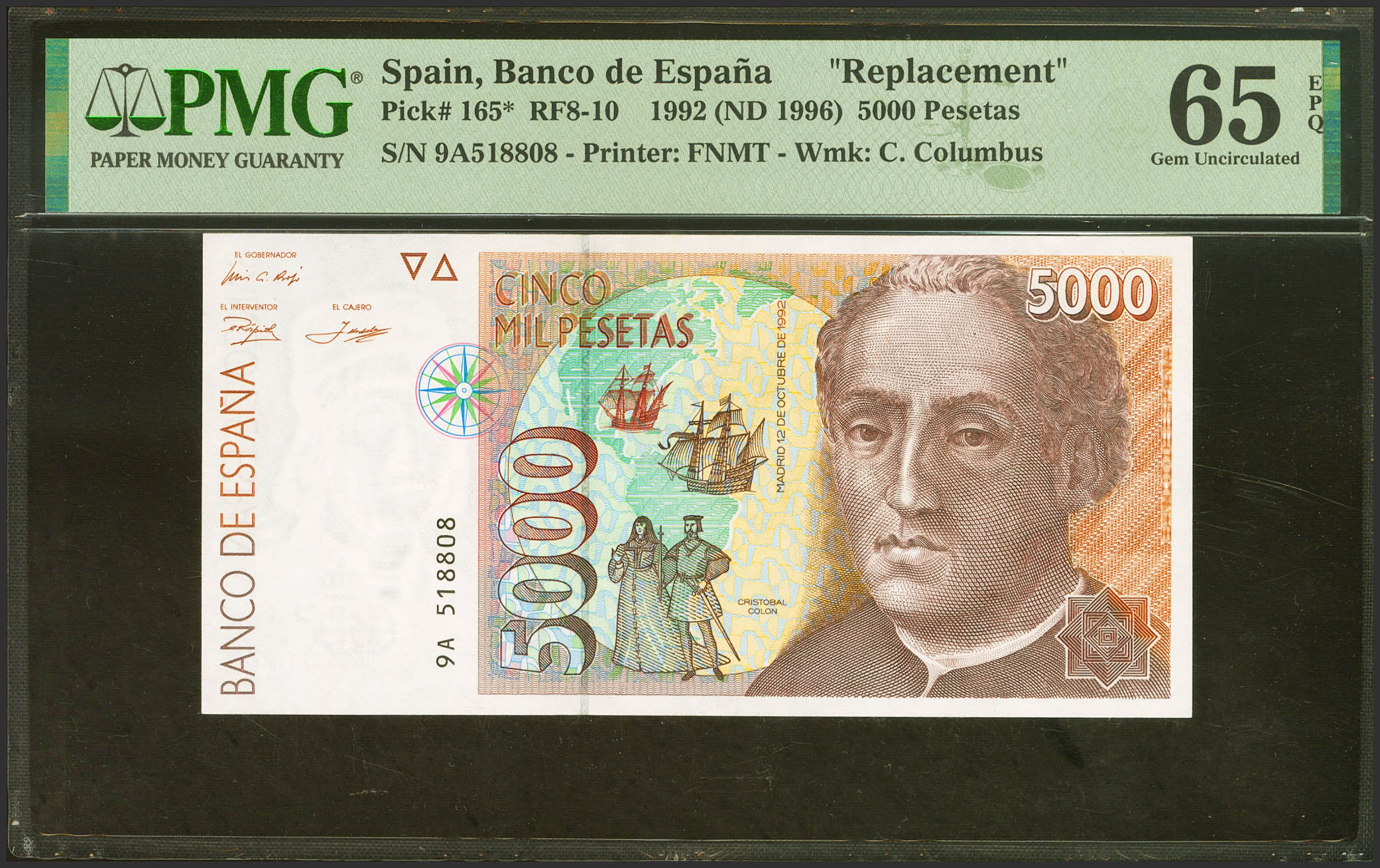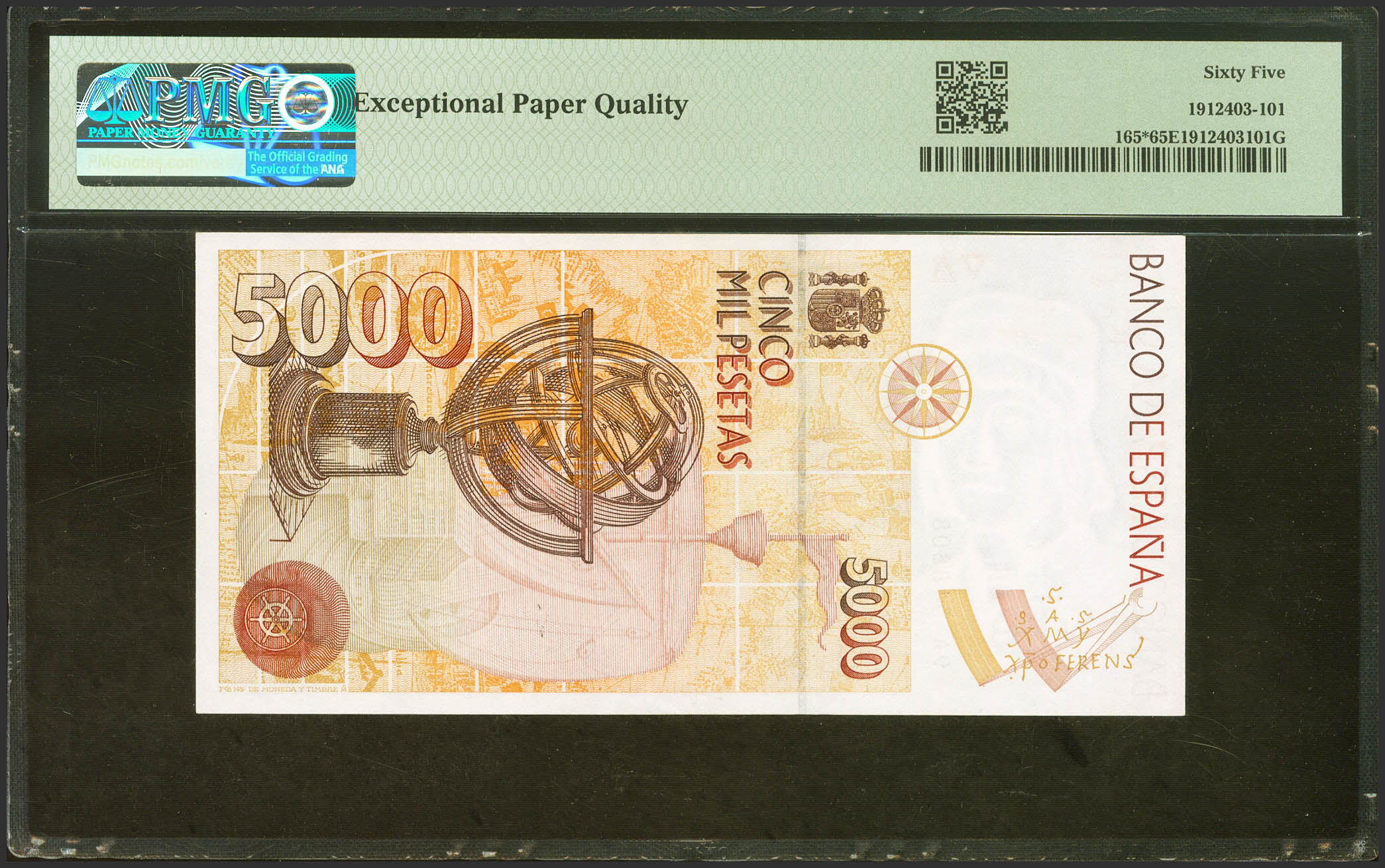 5000 Pesetas. 12 de Octubre de 1992. Serie especial 9A. (Edifil 2023: 484b, Pick: 165*). Inusual en esta excepcional calidad. SC. Encapsulado PMG65EPQ.