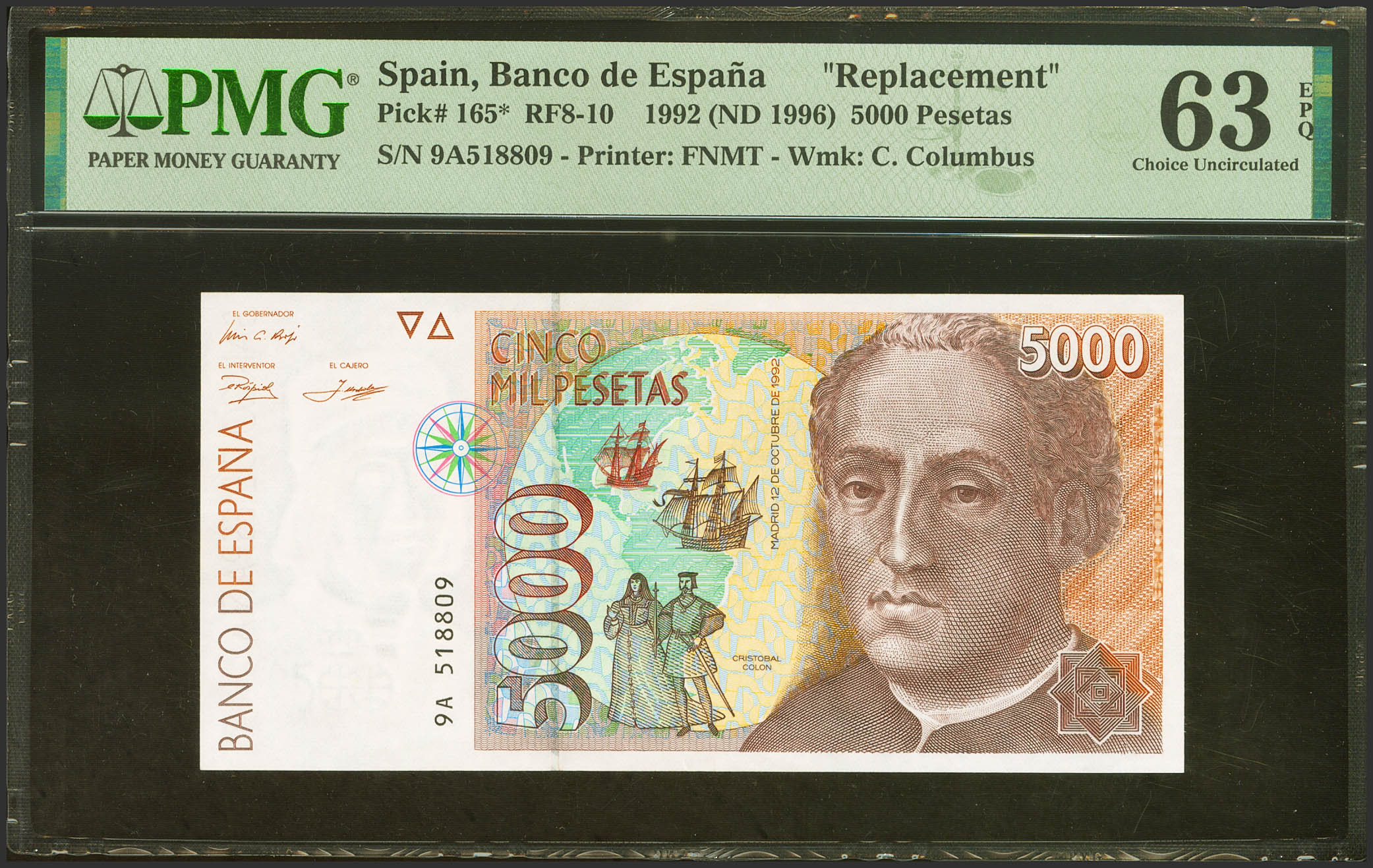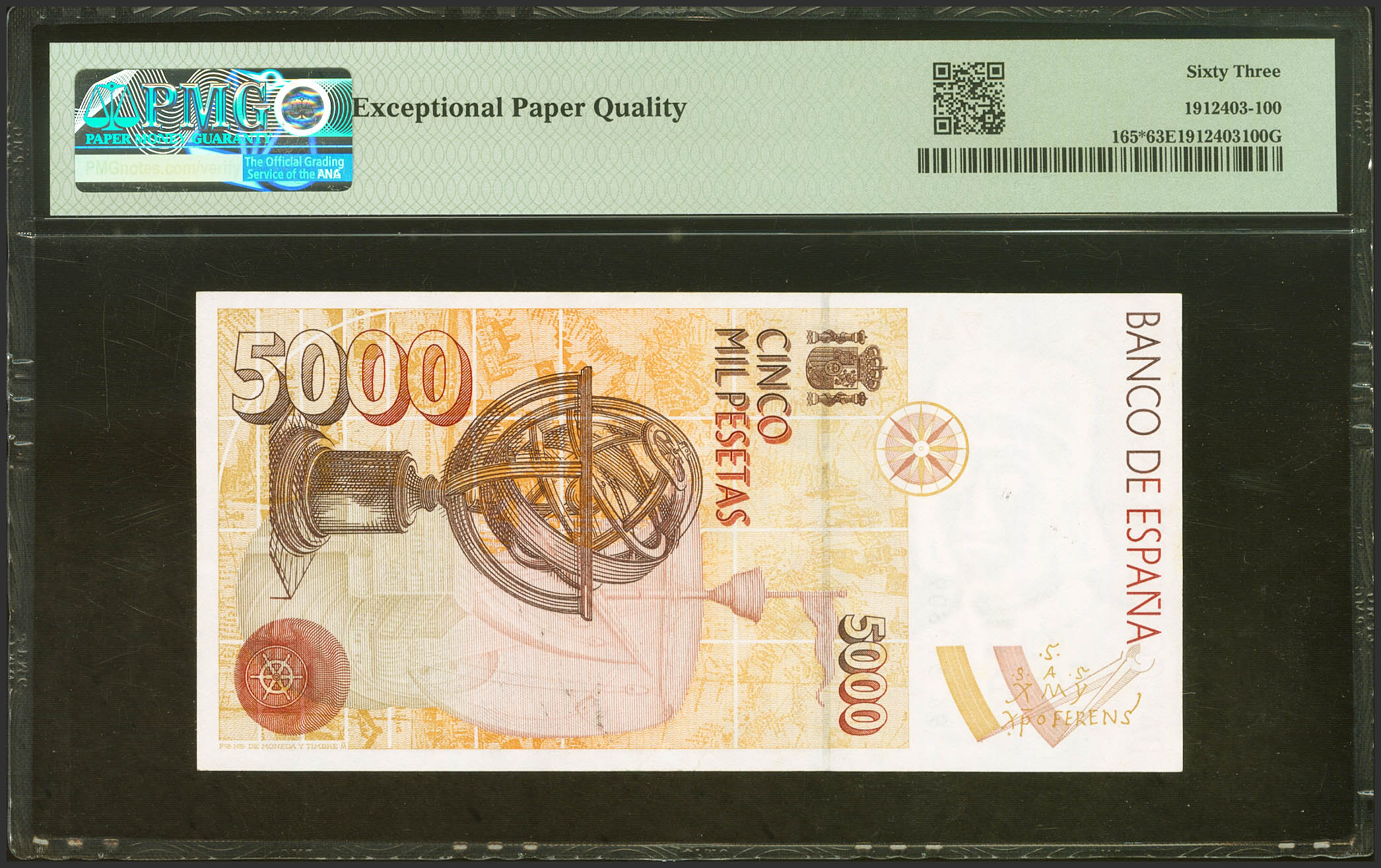 5000 Pesetas. 12 de Octubre de 1992. Serie especial 9A. (Edifil 2023: 484b, Pick: 165*). SC. Encapsulado PMG63EPQ.