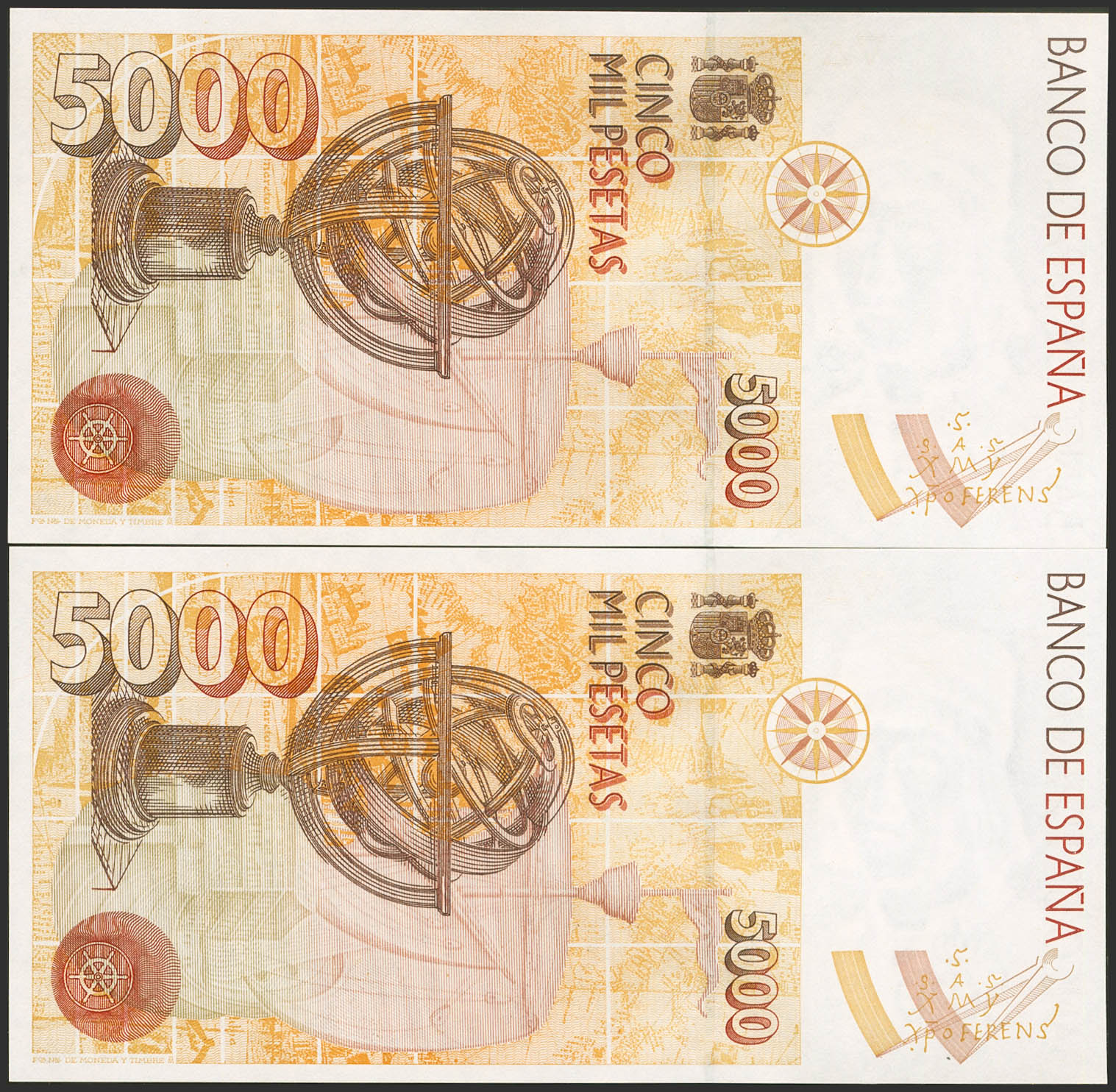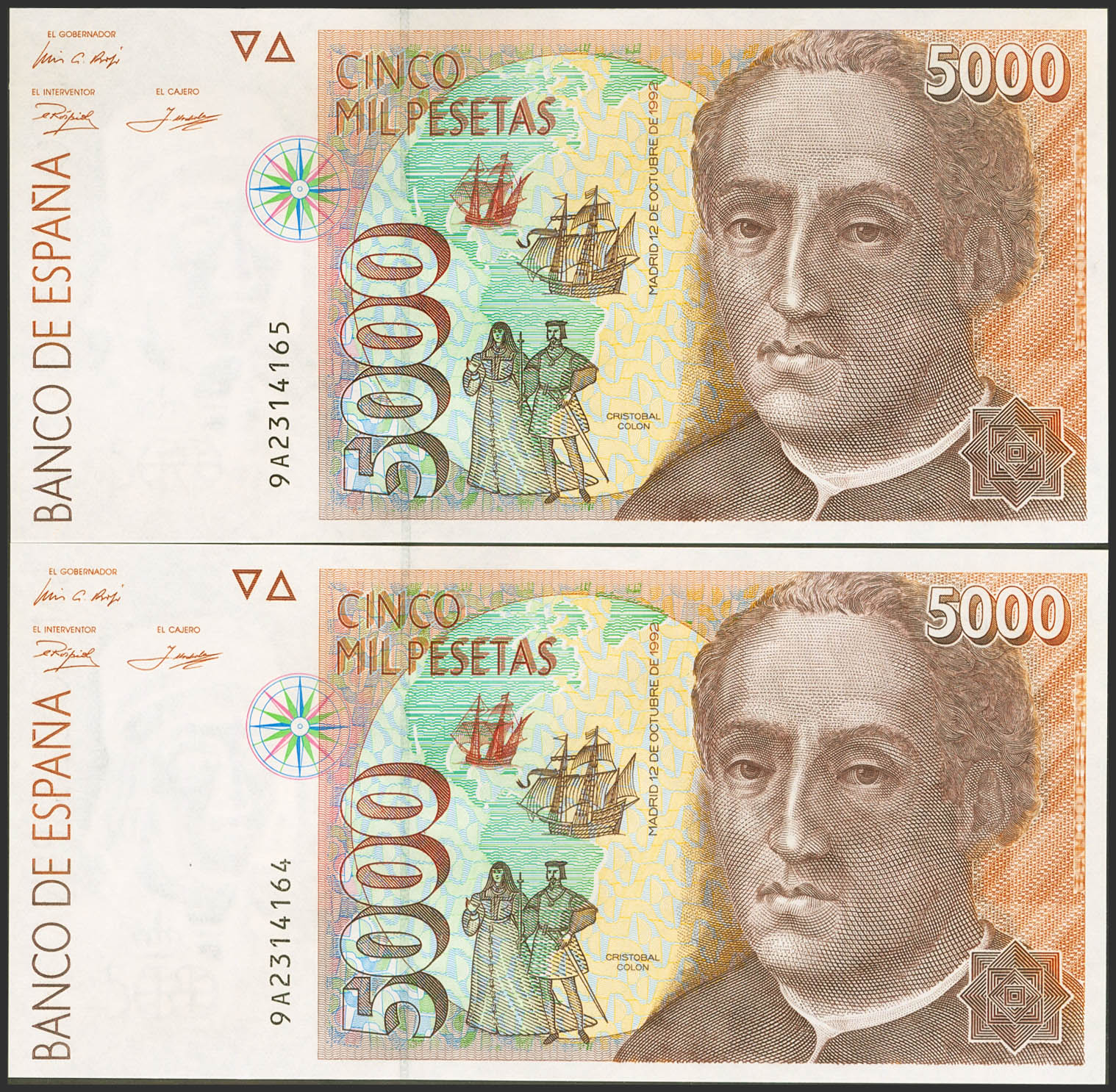 5000 Pesetas. 12 de Octubre de 1992. Pareja correlativa. Serie especial 9A. (Edifil 2021: 484b). SC.