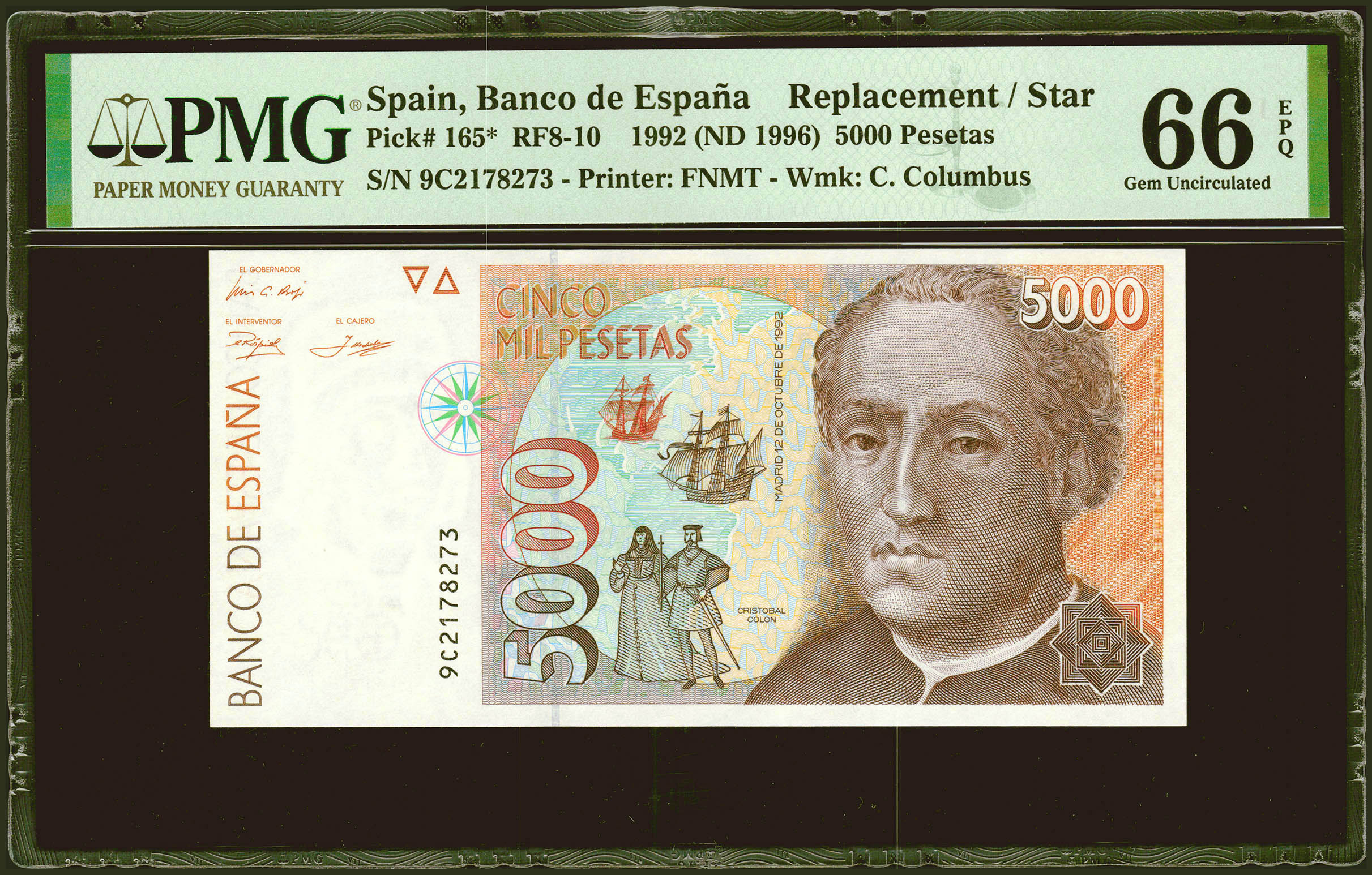 5000 Pesetas. 12 de Octubre de 1992. Serie especial 9C. (Edifil 2021: 484b, Pick: 165*). Raro en esta excepcional calidad. SC. Encapsulado PMG66EPQ.