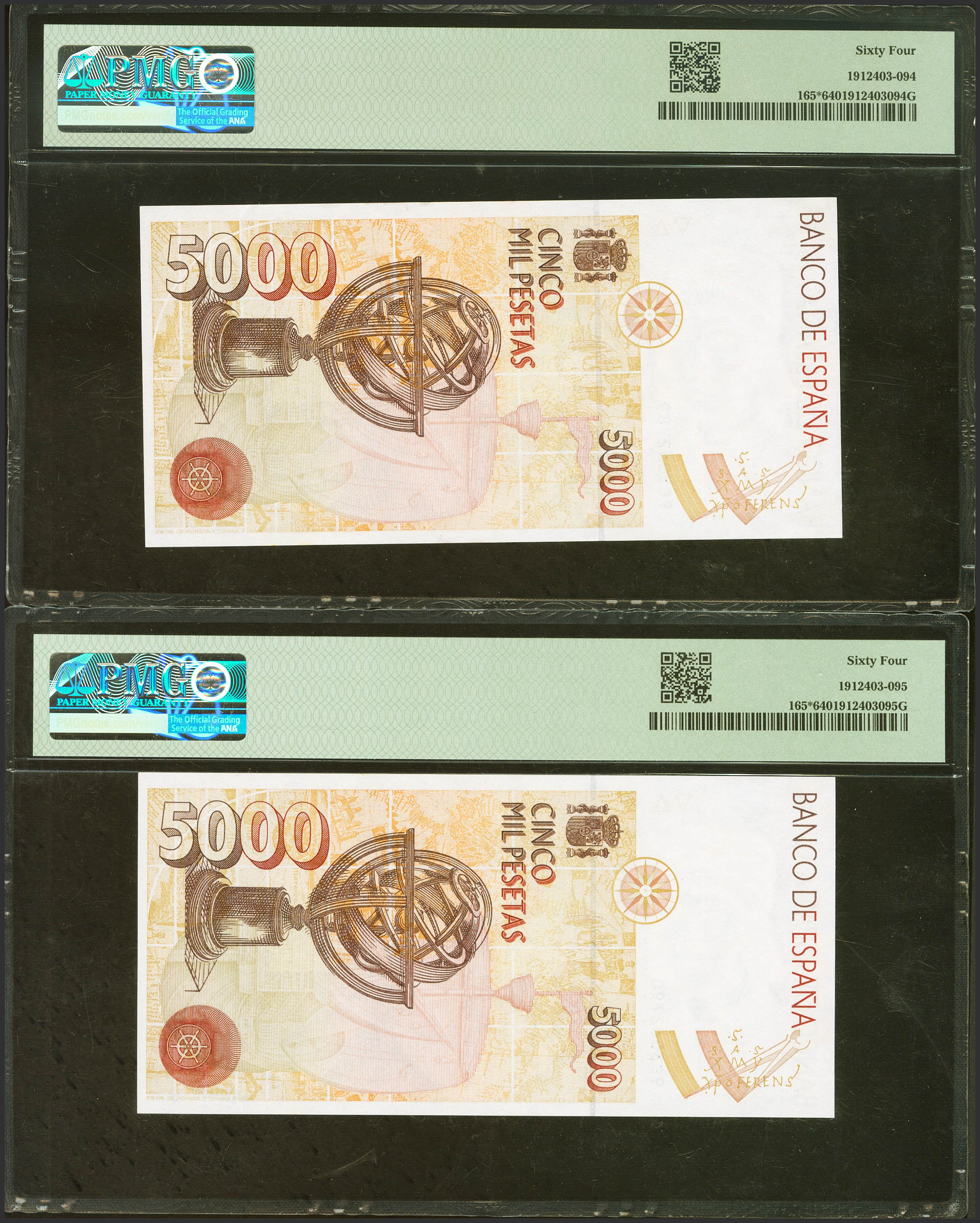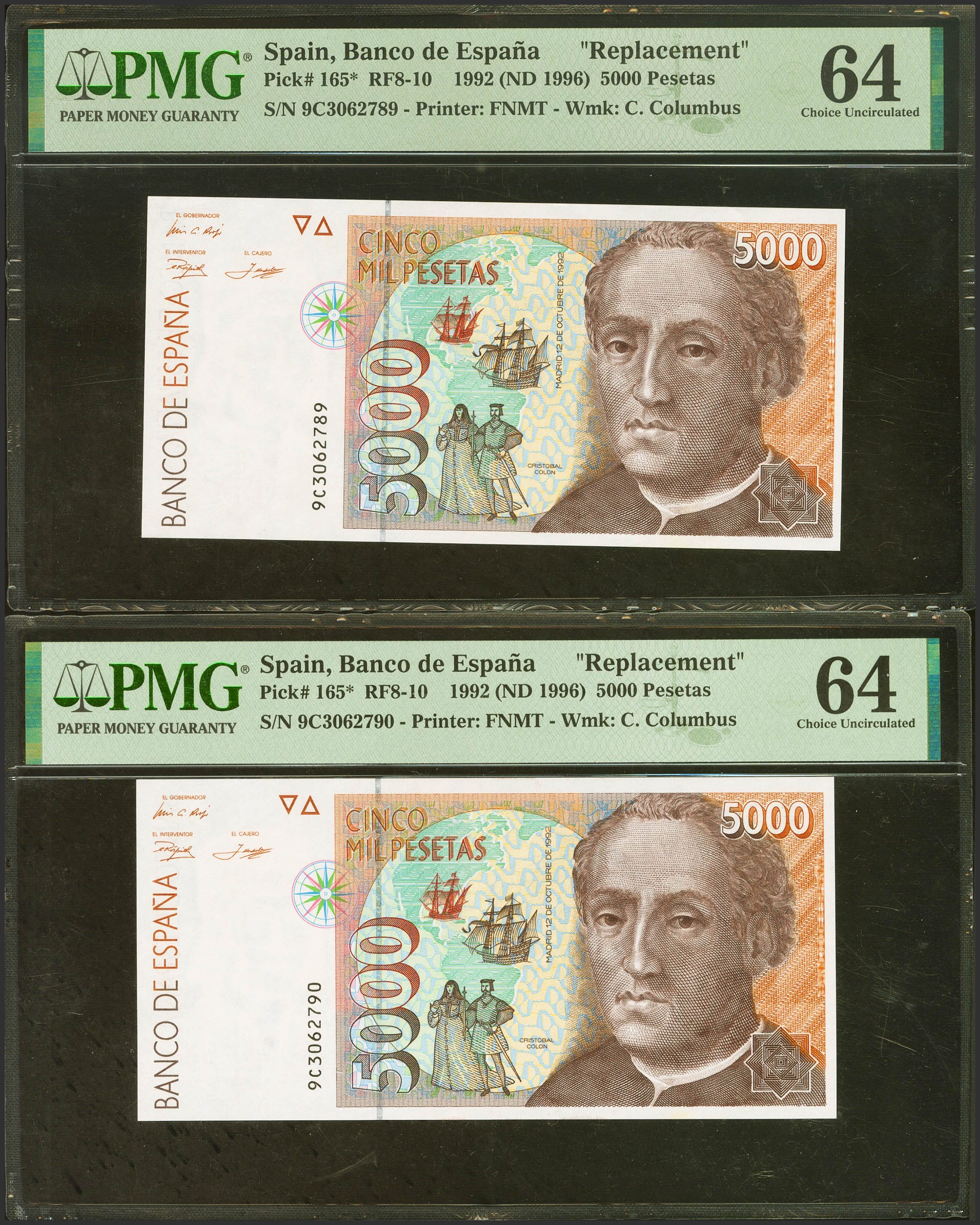 5000 Pesetas. 12 de Octubre de 1992. Pareja correlativa. Serie especial 9C. (Edifil 2023: 484b, Pick: 165*). SC. Encapsulados PMG64, ambos.