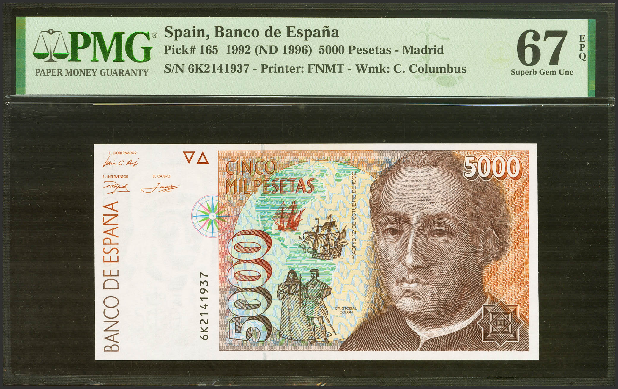 5000 Pesetas. 12 de Octubre de 1992. Serie 6K, última serie emitida. (Edifil 2023: 484aa, Pick: 165). Muy rara serie. SC. Encapsulado PMG67EPQ.