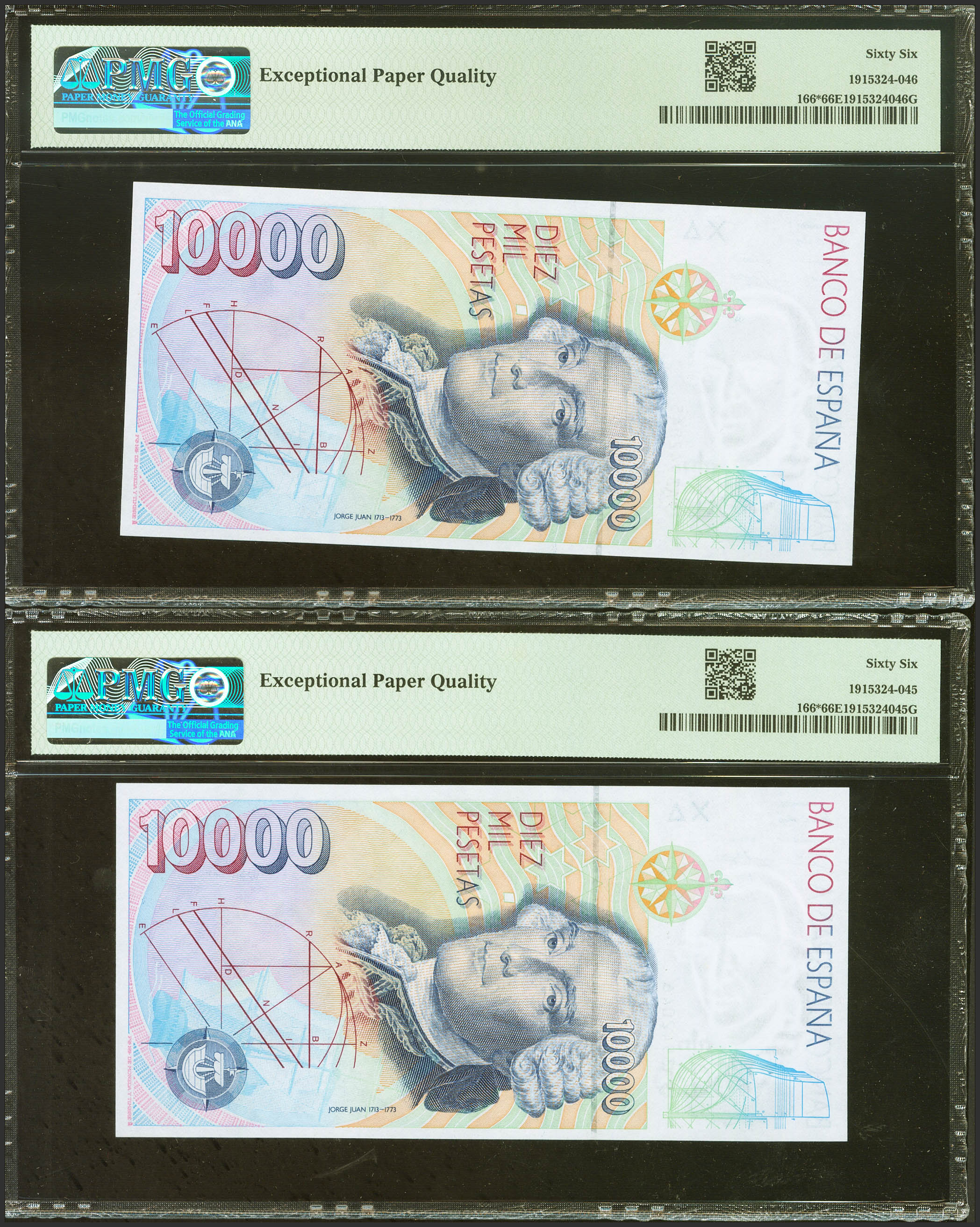 10000 Pesetas. 12 de Octubre de 1992. Pareja correlativa. Serie especial 9A. (Edifil 2023: 485b, Pick: 166*). Rara en esta excepcional calidad. SC. Encapsulados PMG66EPQ, ambos.